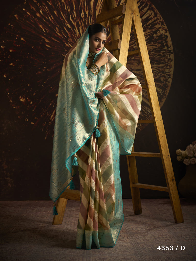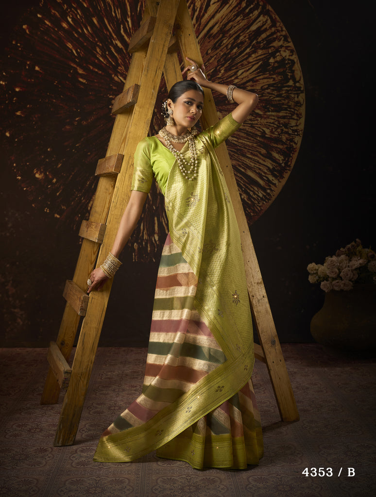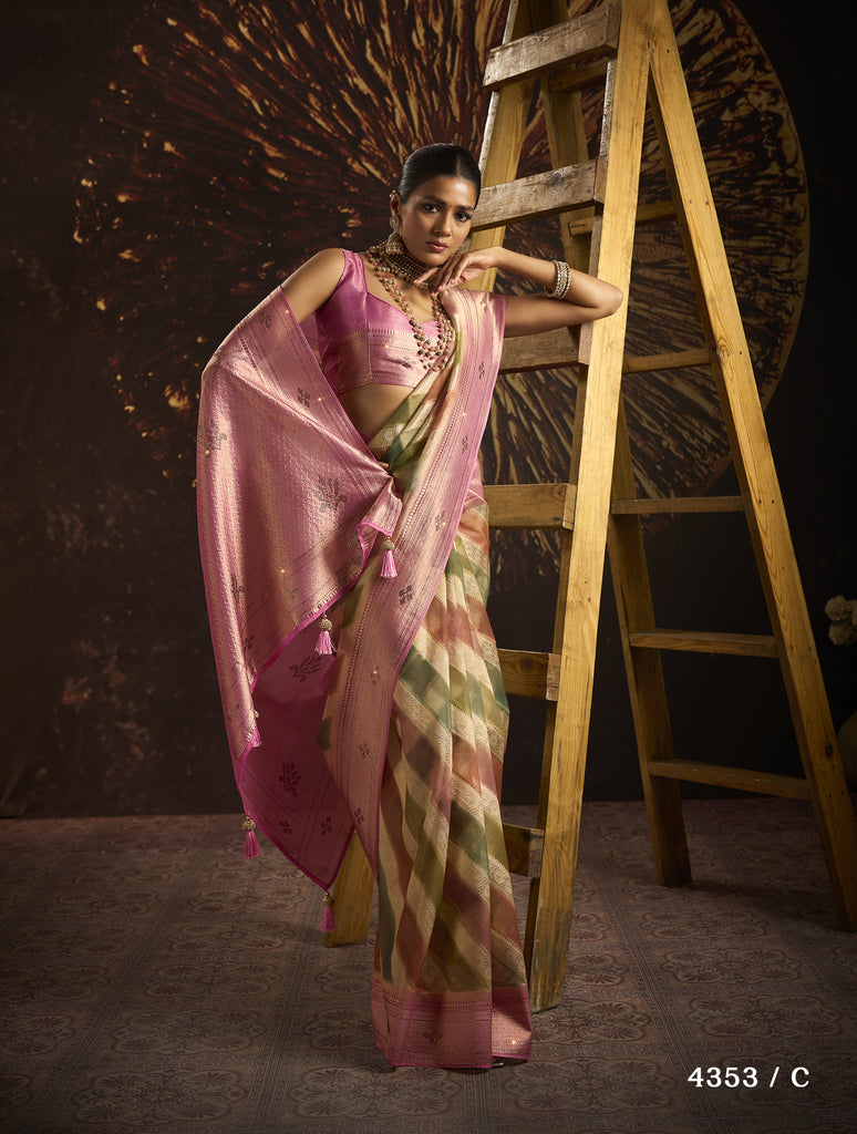 "Banarasi Luxe Charm" evokes the timeless elegance of Banarasi silk sarees, renowned for their intricate craftsmanship and luxurious textures. These sarees often feature opulent silk fabric, delicate motifs inspired by Mughal and Persian art, and shimmering zari work in gold or silver. They symbolize heritage, grace, and the enduring legacy of Indian artistry