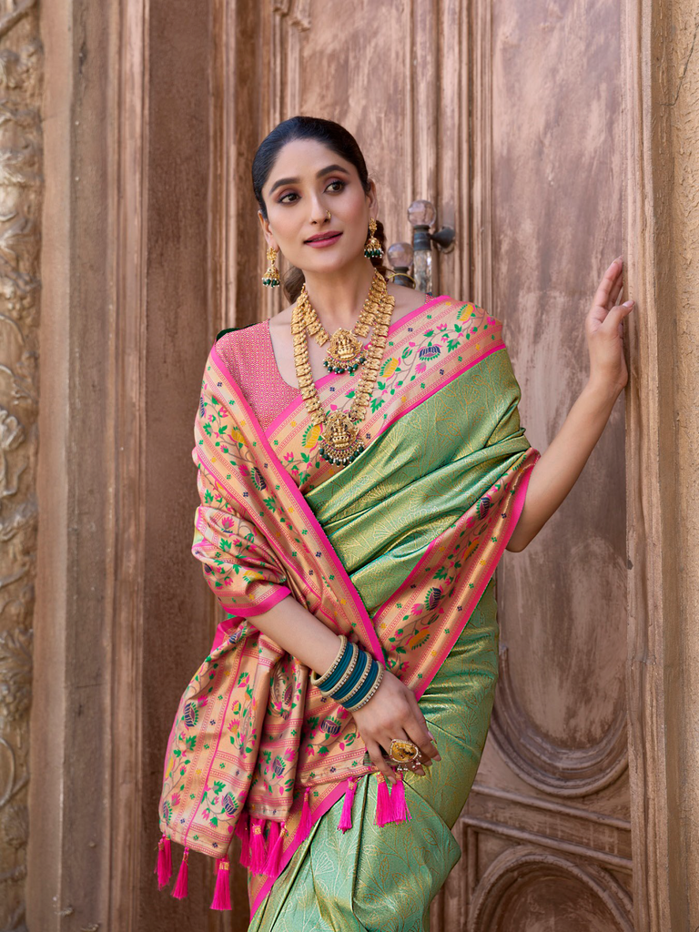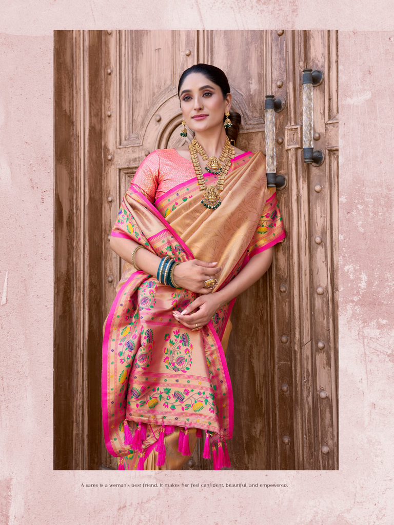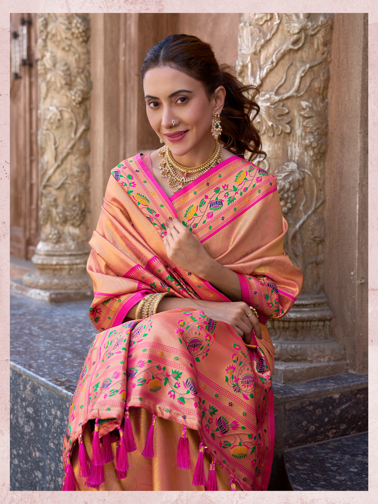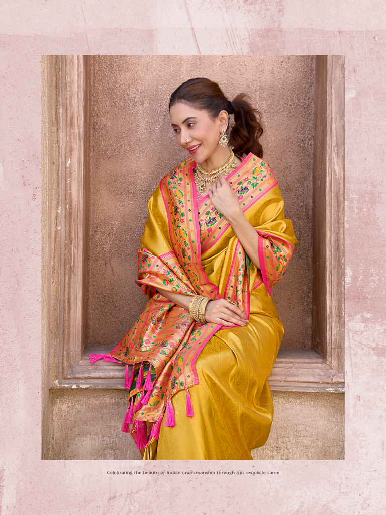 The "Kalanjali Paithani" saree is a celebration of timeless tradition and artistry. It features intricate zari work, vibrant colors, and luxurious silk fabric, making it a perfect blend of elegance and cultural heritage. This saree is ideal for weddings, festive occasions, or any event where you want to exude grace and sophistication. Its craftsmanship reflects the rich legacy of Indian handloom weaving, ensuring that every piece is unique and exquisite.