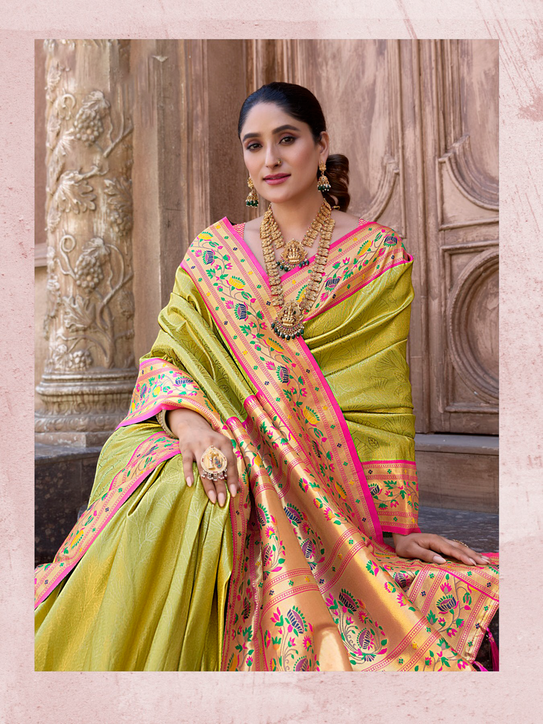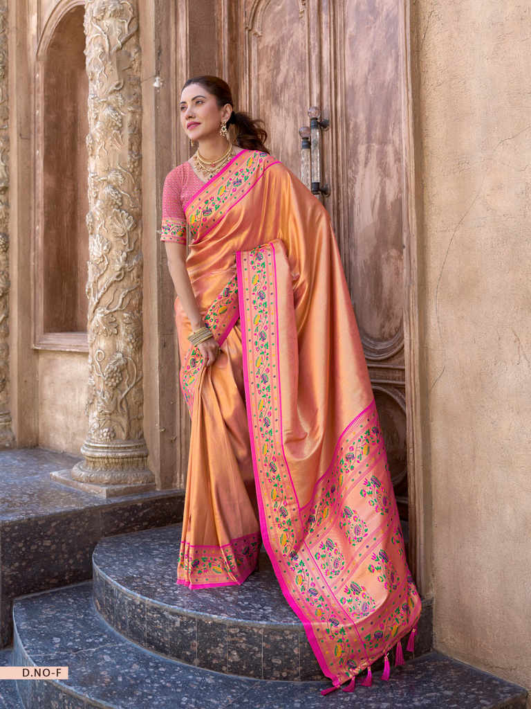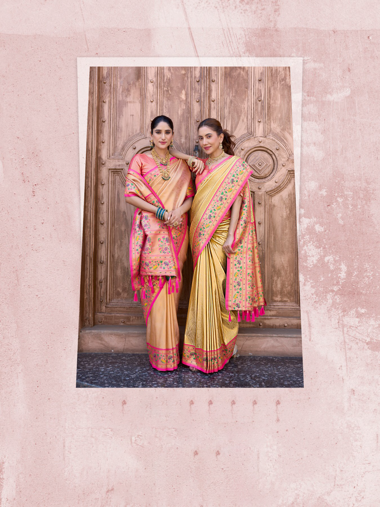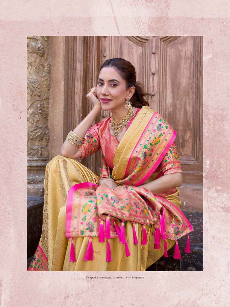 The "Kalanjali Paithani" saree is a celebration of timeless tradition and artistry. It features intricate zari work, vibrant colors, and luxurious silk fabric, making it a perfect blend of elegance and cultural heritage. This saree is ideal for weddings, festive occasions, or any event where you want to exude grace and sophistication. Its craftsmanship reflects the rich legacy of Indian handloom weaving, ensuring that every piece is unique and exquisite.