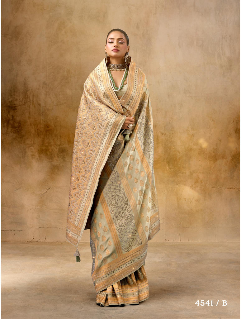 Indulge in elegance and luxury with our katan bridal saree. Perfect for the modern bride, the smooth and lustrous fabric will drape beautifully on your special day. Impeccably crafted for a flawless look, make a statement with our sophisticated saree.