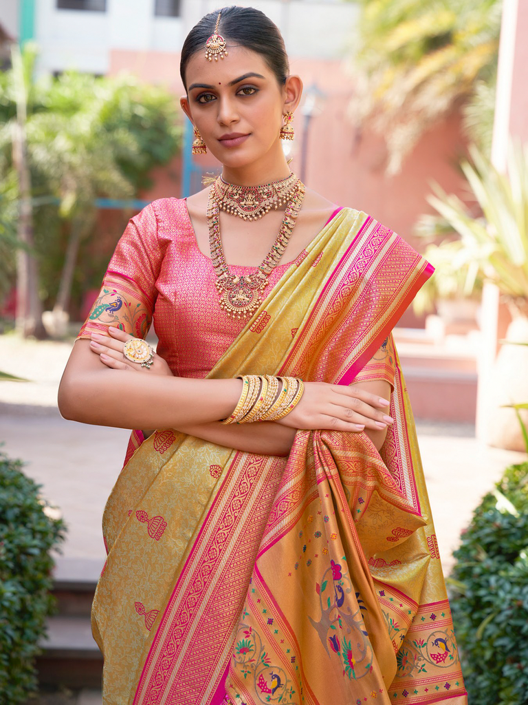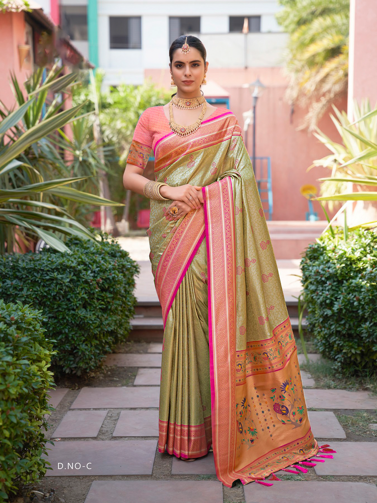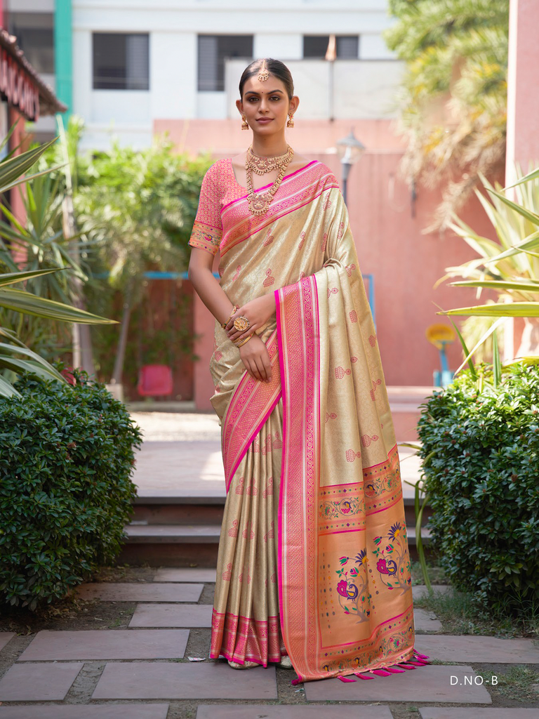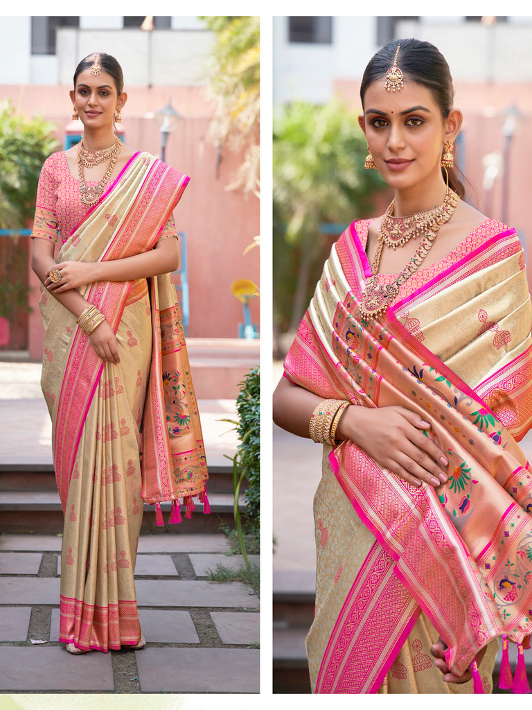 Mahalaxmi Paithani Elegance showcases the timeless artistry of traditional Indian craftsmanship. This authentic Paithani silk features intricate zari work and distinctive peacock motifs, meticulously handwoven by skilled artisans. Each piece represents centuries of heritage, making it an heirloom-quality investment for special occasions and cultural celebrations.