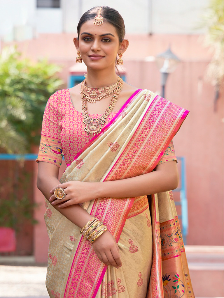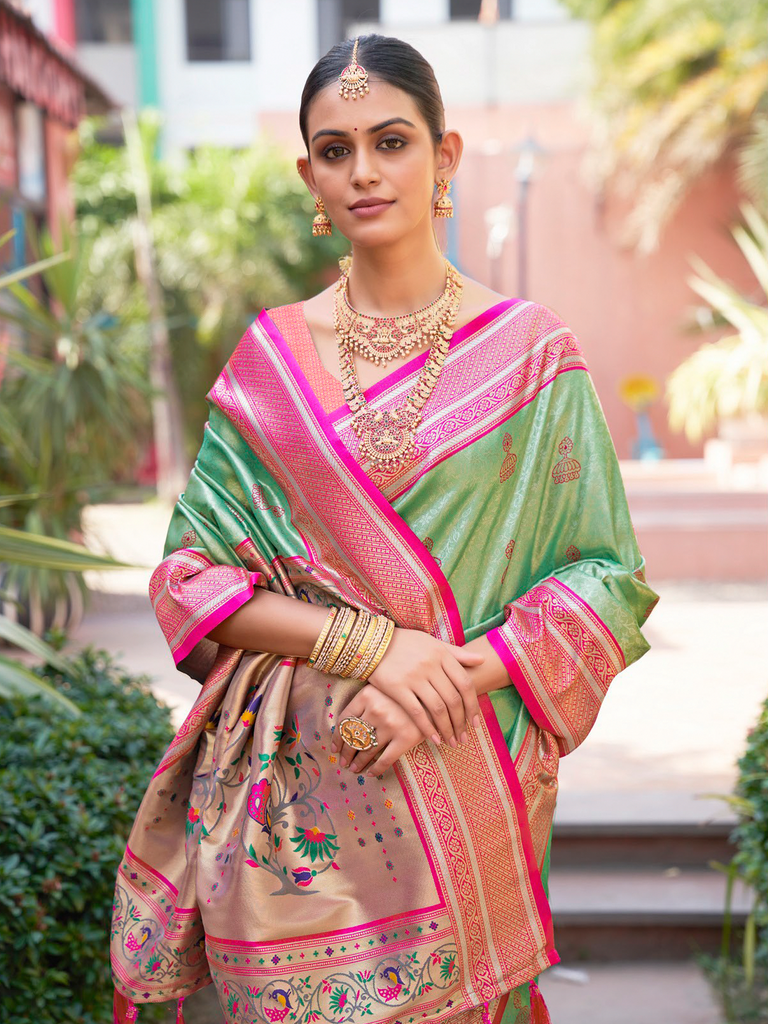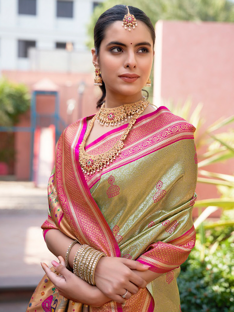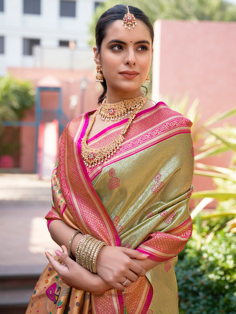 Mahalaxmi Paithani Elegance showcases the timeless artistry of traditional Indian craftsmanship. This authentic Paithani silk features intricate zari work and distinctive peacock motifs, meticulously handwoven by skilled artisans. Each piece represents centuries of heritage, making it an heirloom-quality investment for special occasions and cultural celebrations.
