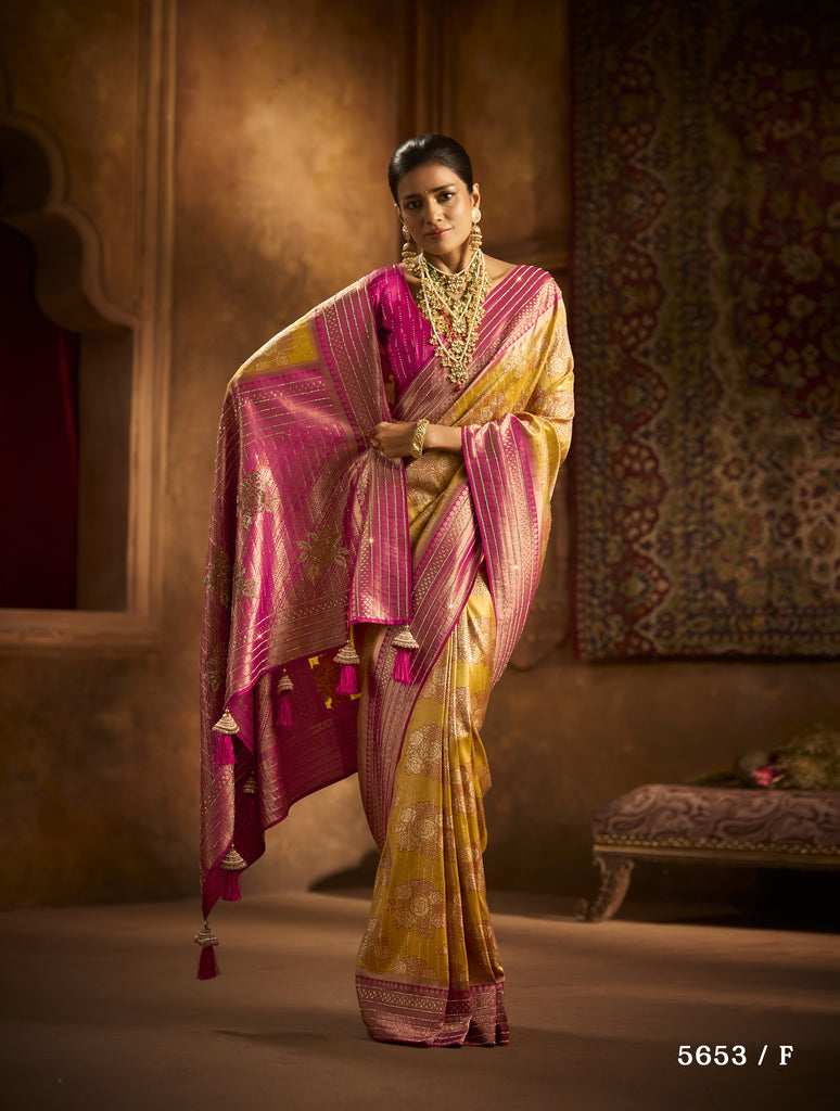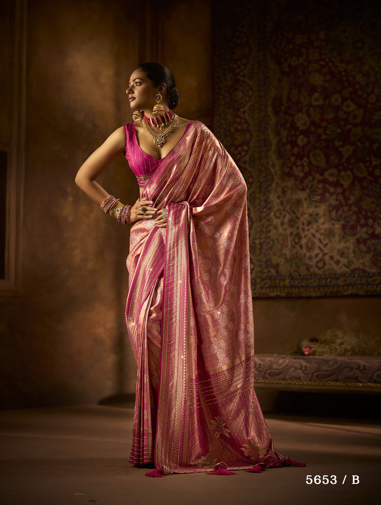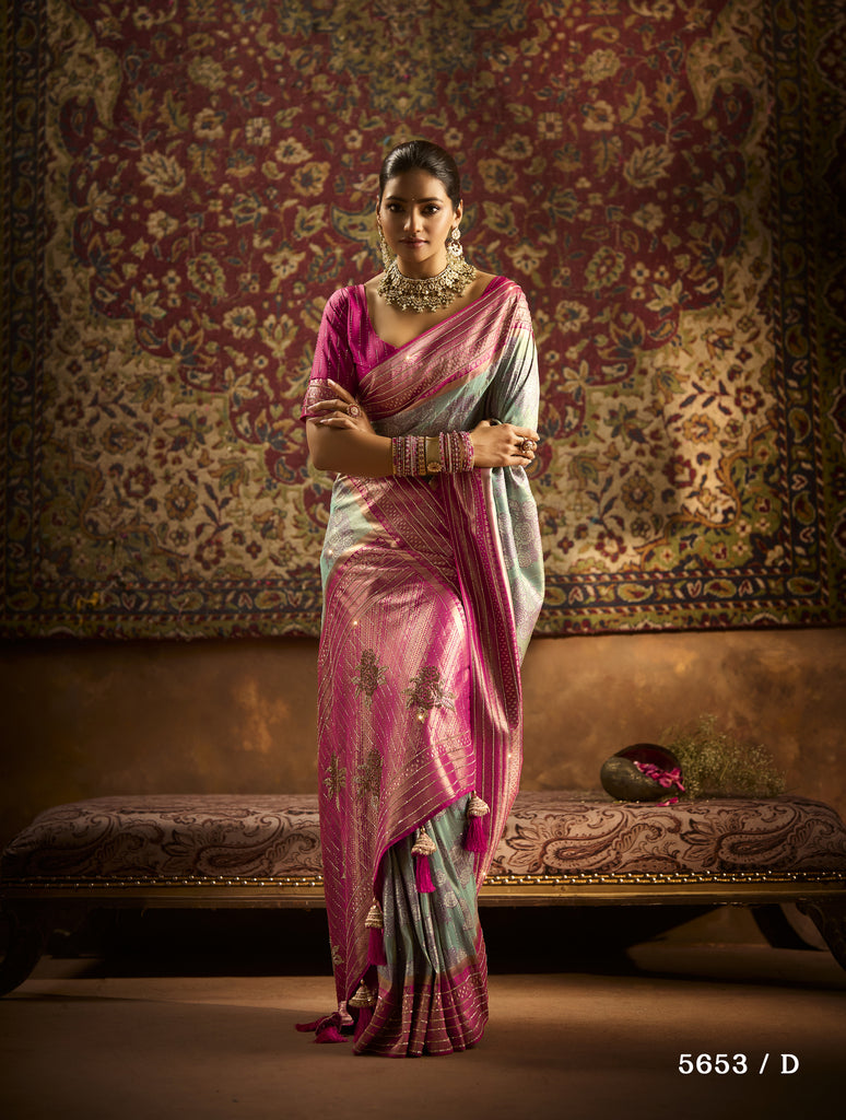 The "Timeless Bridal Treasure" saree is a masterpiece of elegance and tradition. Crafted with luxurious satin fabric and adorned with intricate diamond work, this bridal saree exudes sophistication and charm. Its shimmering embellishments and exquisite craftsmanship make it a perfect choice for weddings, ensuring the bride looks radiant and regal on her special day. This saree is not just an outfit—it's a celebration of timeless beauty and artistry.