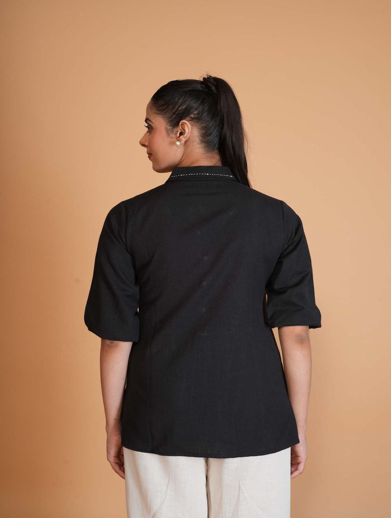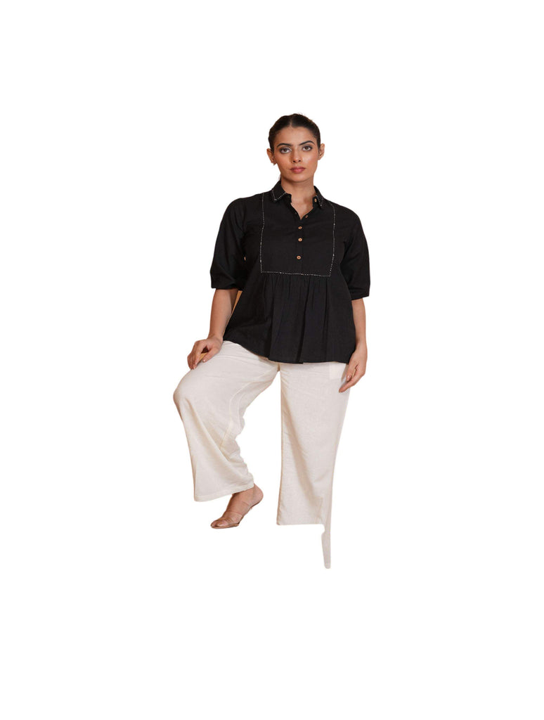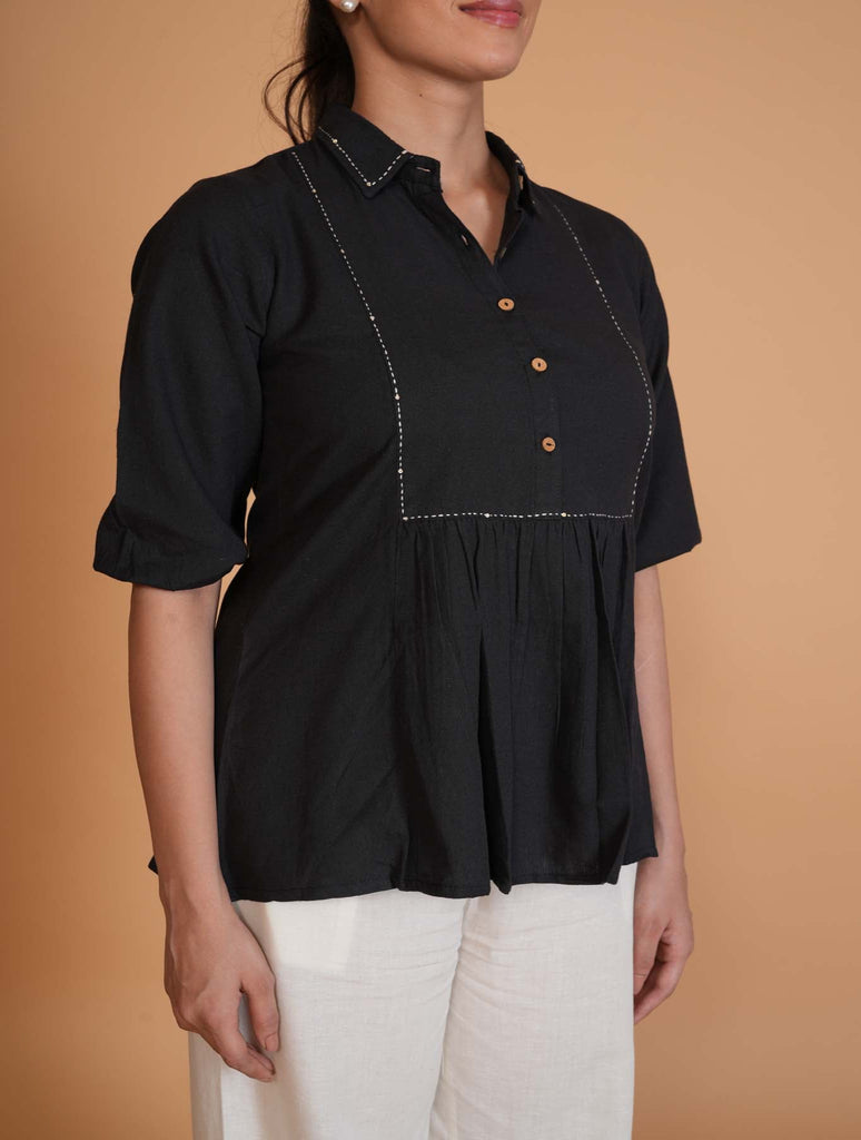 Our black A-line cotton flex tunic features a shirt collar and 3/4 sleeves, with charming yoke gathers and intricate Katha work. Perfect for casual, ethnic, or formal occasions, this stylish piece is finished with wooden buttons for a unique touch.