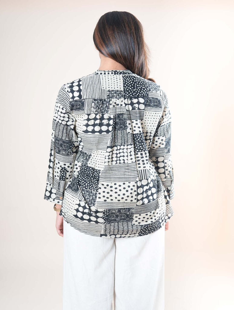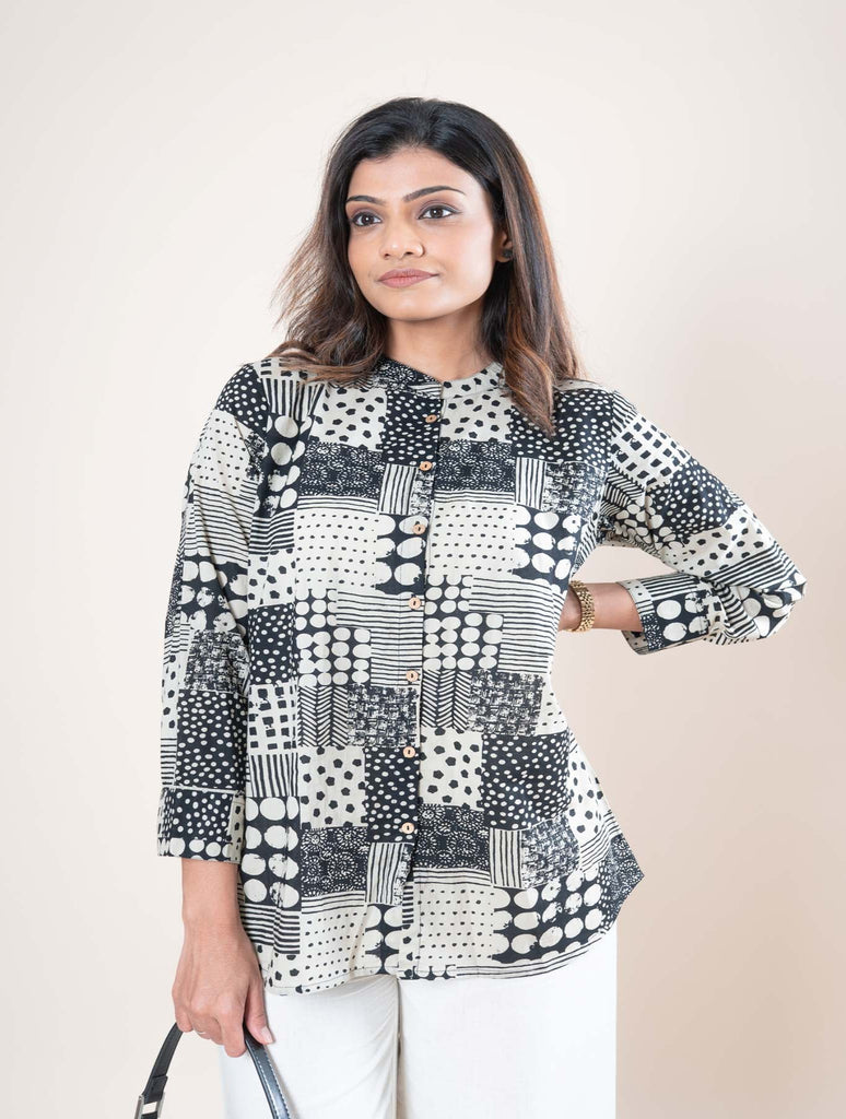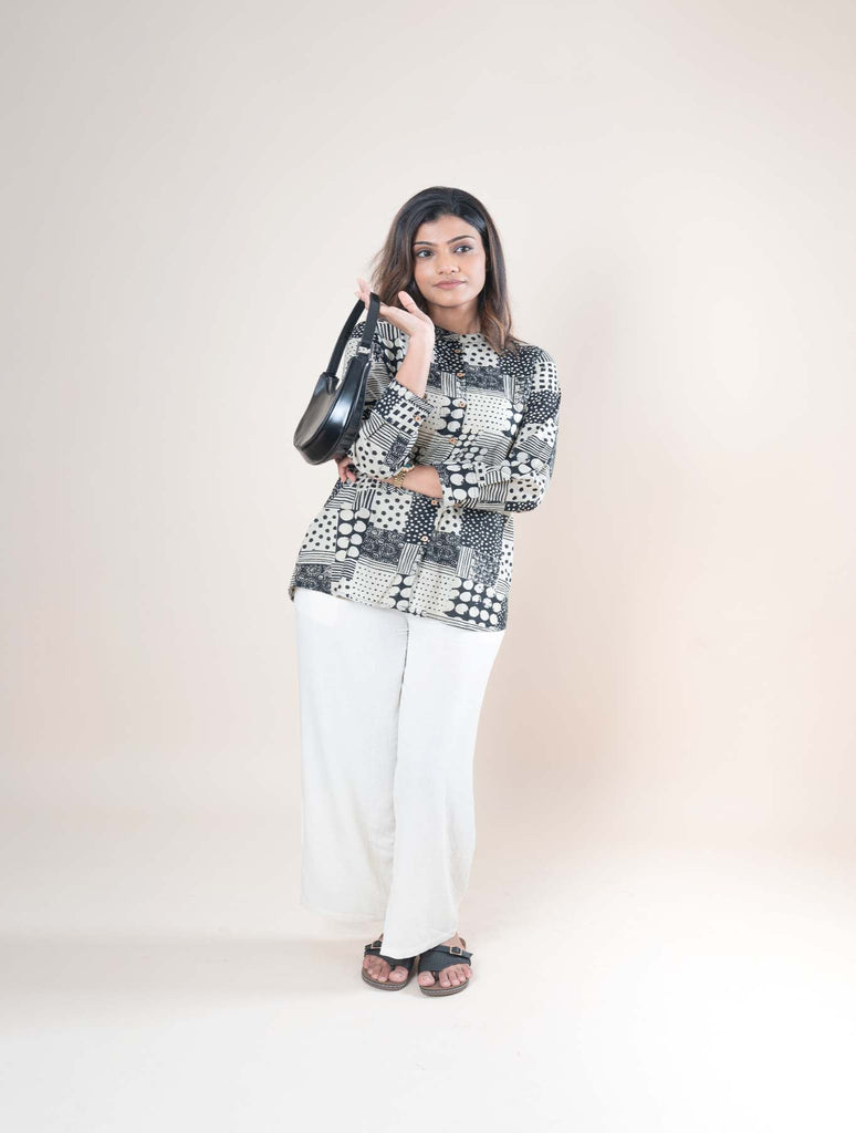 A classic A-line cotton tunic in black and ivory, featuring full sleeves with buttoned cuffs and a sleek Chinese collar. Accented with wooden buttons for a natural touch ideal for both casual and formal wear.