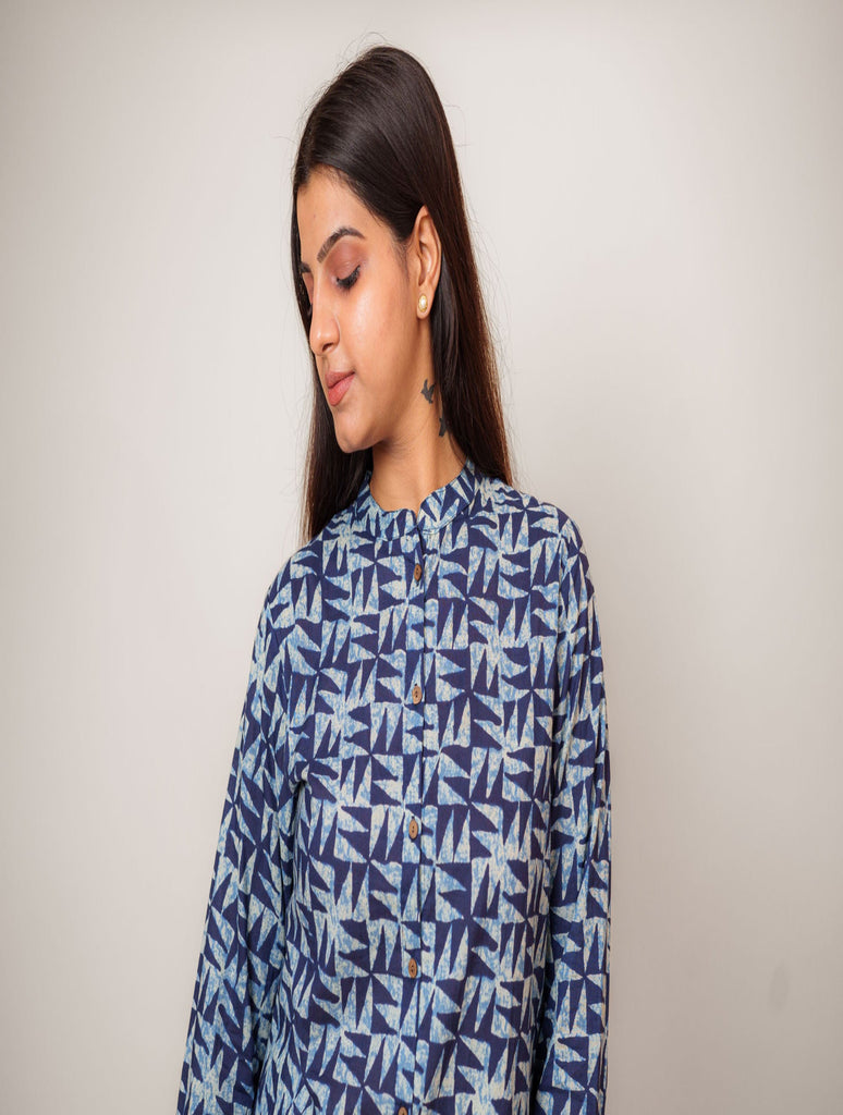 | Our Blue top comes with Chinese collar, cotton fabric for utmost comfort. Pair it with denim for a casual look.  |