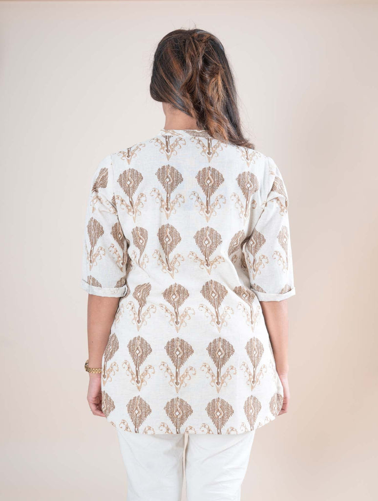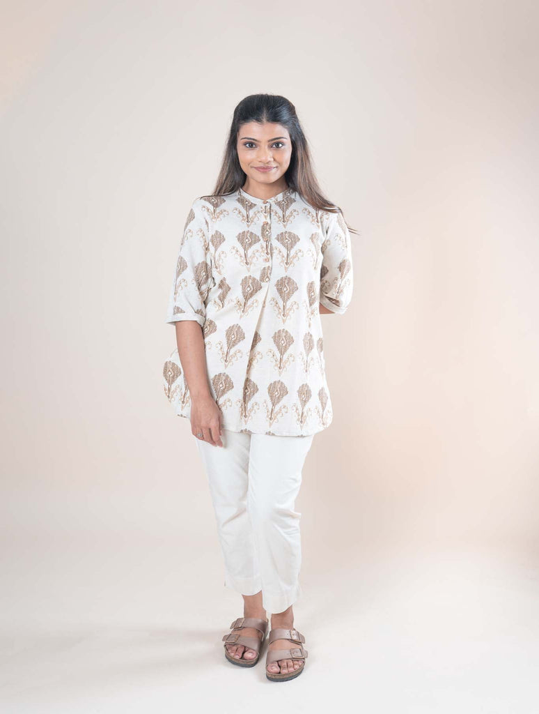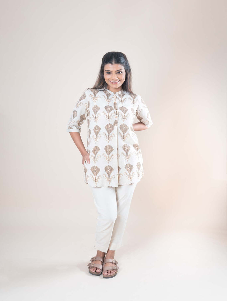 Flex Cotton Ikat print top, designed for comfort and elegance. Featuring a Chinese collar, 3/4 sleeves, and wooden buttons, this silhouette with side slits adds a refined touch to your casual, formal, or ethnic outfits.