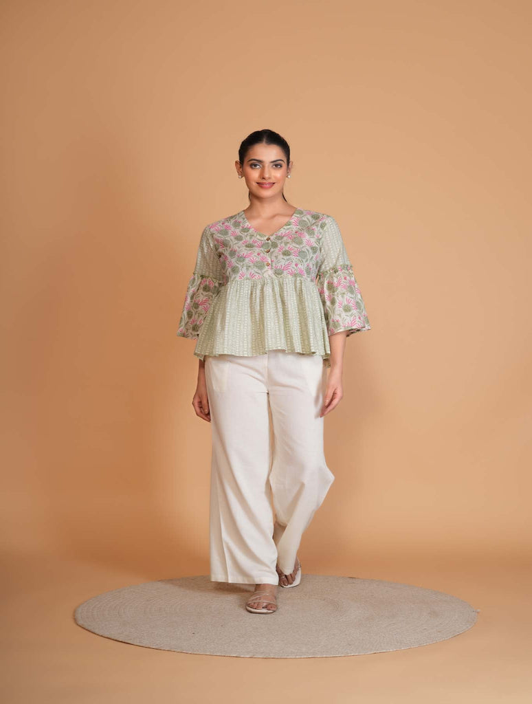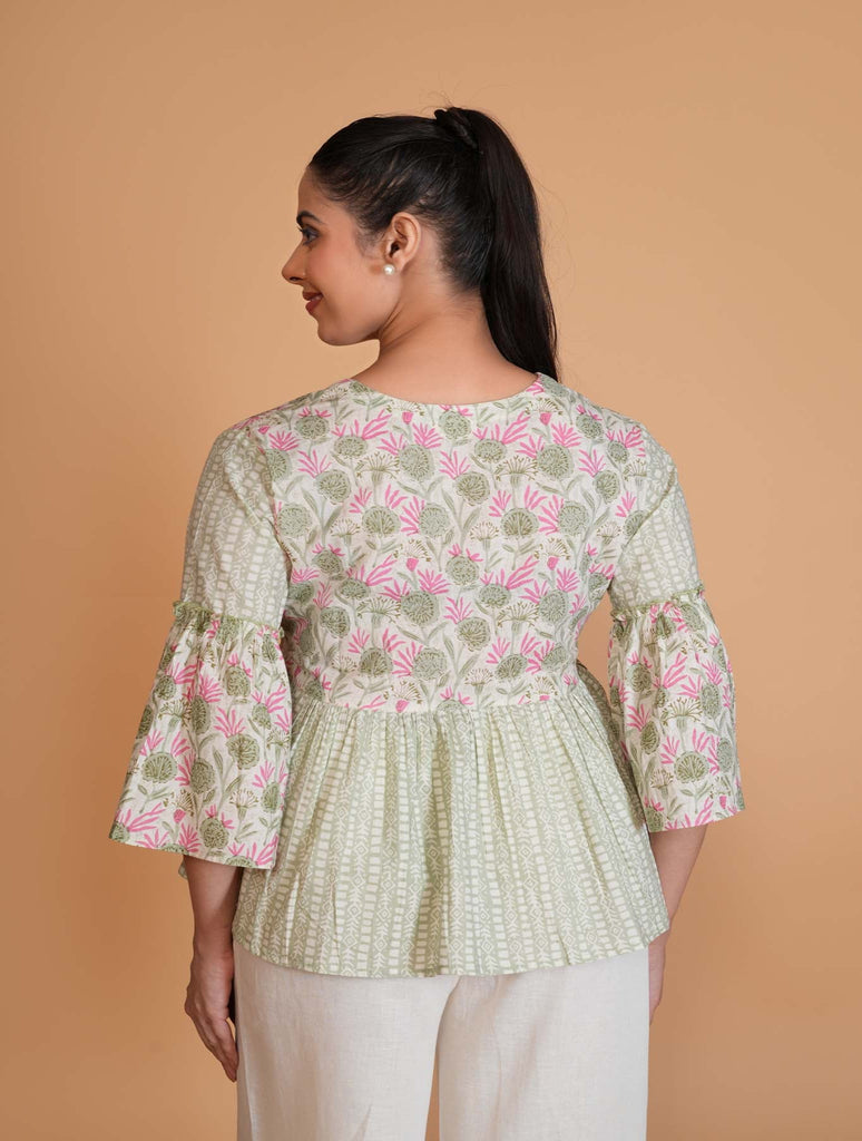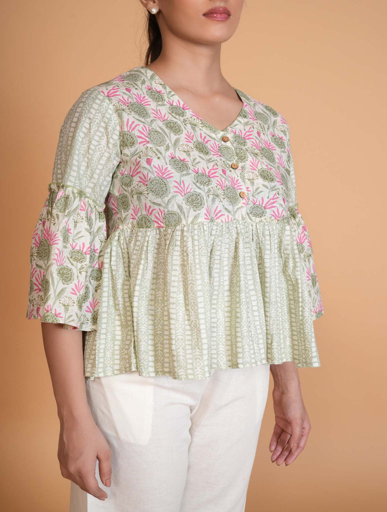Our Light Green sanganeri floral tunic features a V-neck and classic wooden buttons. The elbow-length, bell sleeves and yoke gathers add a unique touch. Perfect for casual or formal occasions, this cotton tunic is both chic and comfortable.