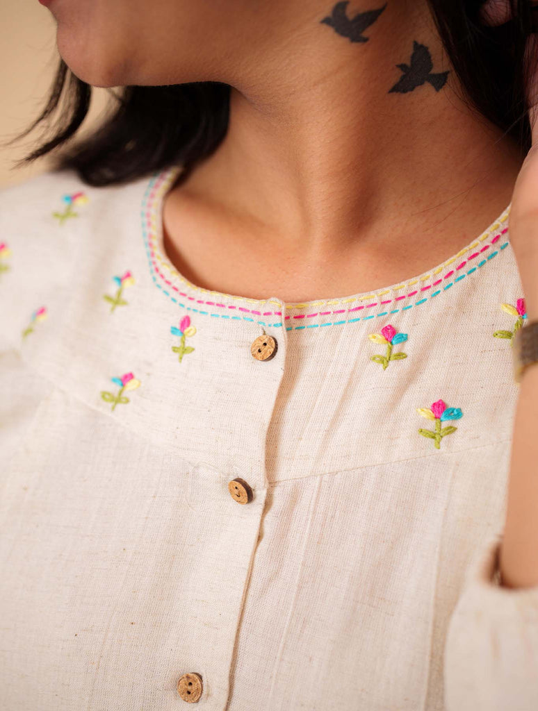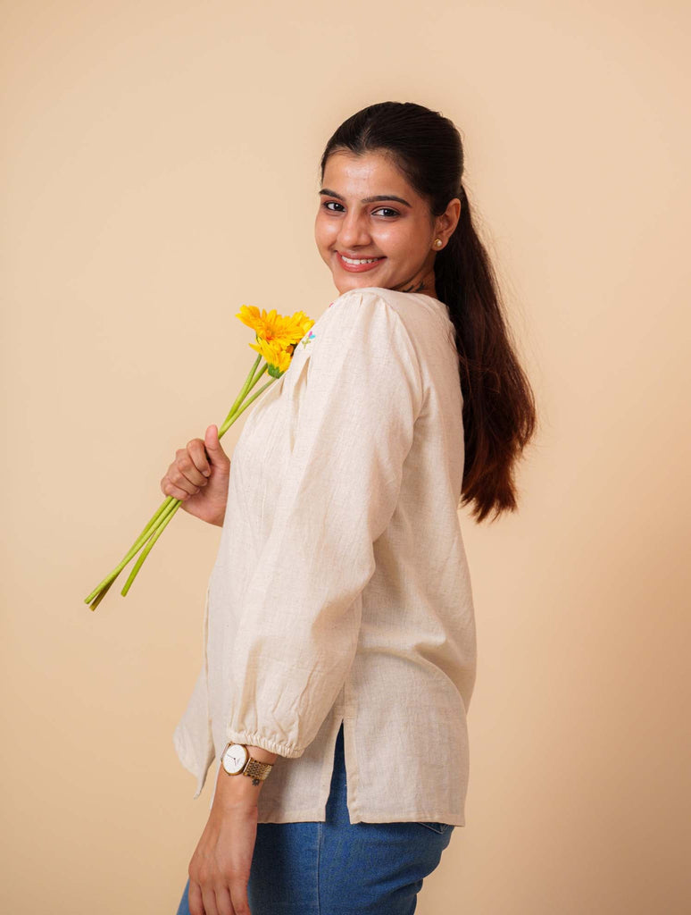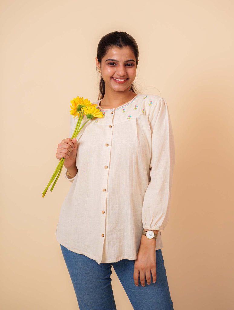 Natural Flex Cotton Hand Work Embroidered Shirt. This versatile A-line shirt features a sophisticated Round collar, 3/4 sleeves with delicate gathers, and distinctive wooden buttons. The relaxed fit and premium flex cotton fabric ensure all-day comfort, while the meticulous hand embroidery adds an artisanal touch suitable for both casual outings and formal occasions.
