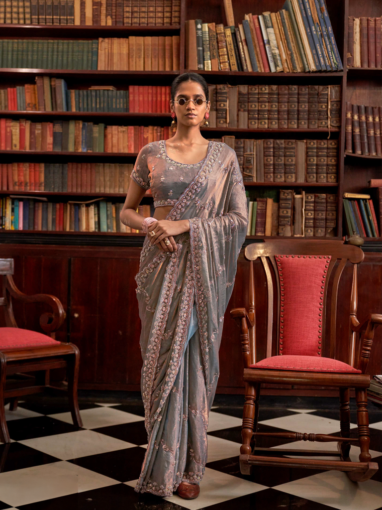 Crafted from premium Organza fabric, this saree features an expertly designed diamond work border that adds a touch of sophistication. The soft lace embroidery enhances its delicate appeal, making it an impeccable choice for elegant party wear. Combining luxurious texture with refined detailing, this saree promises both comfort and style for special occasions.