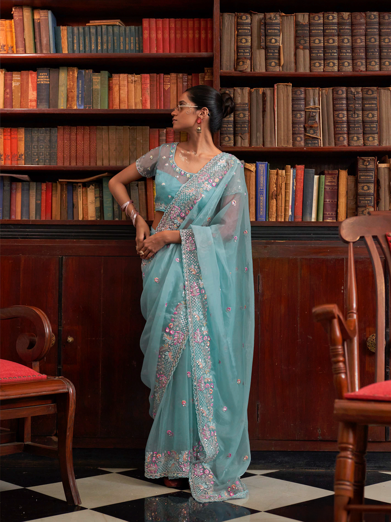 Crafted from premium Organza fabric, this saree features an expertly designed diamond work border that adds a touch of sophistication. The soft lace embroidery enhances its delicate appeal, making it an impeccable choice for elegant party wear. Combining luxurious texture with refined detailing, this saree promises both comfort and style for special occasions.