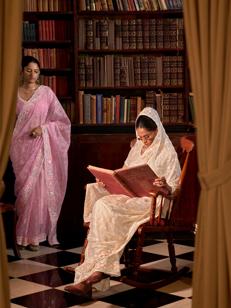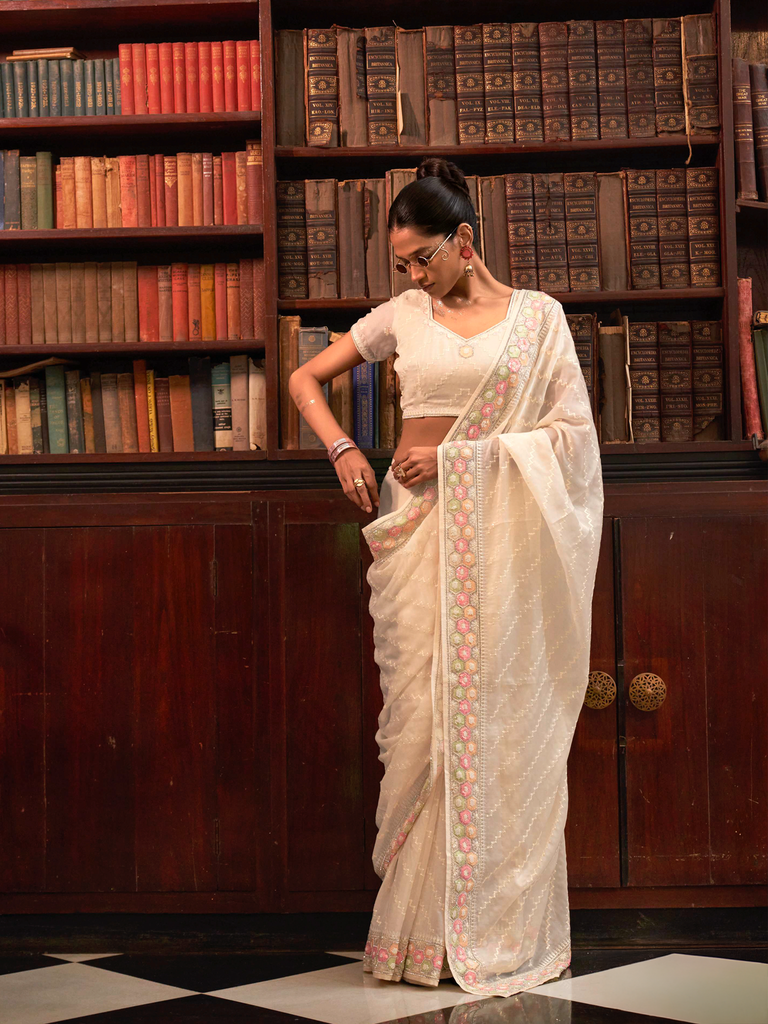 Crafted from premium Organza fabric, this saree features an expertly designed diamond work border that adds a touch of sophistication. The soft lace embroidery enhances its delicate appeal, making it an impeccable choice for elegant party wear. Combining luxurious texture with refined detailing, this saree promises both comfort and style for special occasions.