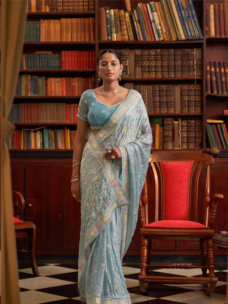 Crafted from premium Organza fabric, this saree features an expertly designed diamond work border that adds a touch of sophistication. The soft lace embroidery enhances its delicate appeal, making it an impeccable choice for elegant party wear. Combining luxurious texture with refined detailing, this saree promises both comfort and style for special occasions.