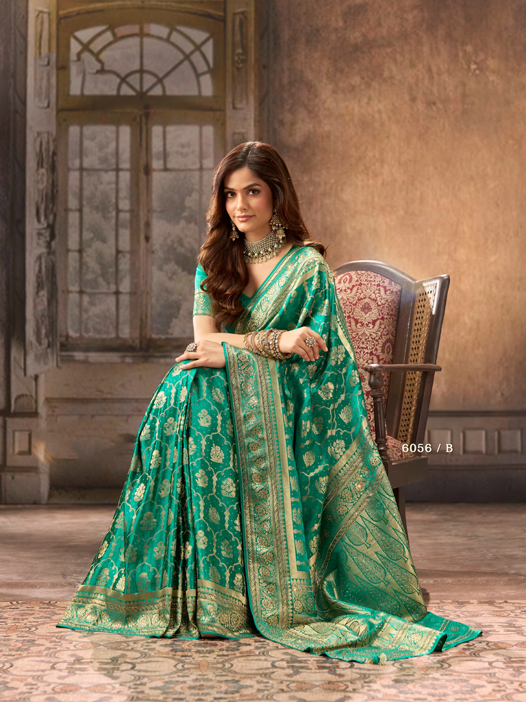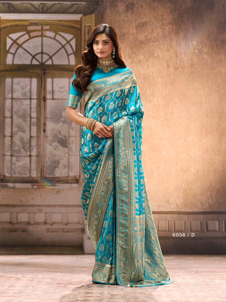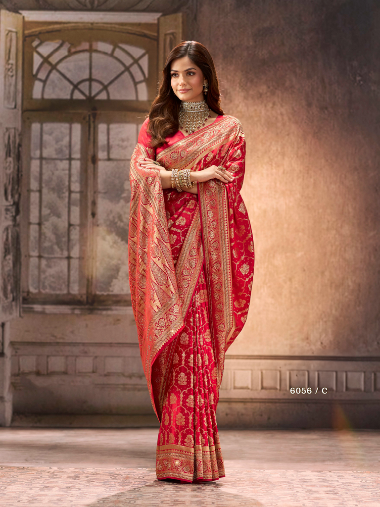 This exquisite satin ensemble showcases vibrant colors paired with intricately detailed golden zari work throughout, embodying classic festivity. The carefully coordinated embroidery enhances a cohesive and elegant aesthetic, making it an ideal choice for weddings and formal occasions where refined sophistication is essential.