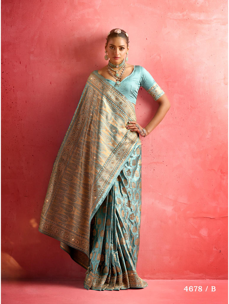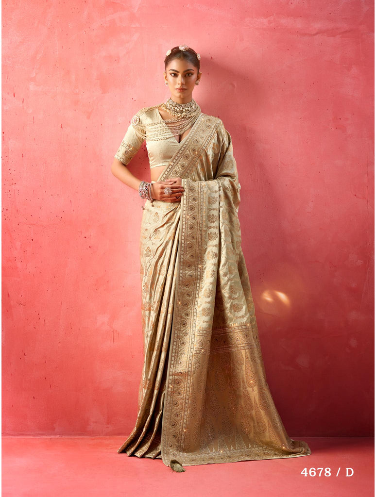 The Satin auspicious designs and traditional saree are a perfect combination of luxury and tradition. Made with high-quality materials, the saree is both elegant and comfortable. Add a touch of grace and heritage to your wardrobe with this exquisite piece.