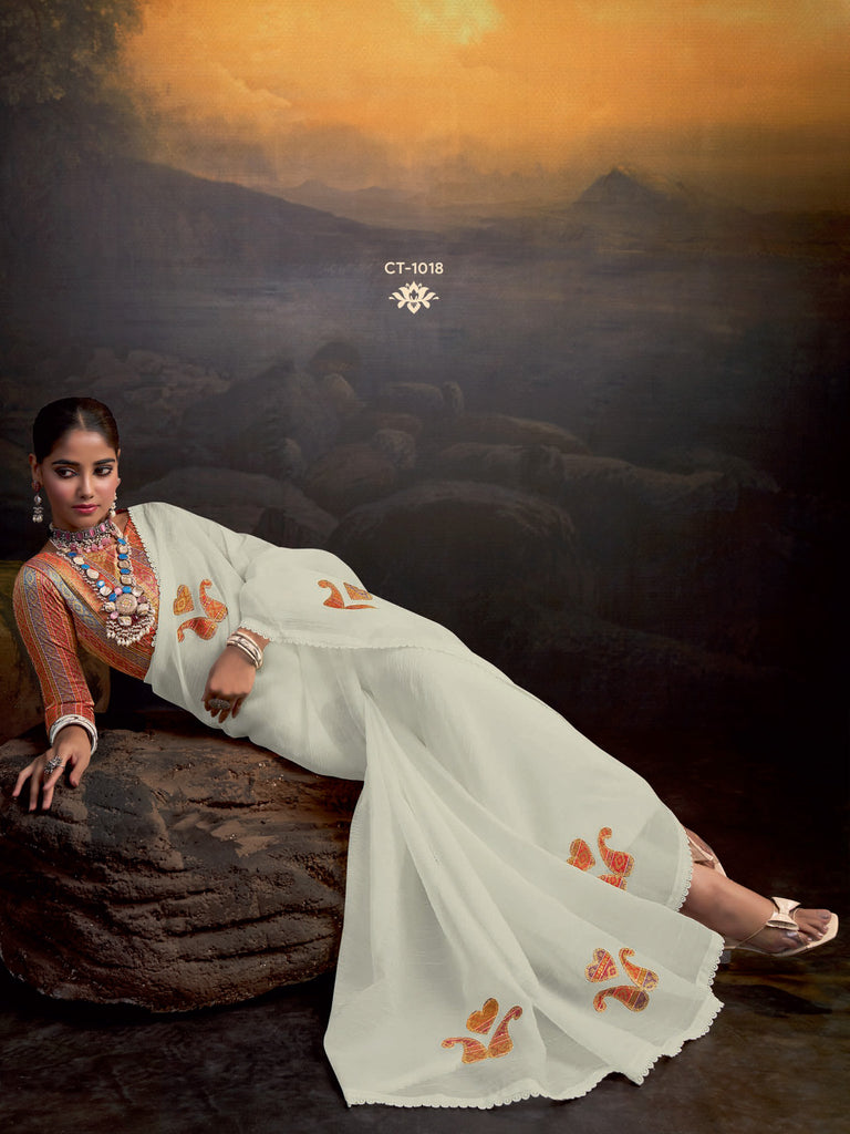 Celebrate tradition with a touch of sophistication through this exquisite organza saree, adorned with authentic Kathpadar artistry. The translucent fabric, known for its lightweight and luxurious feel, enhances the beauty of its intricate borders and motifs. The timeless patterns pay homage to cultural heritage, while the subtle shimmer of the saree lends a refined charm. Perfect for weddings, festivals, or cultural celebrations, this saree is a masterpiece of grace and tradition.