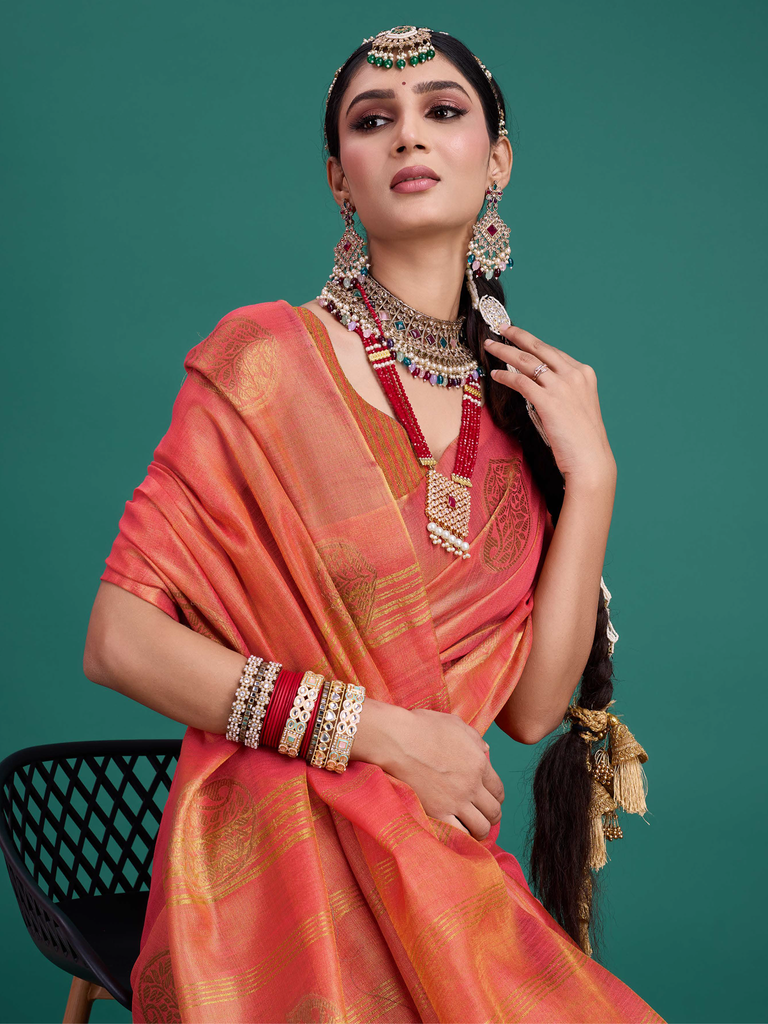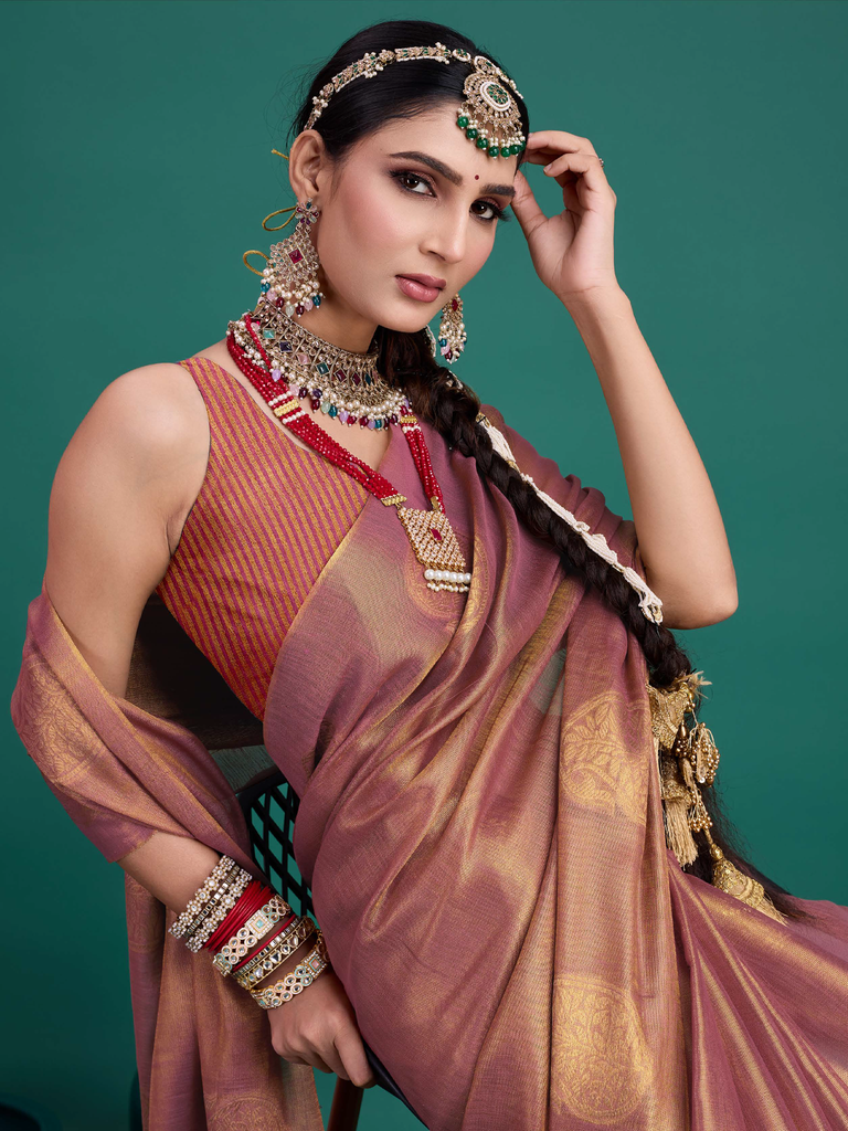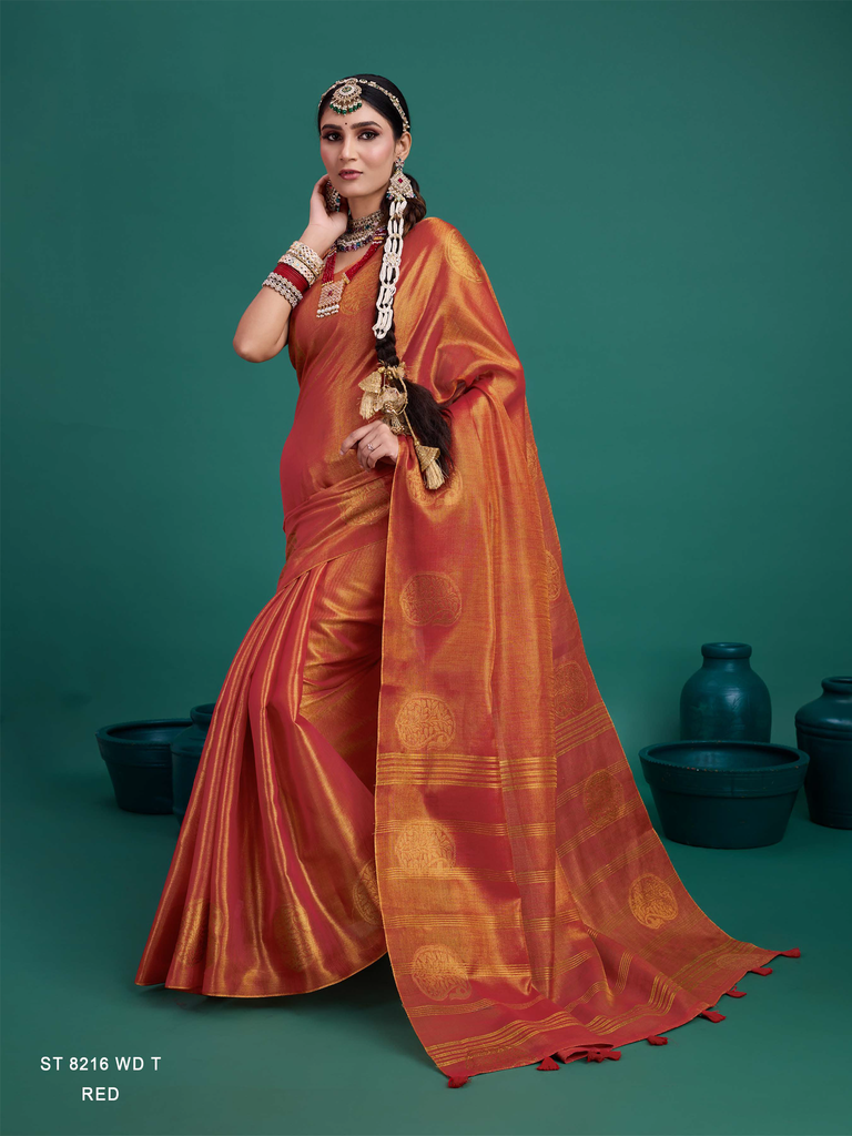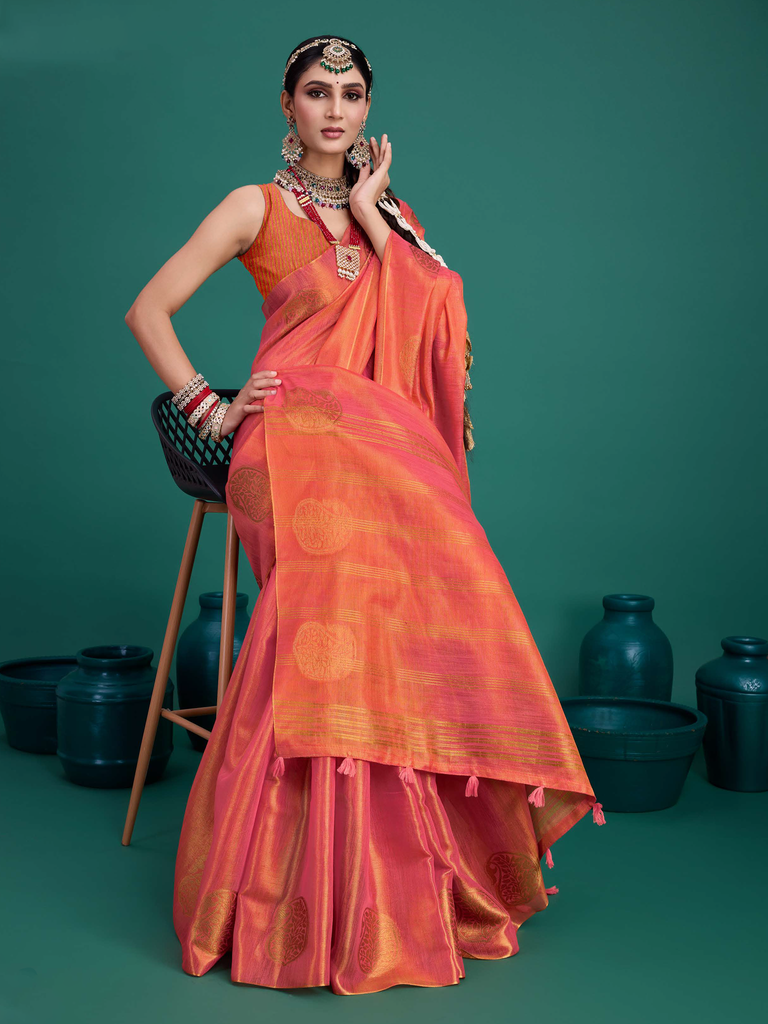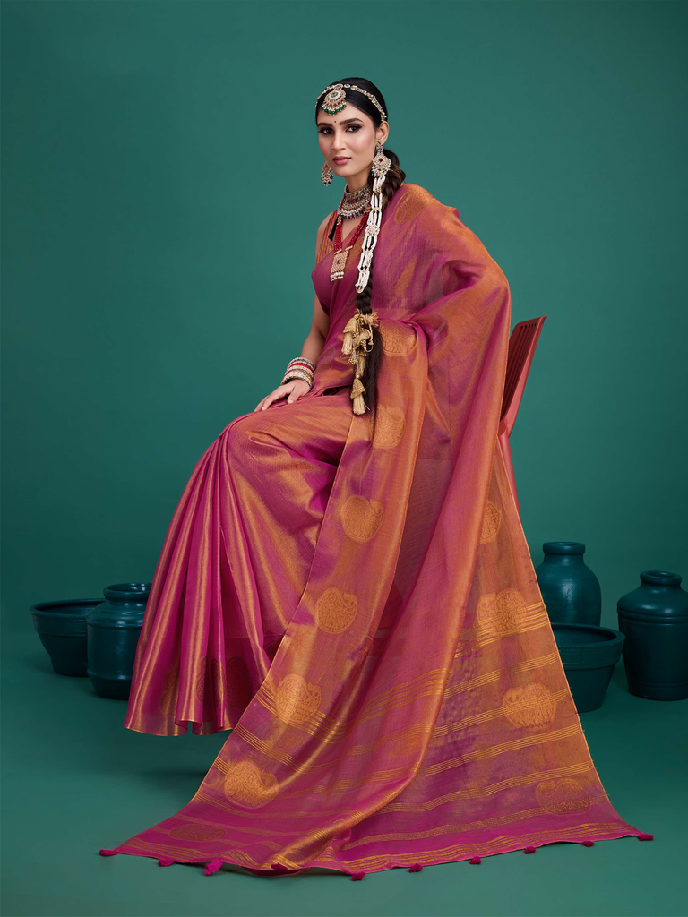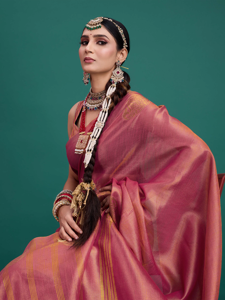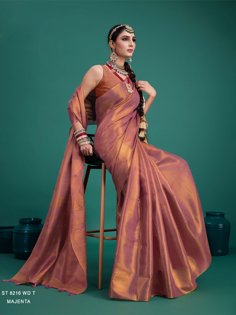Experience timeless elegance with the Classic Tissue Drape. Crafted from luxurious tissue silk, this saree features a delicate shimmer and a lightweight texture, perfect for any occasion. Its intricate zari work adds a touch of regal charm, making it a versatile choice for both traditional and contemporary looks