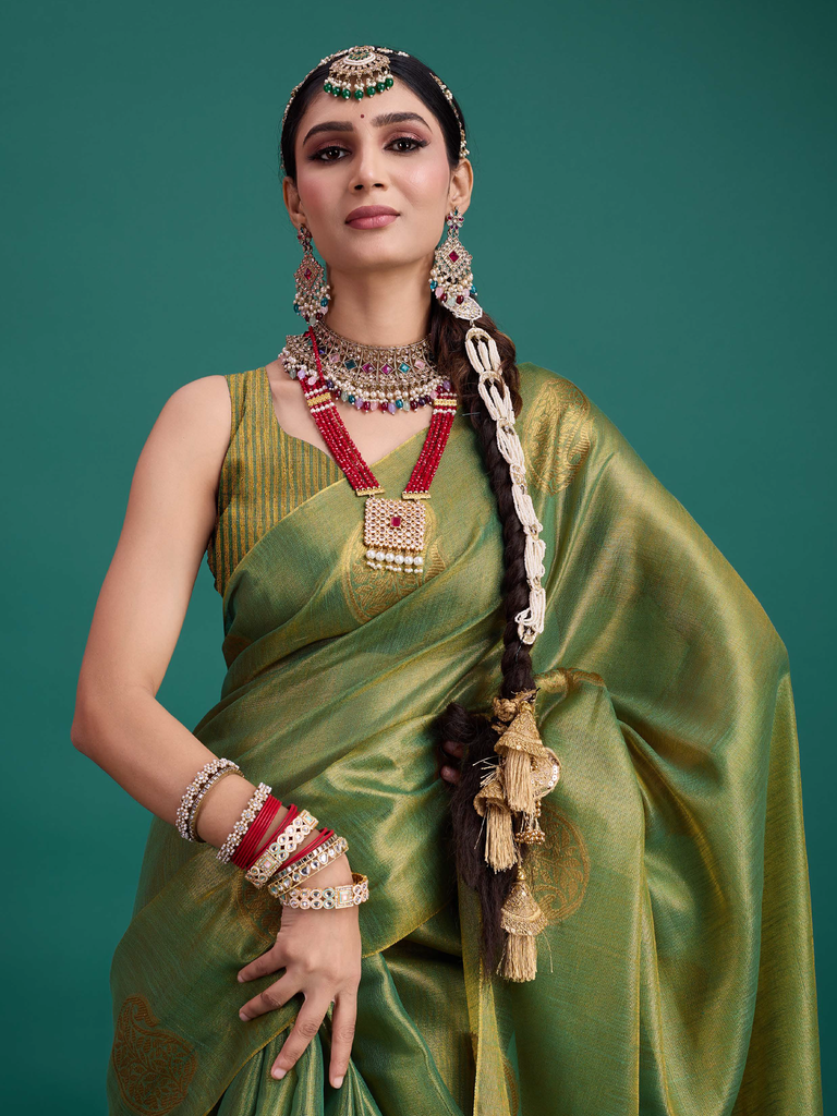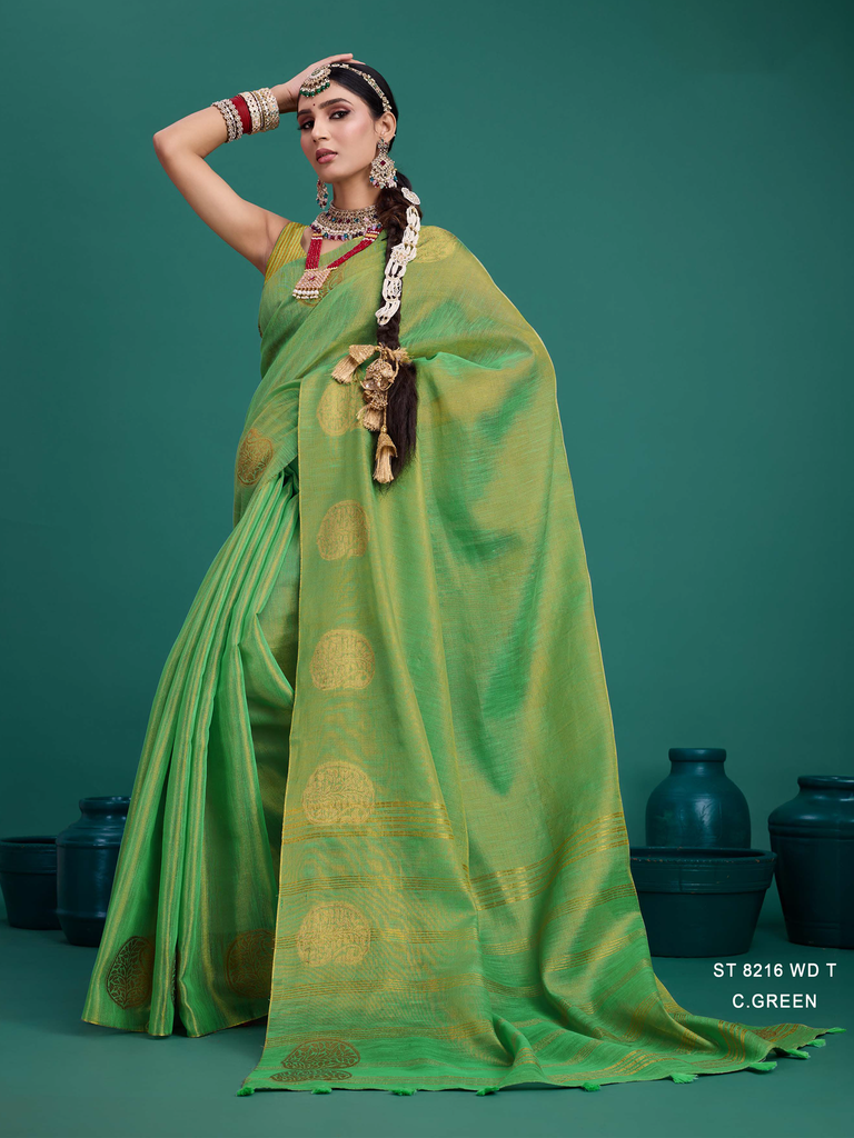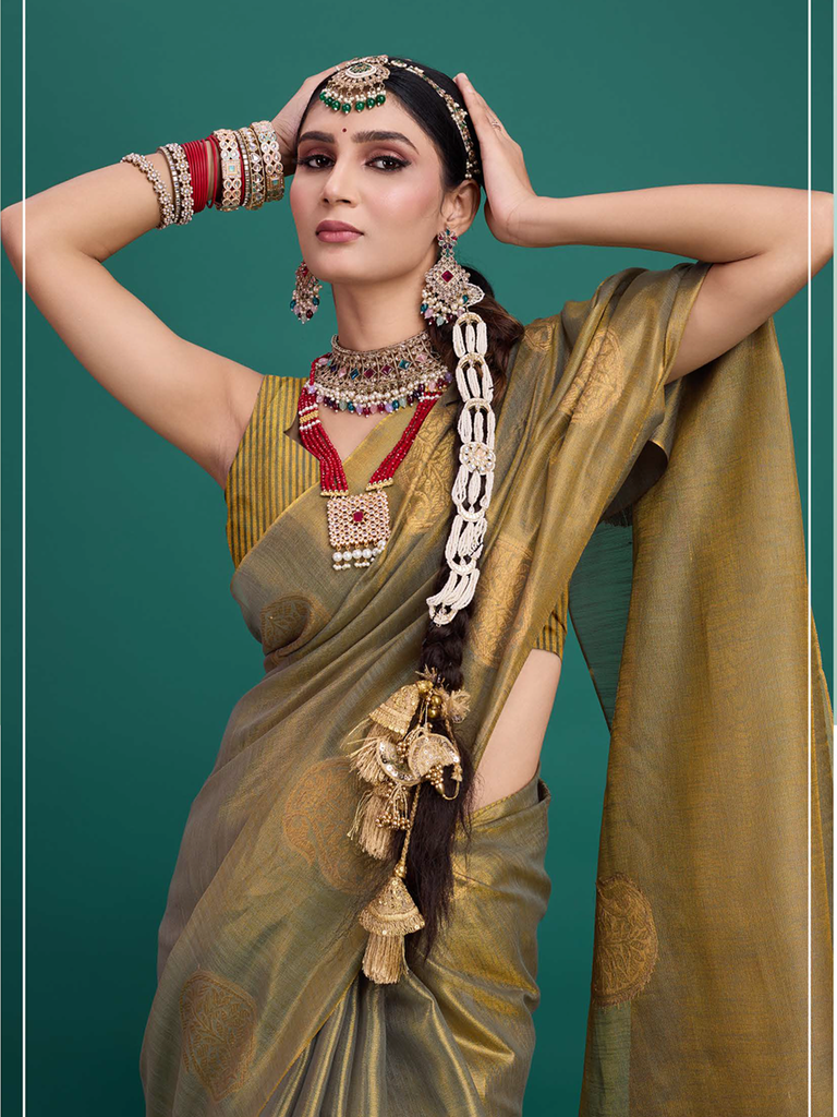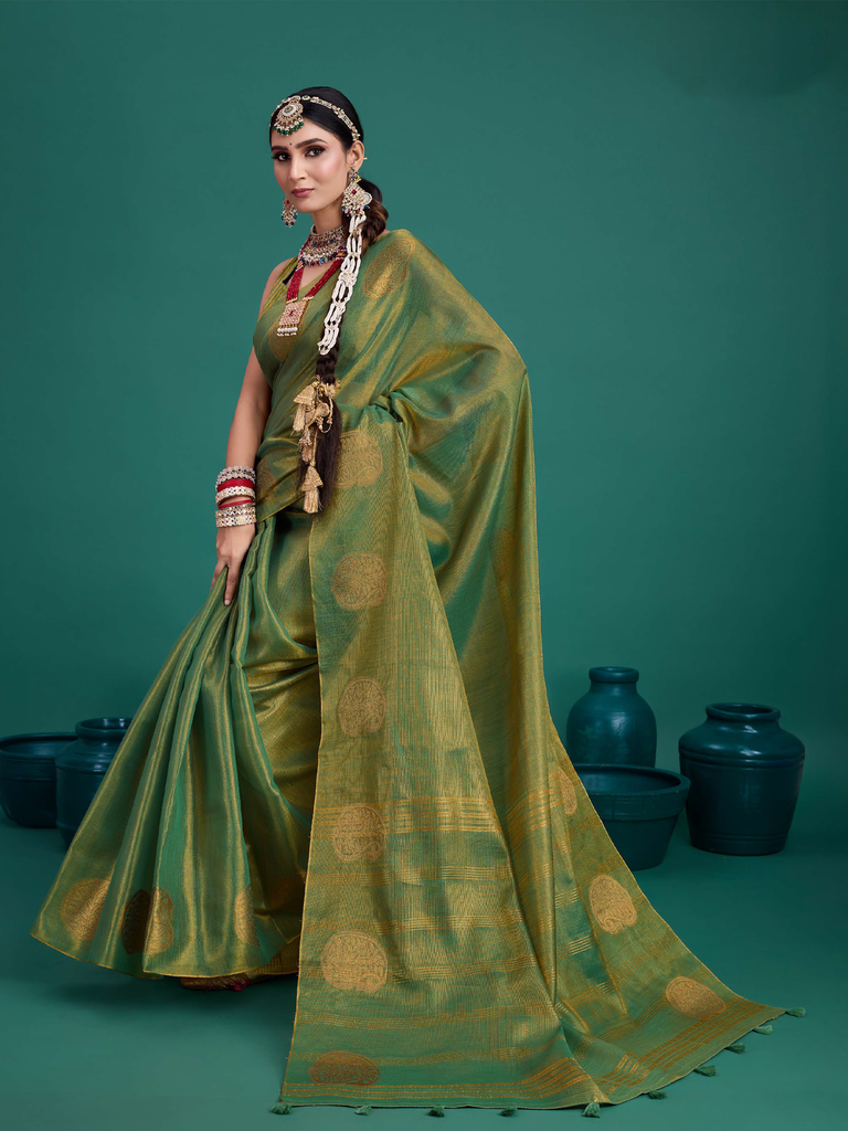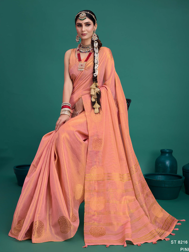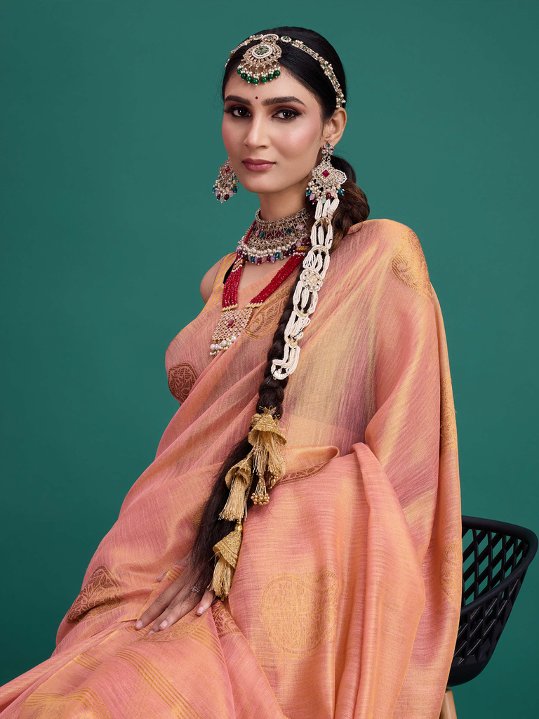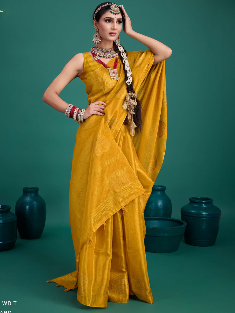 Experience timeless elegance with the Classic Tissue Drape. Crafted from luxurious tissue silk, this saree features a delicate shimmer and a lightweight texture, perfect for any occasion. Its intricate zari work adds a touch of regal charm, making it a versatile choice for both traditional and contemporary looks