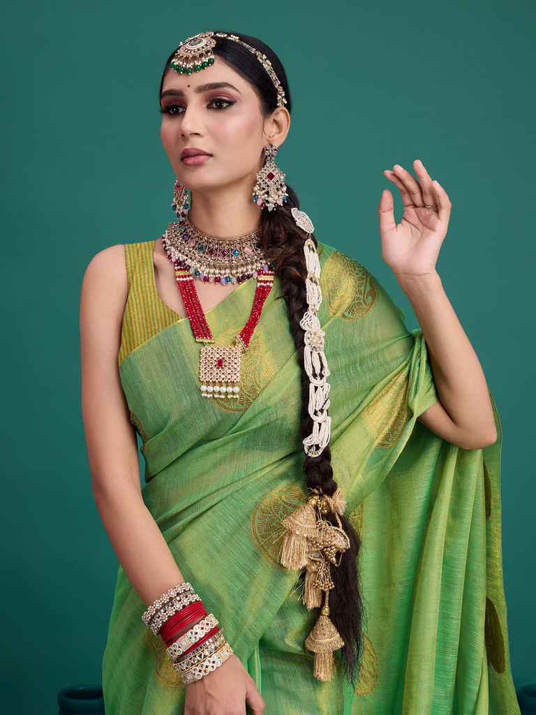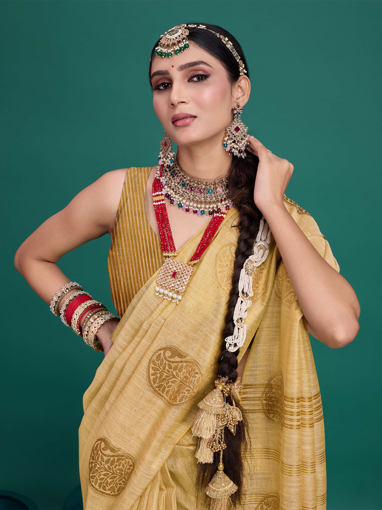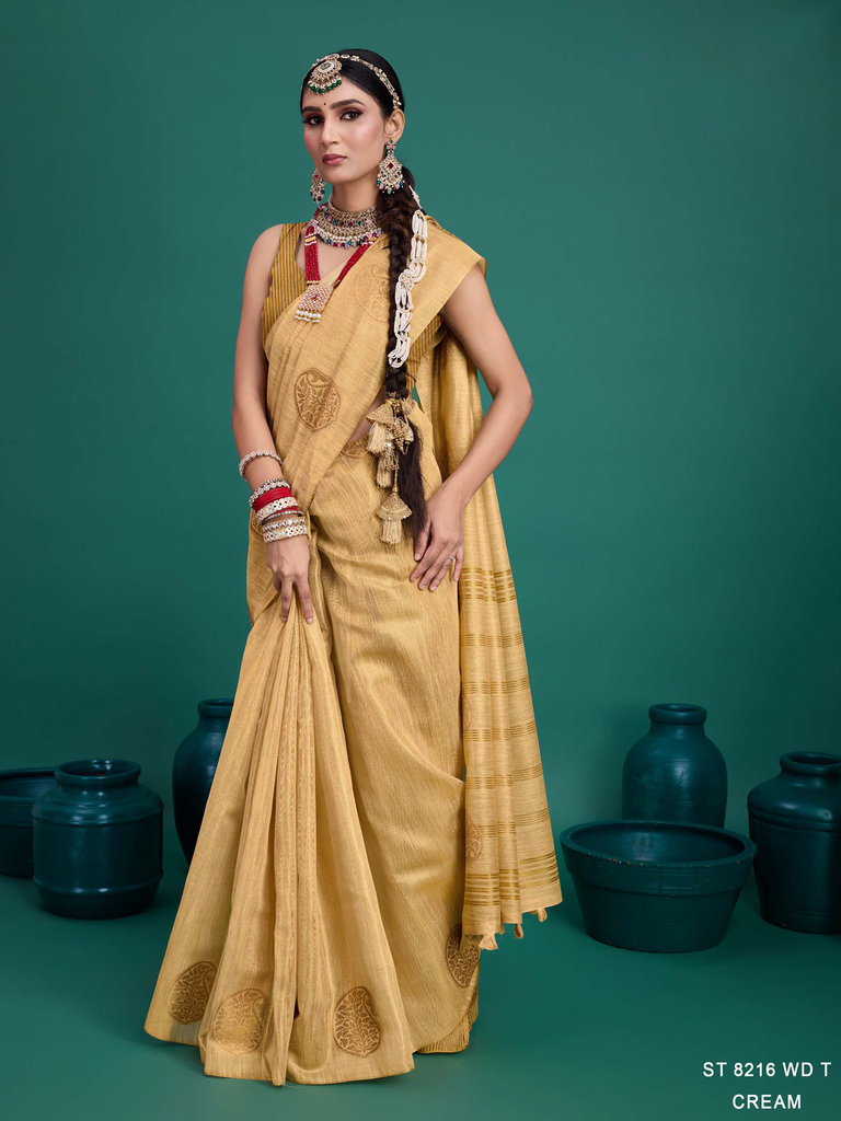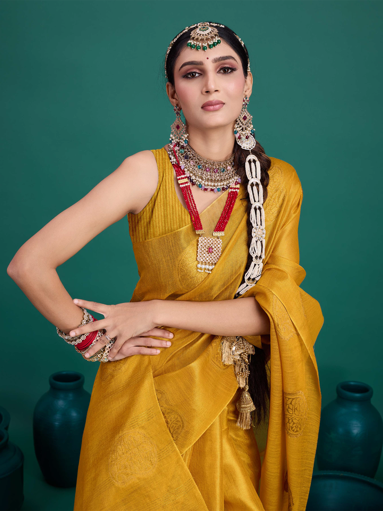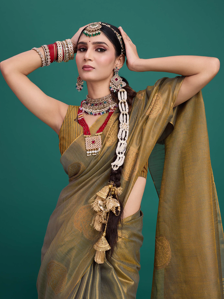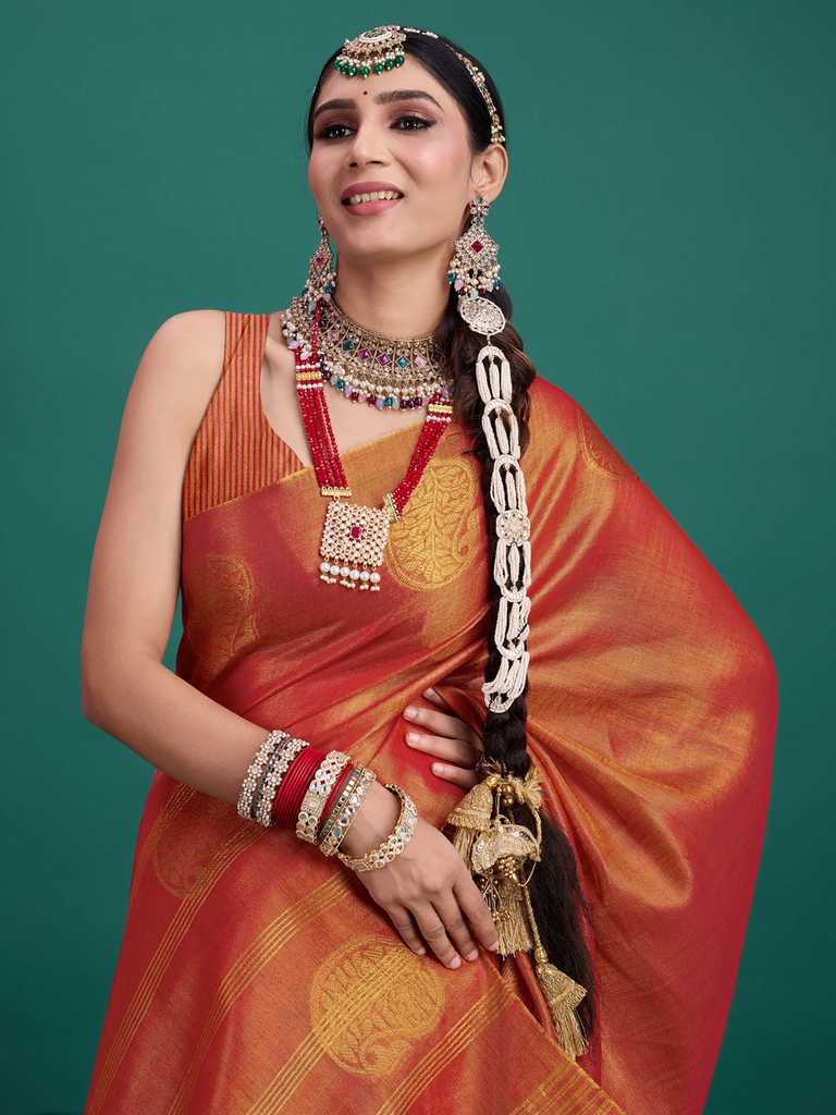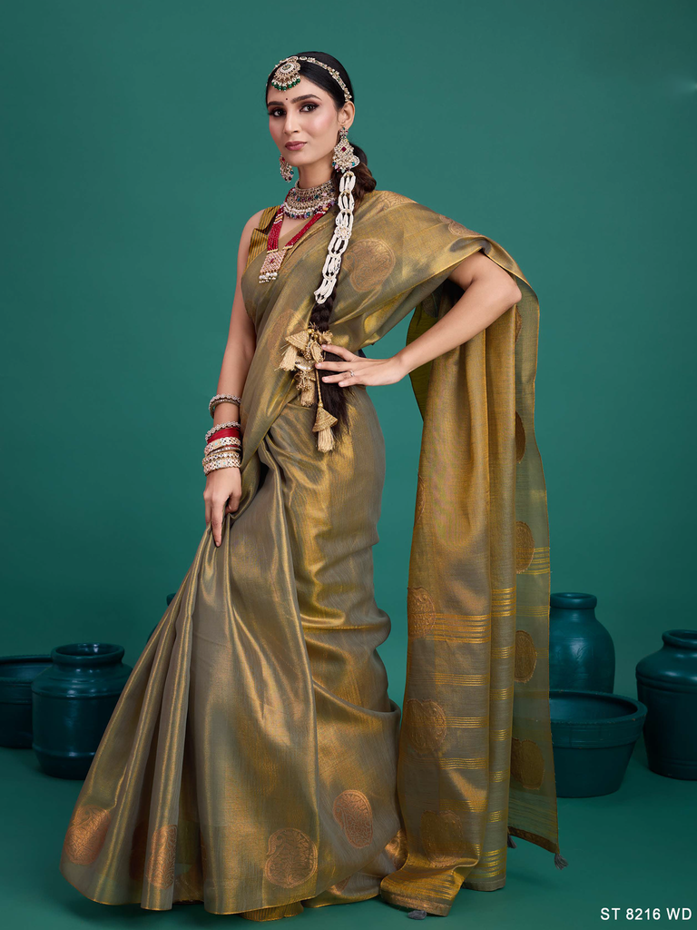 Experience timeless elegance with the Classic Tissue Drape. Crafted from luxurious tissue silk, this saree features a delicate shimmer and a lightweight texture, perfect for any occasion. Its intricate zari work adds a touch of regal charm, making it a versatile choice for both traditional and contemporary looks