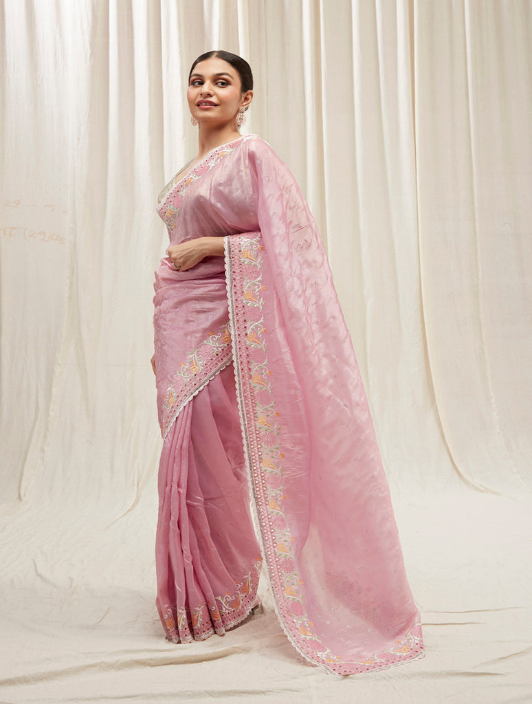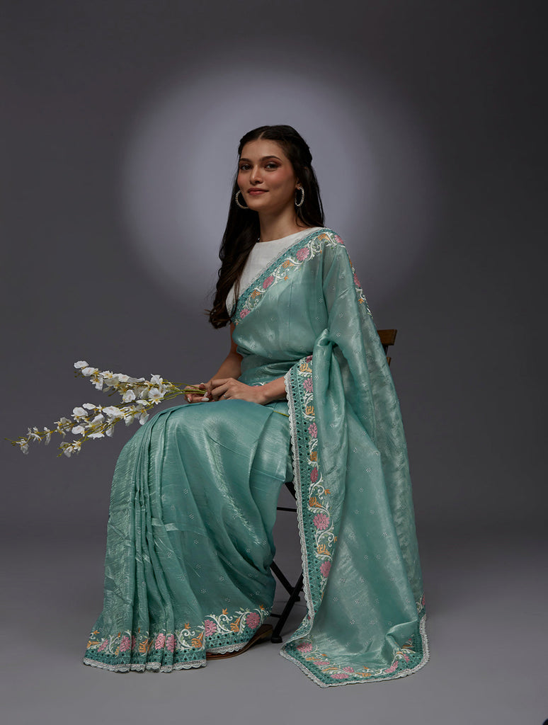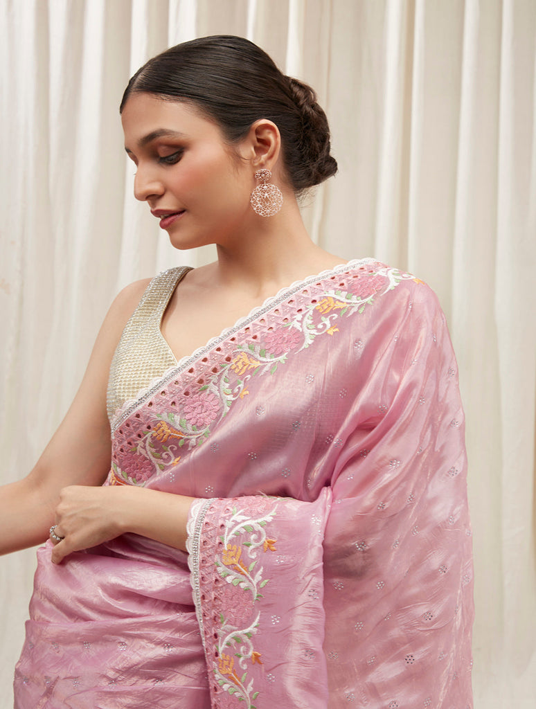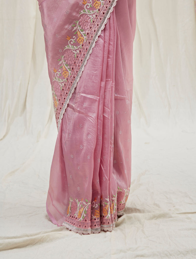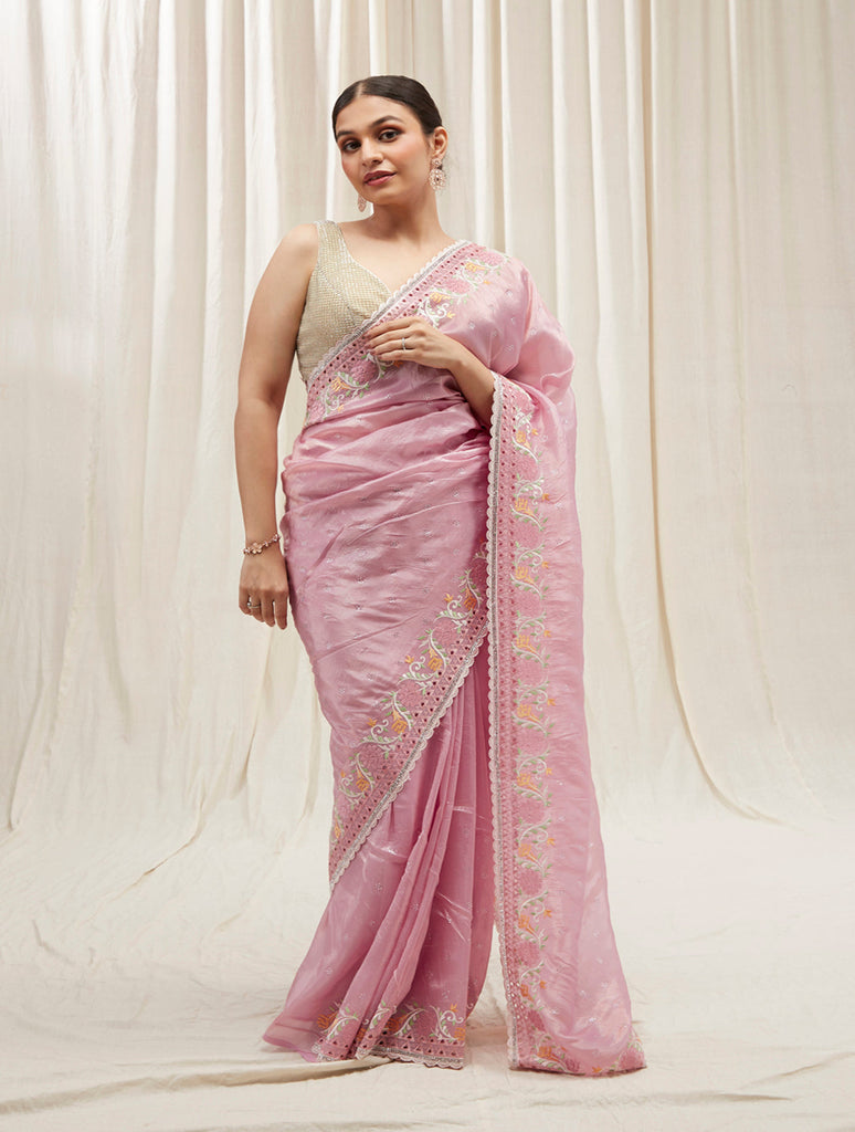 An organza saree is an elegant and lightweight traditional Indian garment made from organza fabric, known for its sheer, crisp, and airy texture. It is woven with fine silk or synthetic fibers, giving it a delicate sheen and smooth finish. These sarees are cherished for their sophistication and are often adorned with intricate embroidery, zari work, or hand-painted designs. They drape beautifully, exuding a graceful charm perfect for festive occasions, weddings, or formal events.