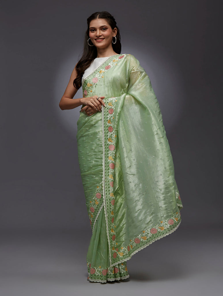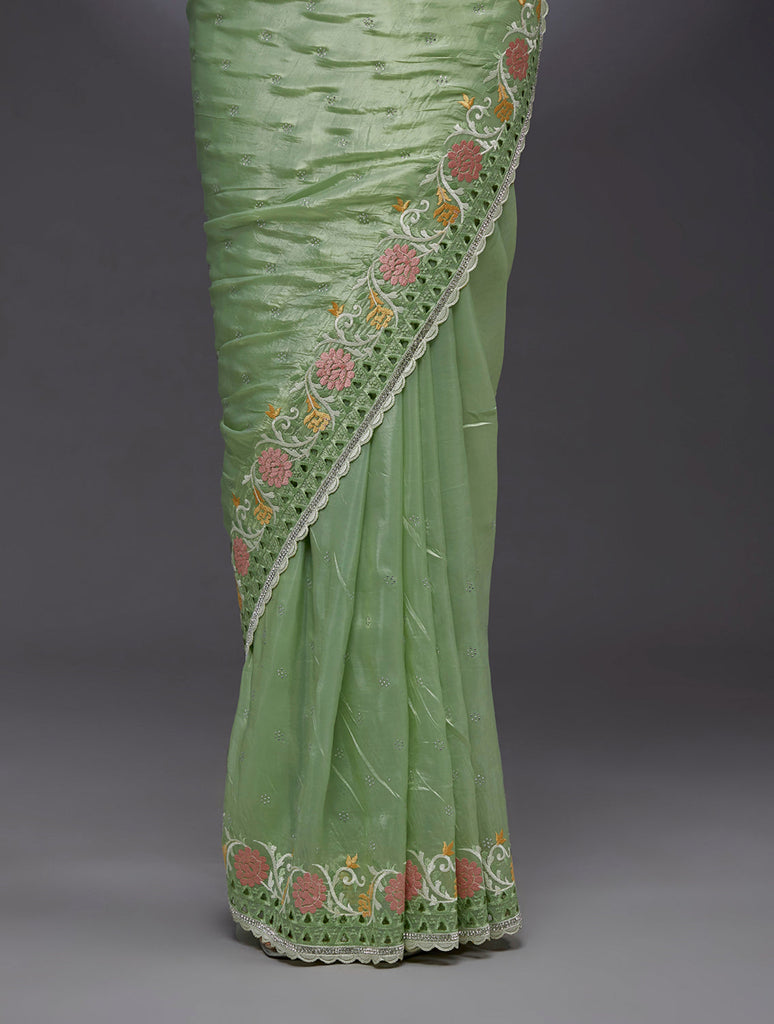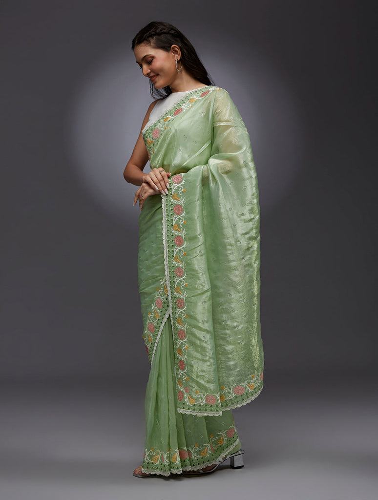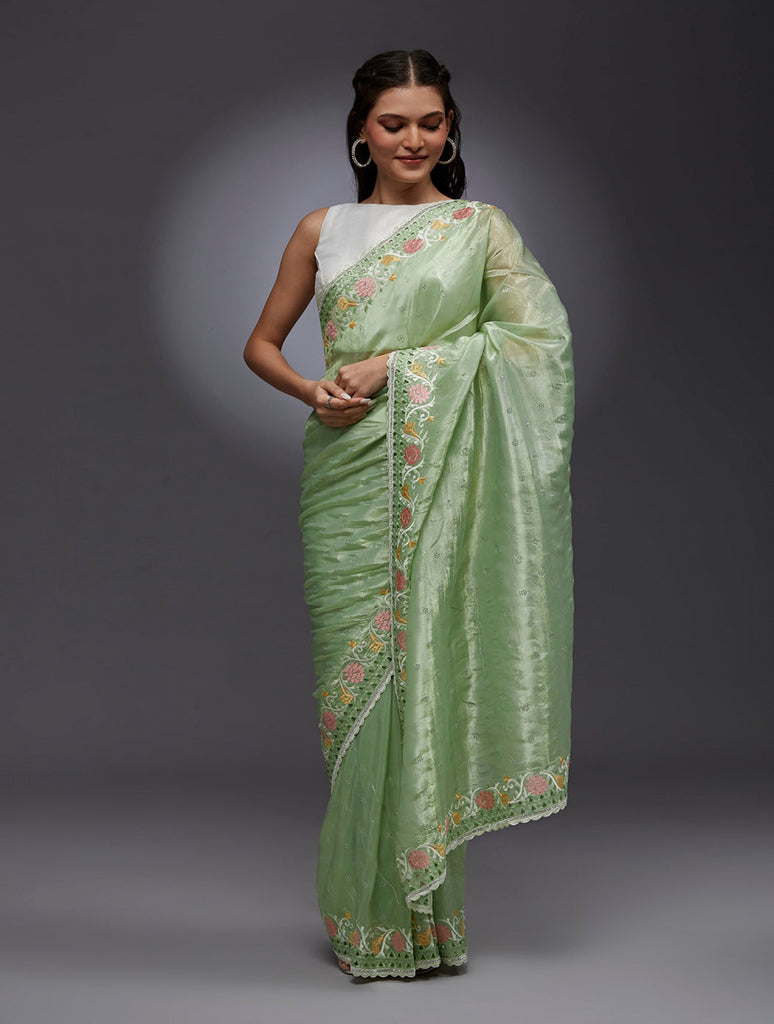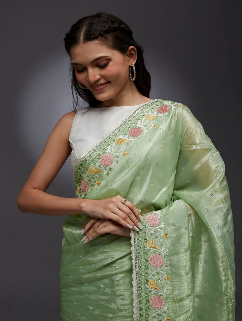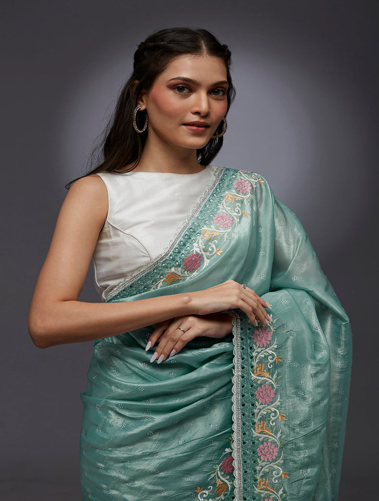 An organza saree is an elegant and lightweight traditional Indian garment made from organza fabric, known for its sheer, crisp, and airy texture. It is woven with fine silk or synthetic fibers, giving it a delicate sheen and smooth finish. These sarees are cherished for their sophistication and are often adorned with intricate embroidery, zari work, or hand-painted designs. They drape beautifully, exuding a graceful charm perfect for festive occasions, weddings, or formal events.