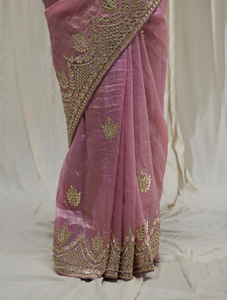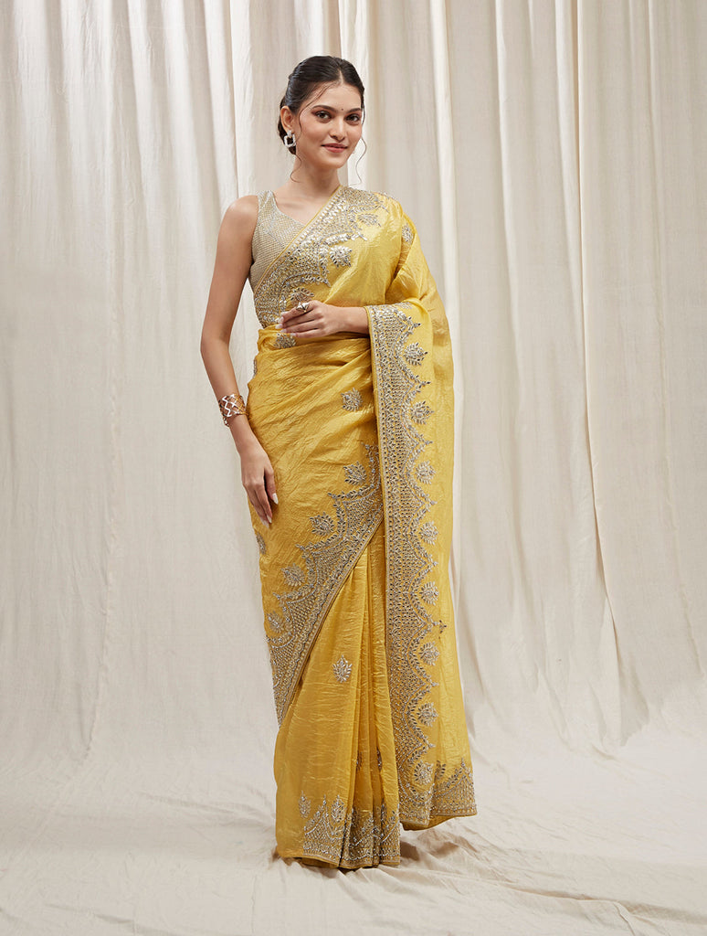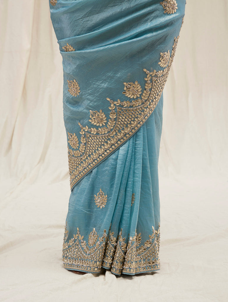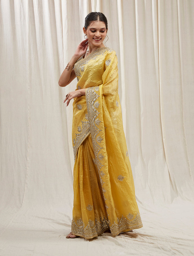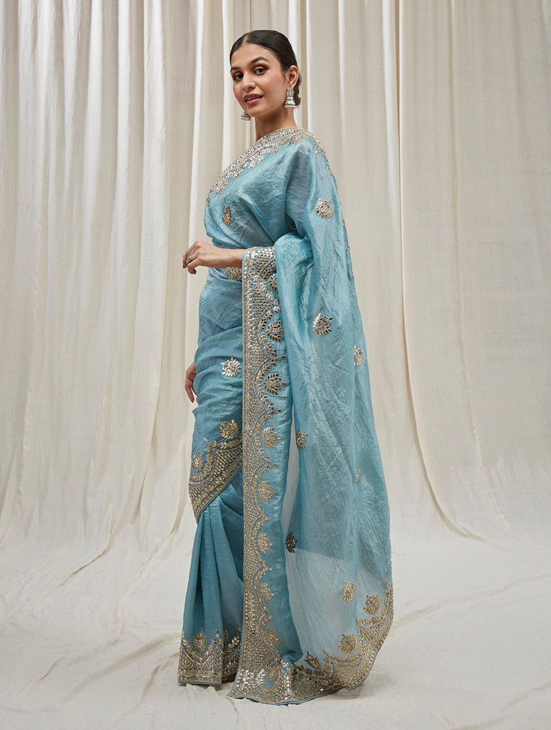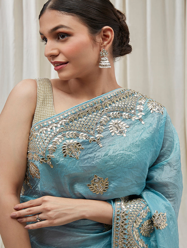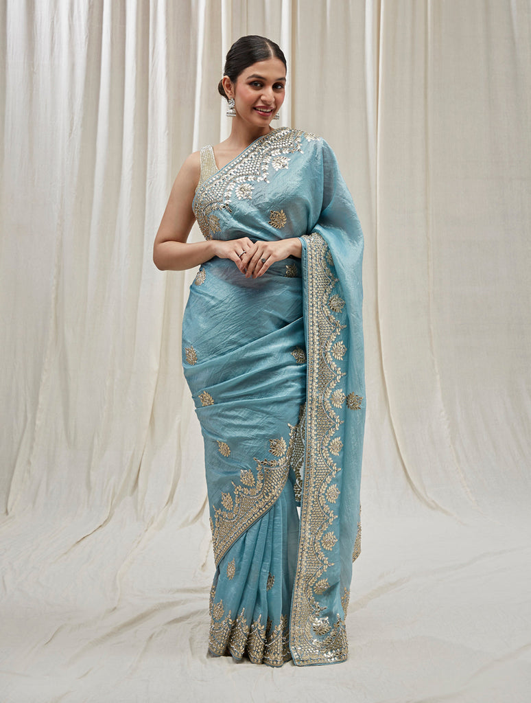 An organza saree is an elegant and lightweight traditional Indian garment made from organza fabric, known for its sheer, crisp, and airy texture. It is woven with fine silk or synthetic fibers, giving it a delicate sheen and smooth finish. These sarees are cherished for their sophistication and are often adorned with intricate embroidery, zari work, or hand-painted designs. They drape beautifully, exuding a graceful charm perfect for festive occasions, weddings, or formal events.