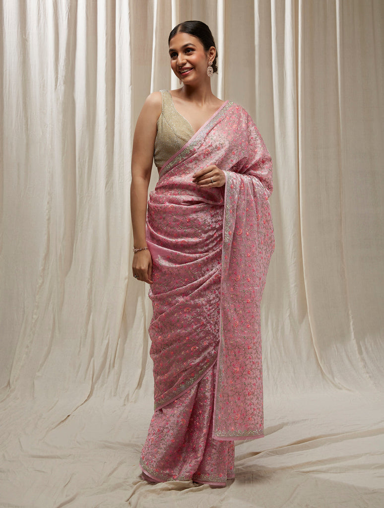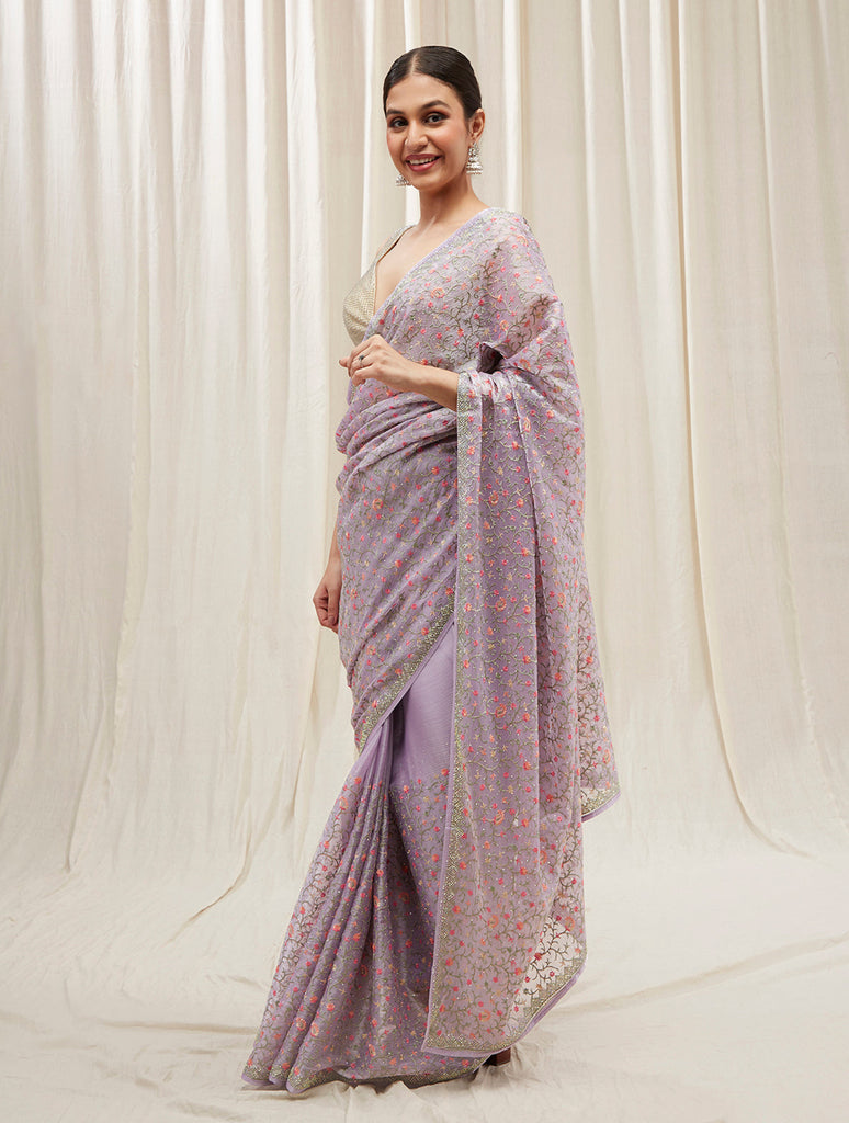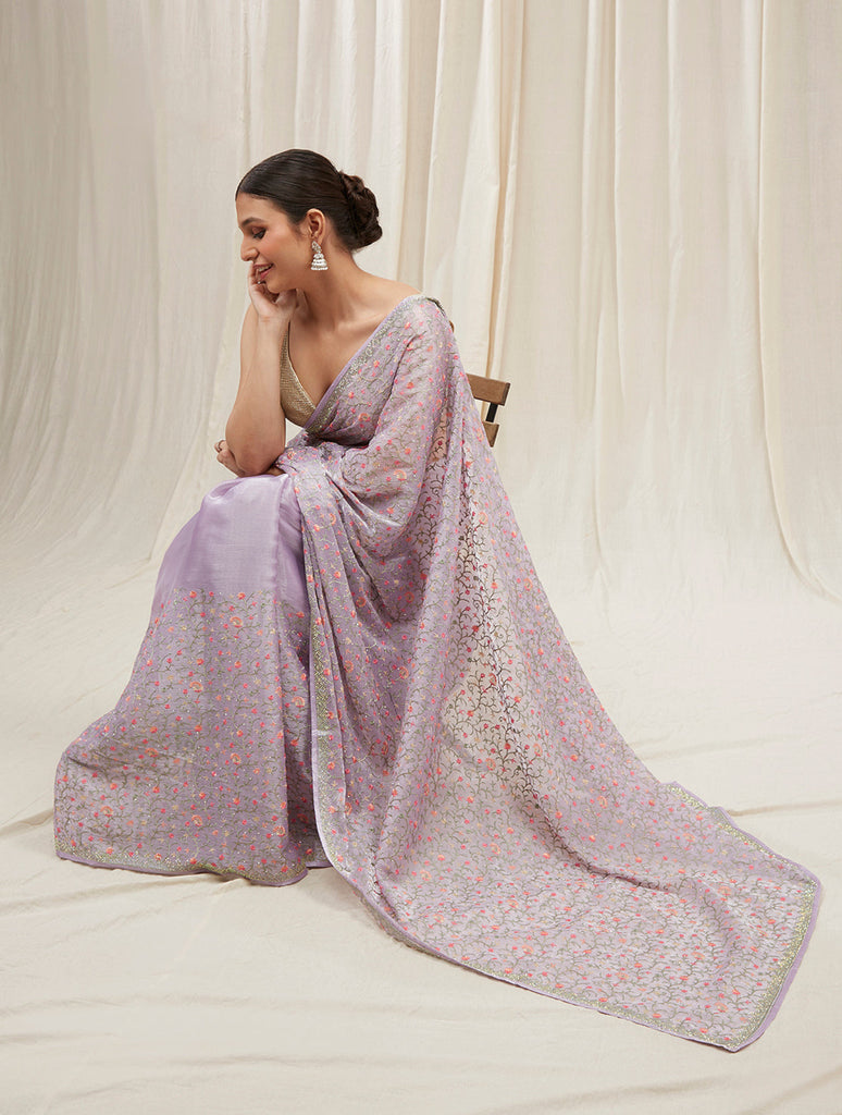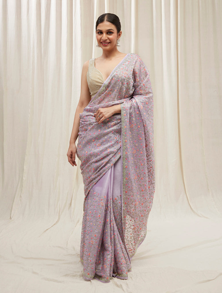 Georgette is a lightweight, sheer fabric known for its soft and flowy texture, making it a popular choice for designer sarees. Its slightly rough surface provides a unique drape that enhances the elegance of the garment. The fabric is durable and versatile, allowing intricate embroidery, prints, and embellishments to be incorporated seamlessly. Ideal for festive wear and parties, georgette sarees come in vibrant colors and can feature stunning borders adorned with zari, sequins, or beadwork. The material’s breathable nature ensures comfort while maintaining a chic and sophisticated look, making it perfect for both day and evening events.