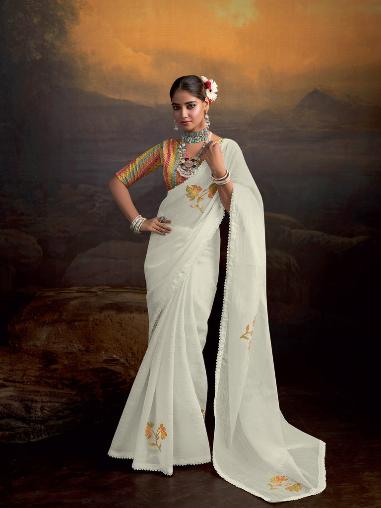 Celebrate tradition with a touch of sophistication through this exquisite organza saree, adorned with authentic Kathpadar artistry. The translucent fabric, known for its lightweight and luxurious feel, enhances the beauty of its intricate borders and motifs. The timeless patterns pay homage to cultural heritage, while the subtle shimmer of the saree lends a refined charm. Perfect for weddings, festivals, or cultural celebrations, this saree is a masterpiece of grace and tradition.