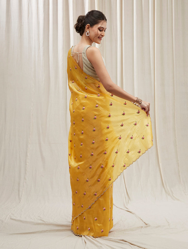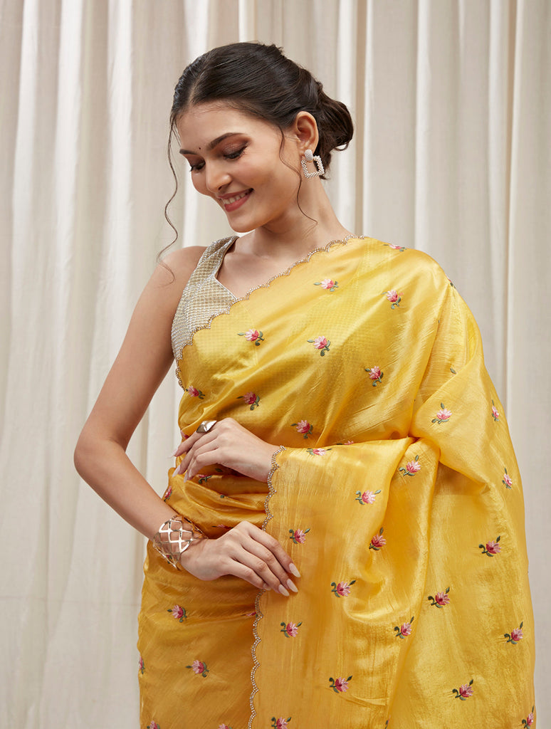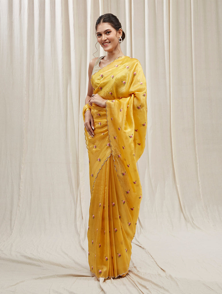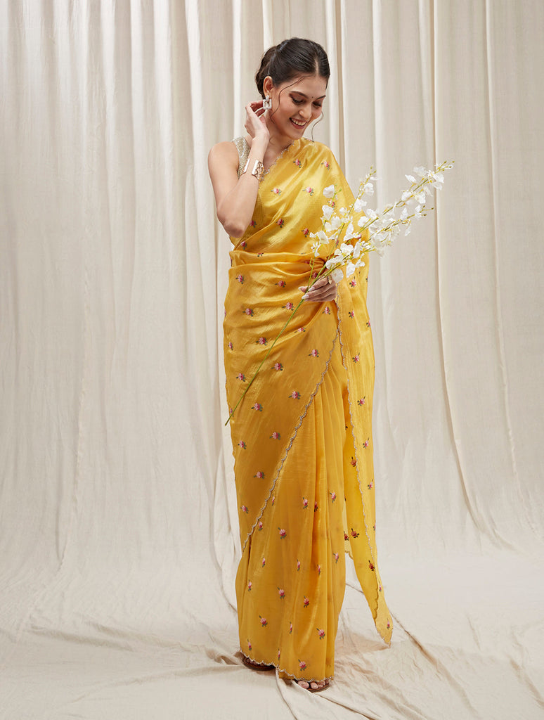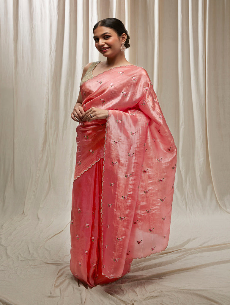 An organza saree is an elegant and lightweight traditional Indian garment made from organza fabric, known for its sheer, crisp, and airy texture. It is woven with fine silk or synthetic fibers, giving it a delicate sheen and smooth finish. These sarees are cherished for their sophistication and are often adorned with intricate embroidery, zari work, or hand-painted designs. They drape beautifully, exuding a graceful charm perfect for festive occasions, weddings, or formal events.