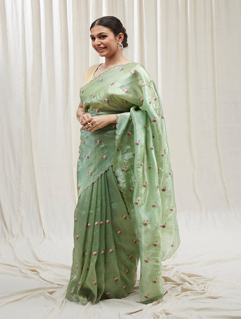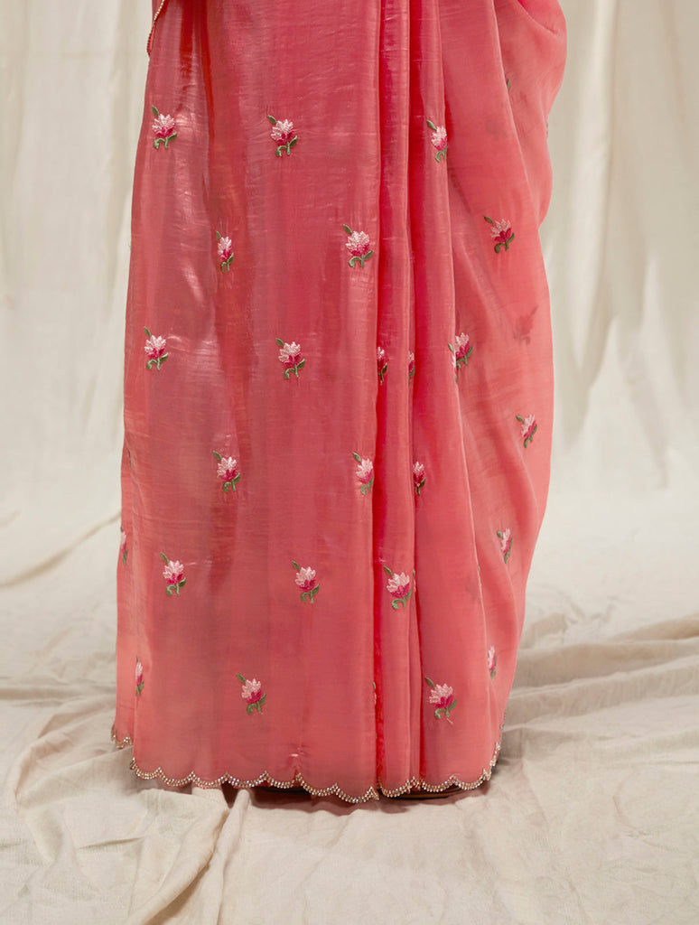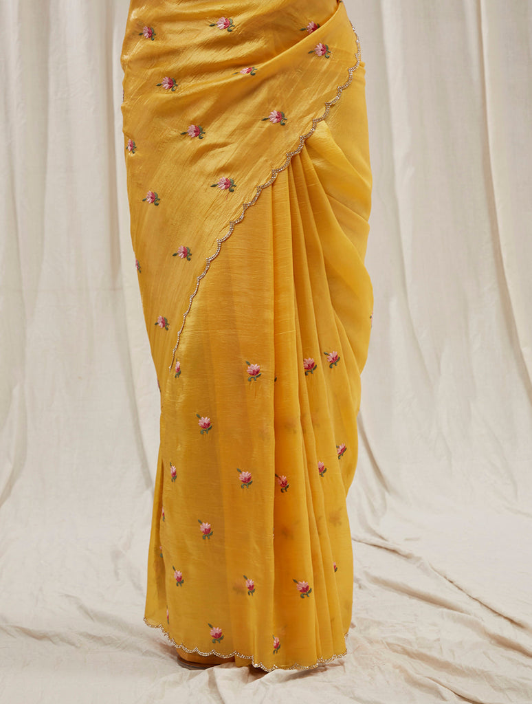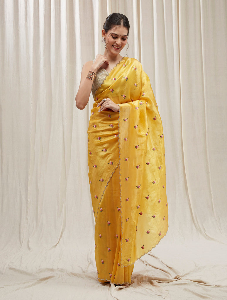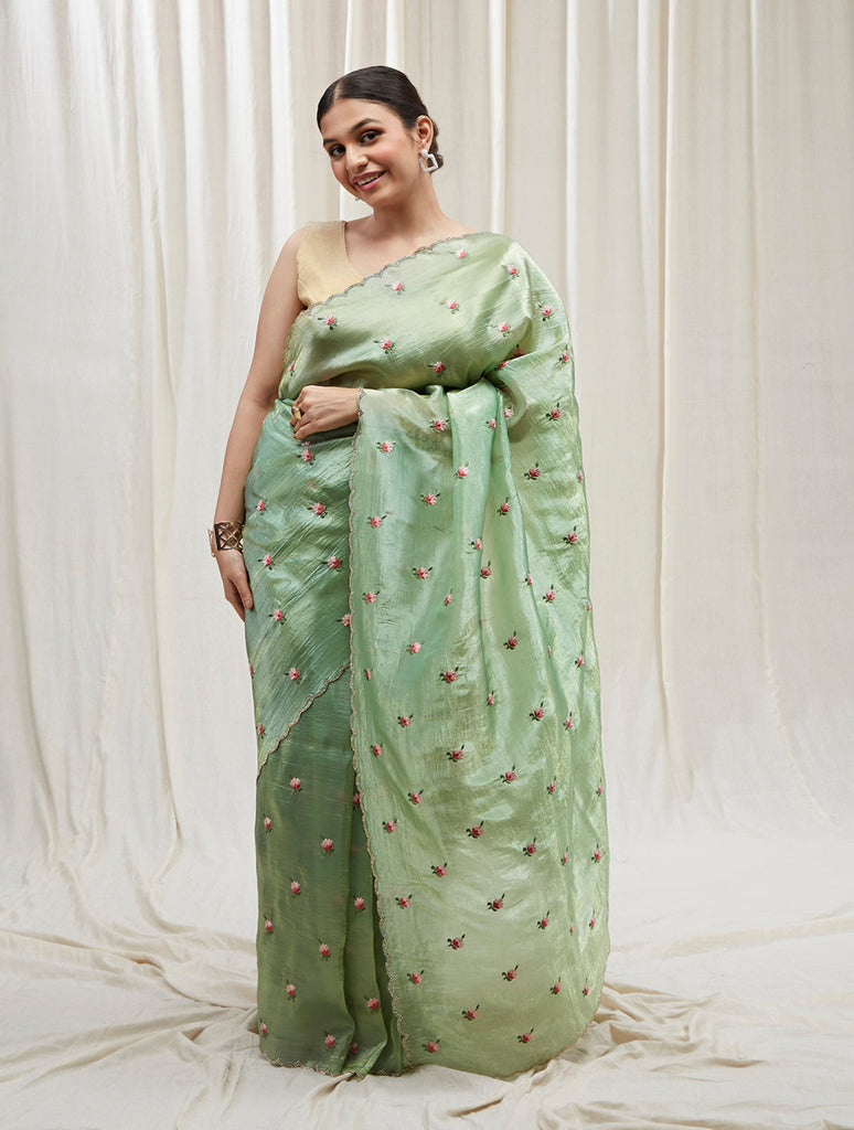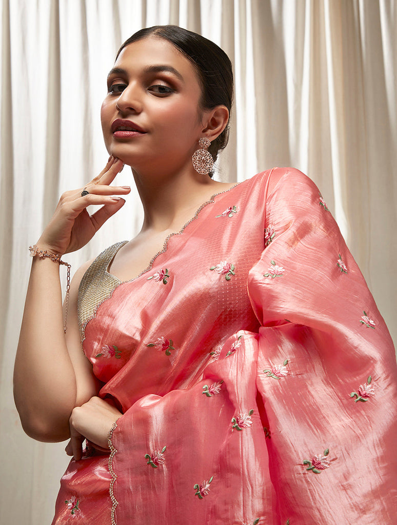 An organza saree is an elegant and lightweight traditional Indian garment made from organza fabric, known for its sheer, crisp, and airy texture. It is woven with fine silk or synthetic fibers, giving it a delicate sheen and smooth finish. These sarees are cherished for their sophistication and are often adorned with intricate embroidery, zari work, or hand-painted designs. They drape beautifully, exuding a graceful charm perfect for festive occasions, weddings, or formal events.