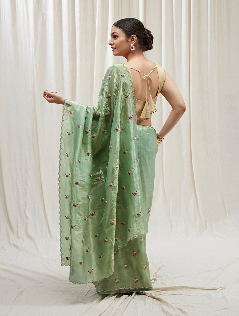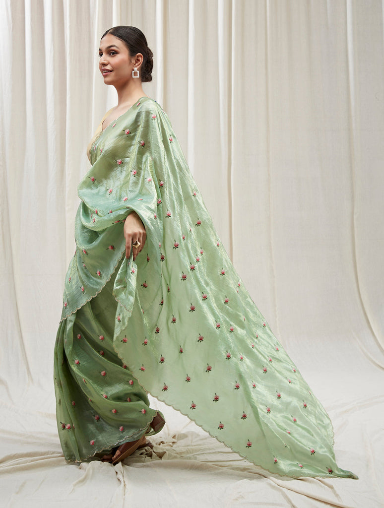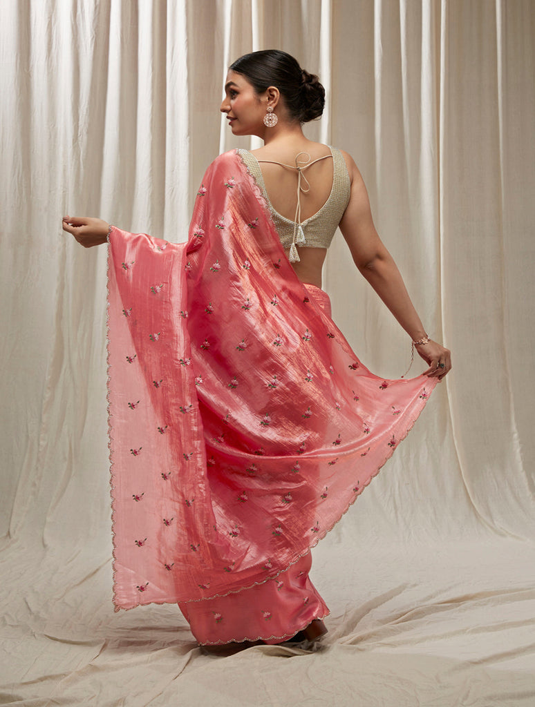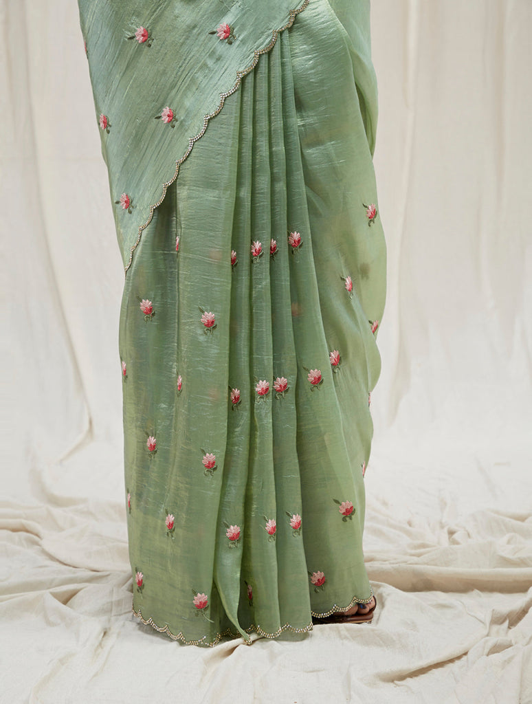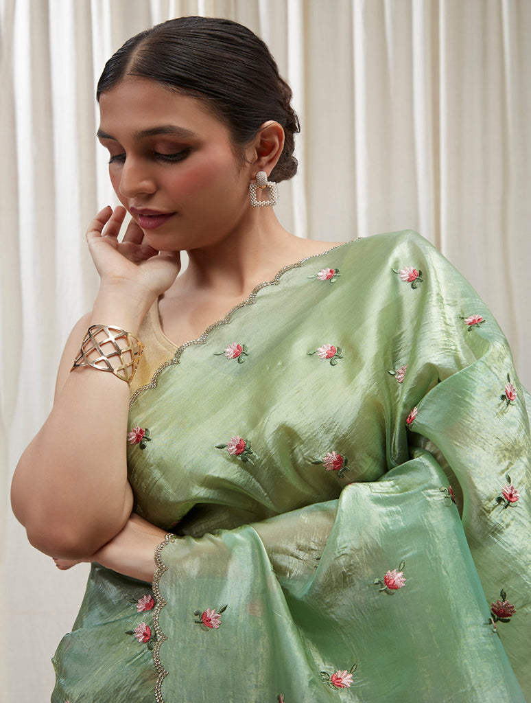 An organza saree is an elegant and lightweight traditional Indian garment made from organza fabric, known for its sheer, crisp, and airy texture. It is woven with fine silk or synthetic fibers, giving it a delicate sheen and smooth finish. These sarees are cherished for their sophistication and are often adorned with intricate embroidery, zari work, or hand-painted designs. They drape beautifully, exuding a graceful charm perfect for festive occasions, weddings, or formal events.