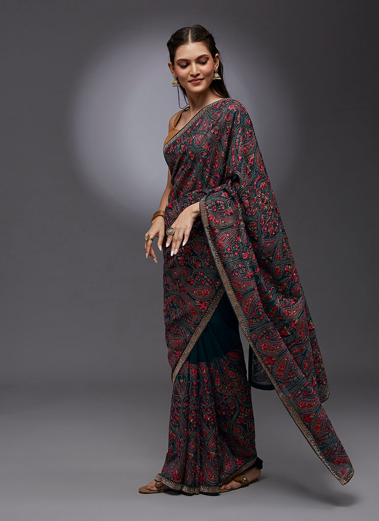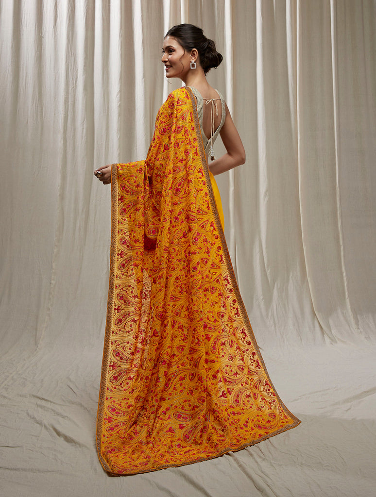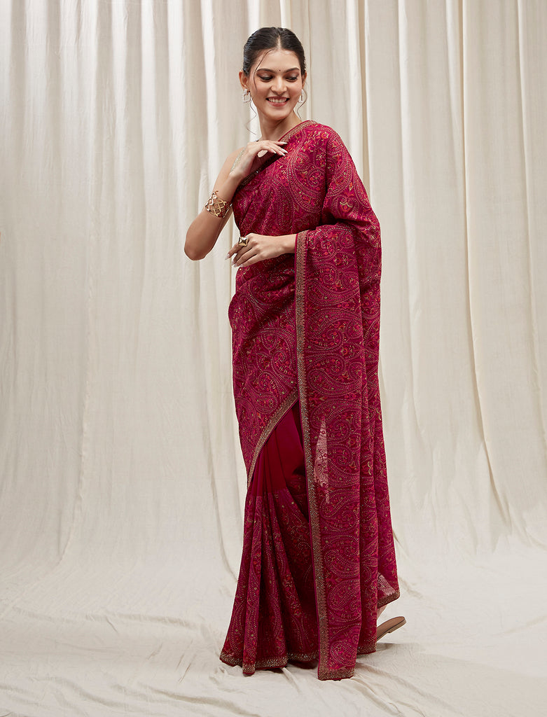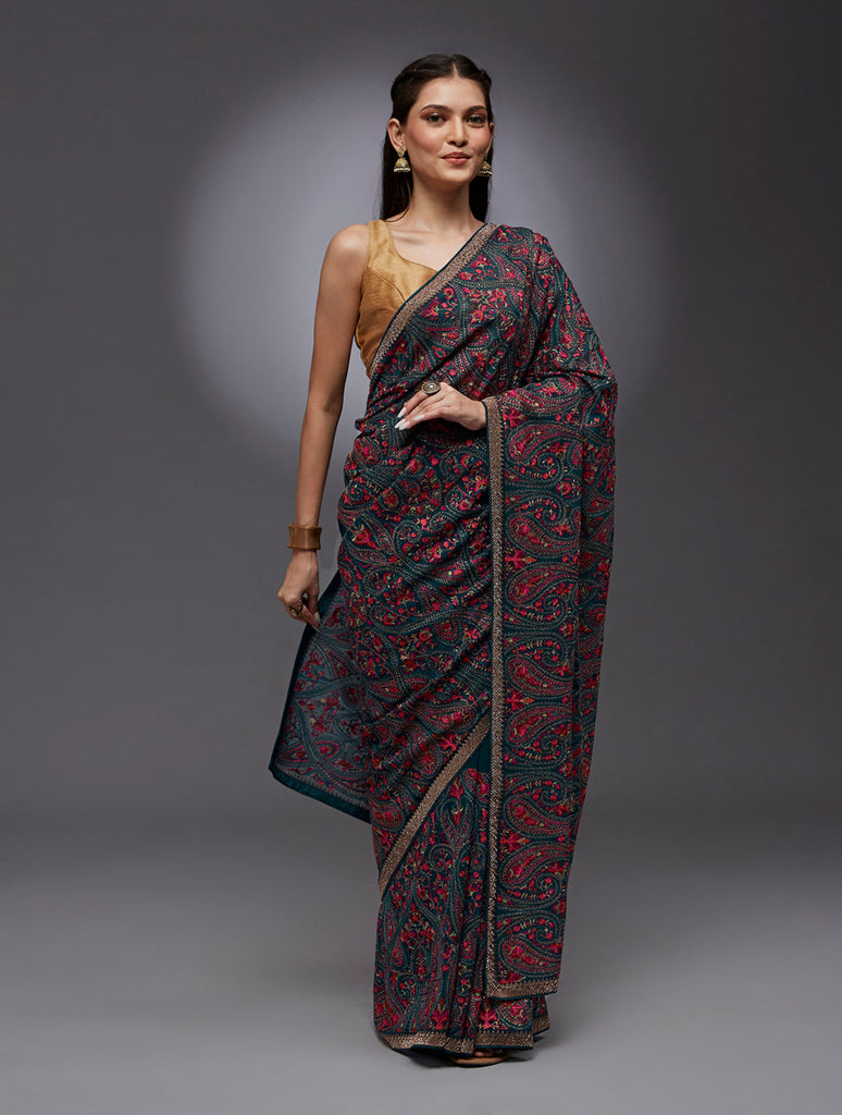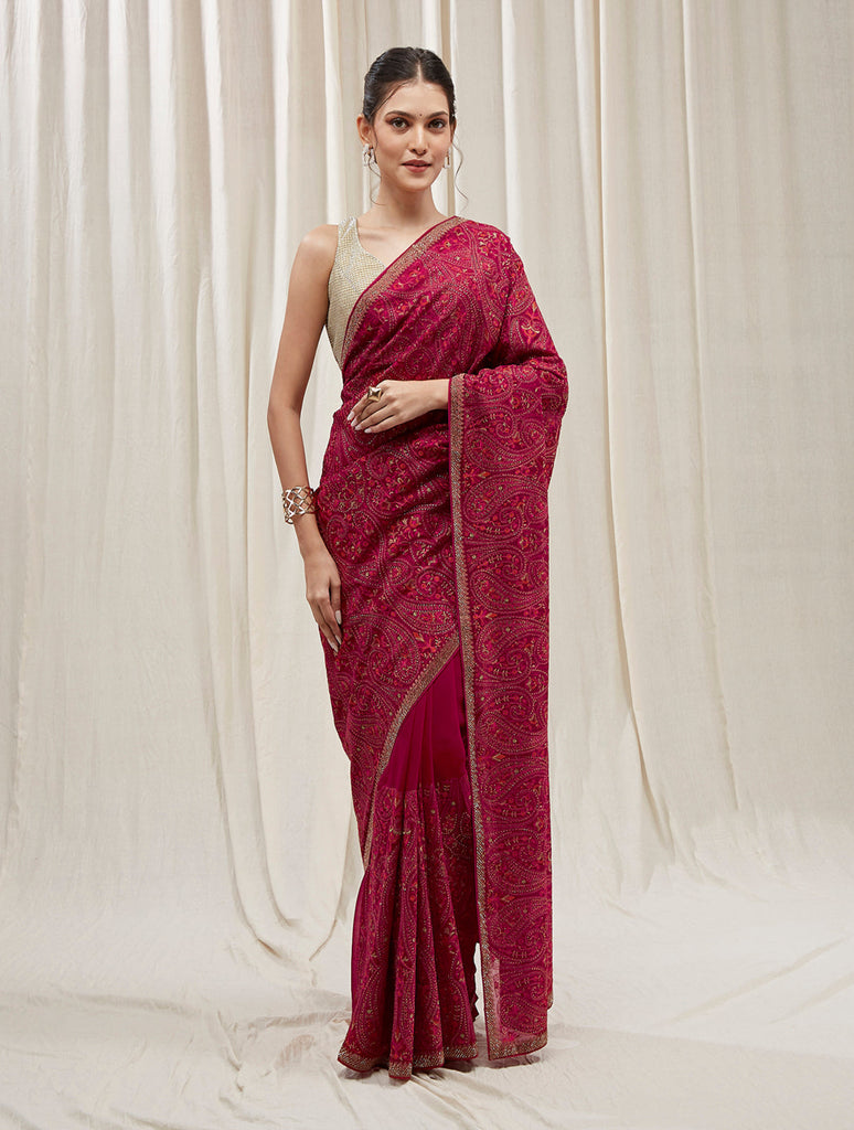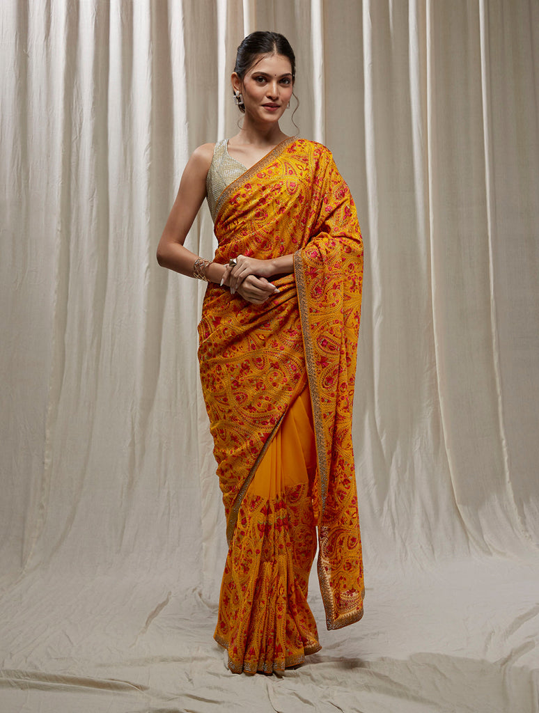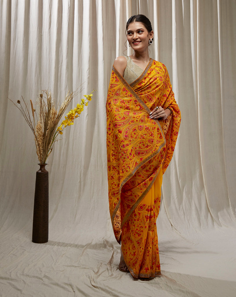 Georgette is a lightweight, sheer fabric known for its soft and flowy texture, making it a popular choice for designer sarees. Its slightly rough surface provides a unique drape that enhances the elegance of the garment. The fabric is durable and versatile, allowing intricate embroidery, prints, and embellishments to be incorporated seamlessly. Ideal for festive wear and parties, georgette sarees come in vibrant colors and can feature stunning borders adorned with zari, sequins, or beadwork. The material’s breathable nature ensures comfort while maintaining a chic and sophisticated look, making it perfect for both day and evening events.