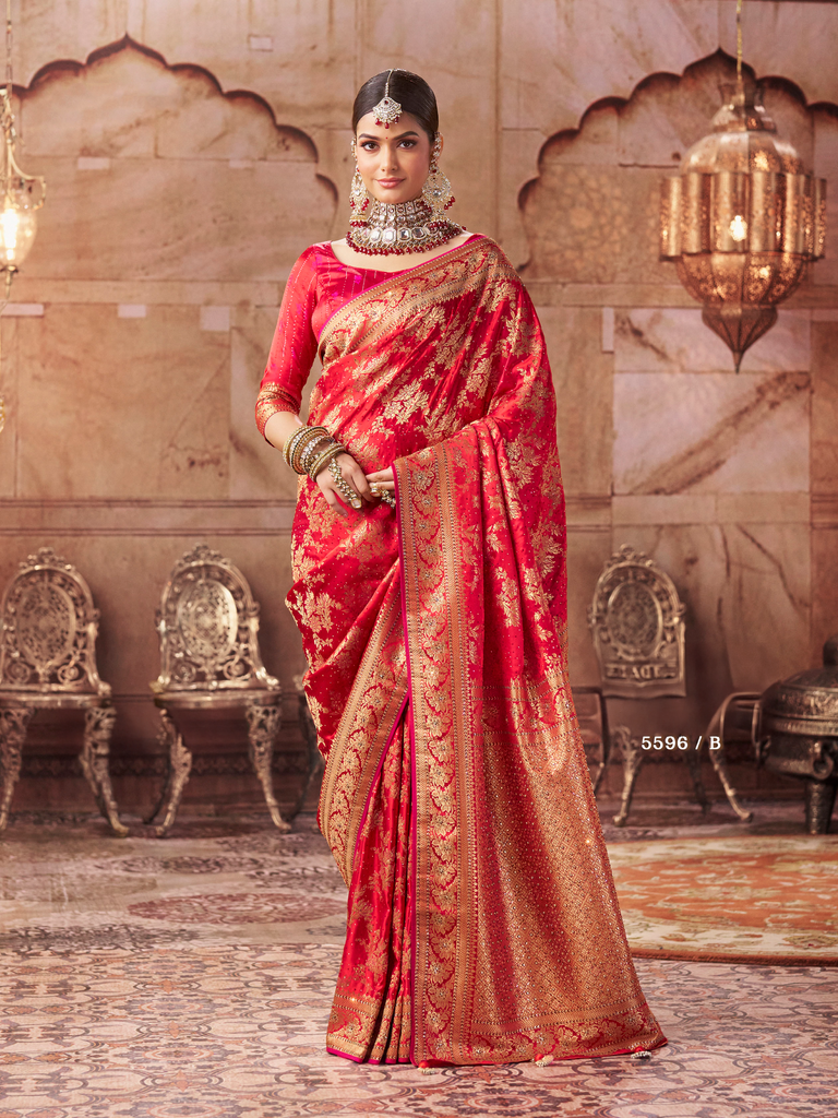 Shubh Laxmi Grace features exquisite diamond work paired with auspicious lace embroidery on smooth satin fabric, creating a sophisticated bridal collection. This ensemble blends traditional elegance with refined craftsmanship, making it an ideal choice for memorable wedding ceremonies.