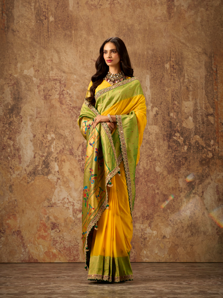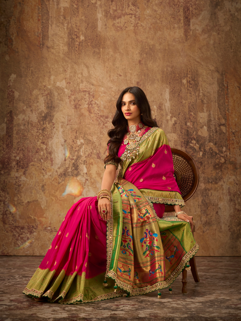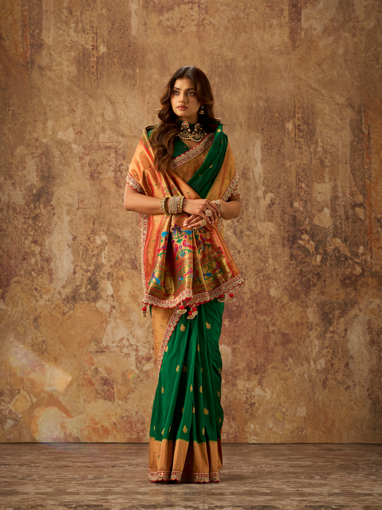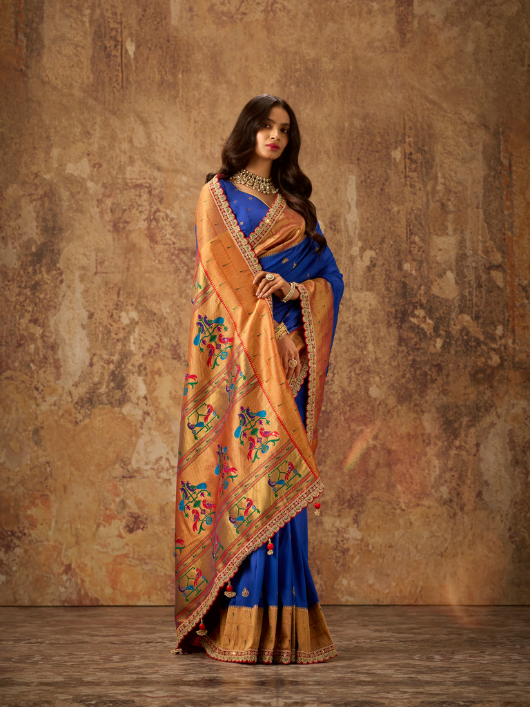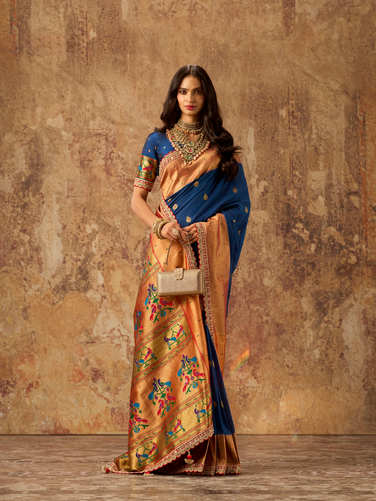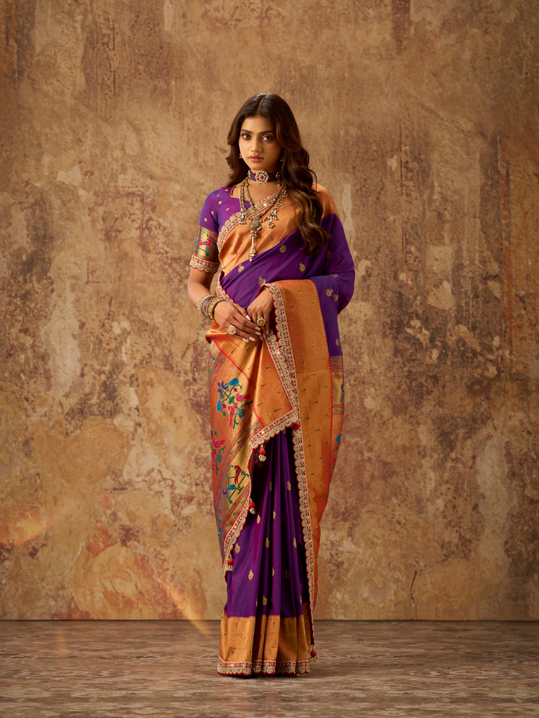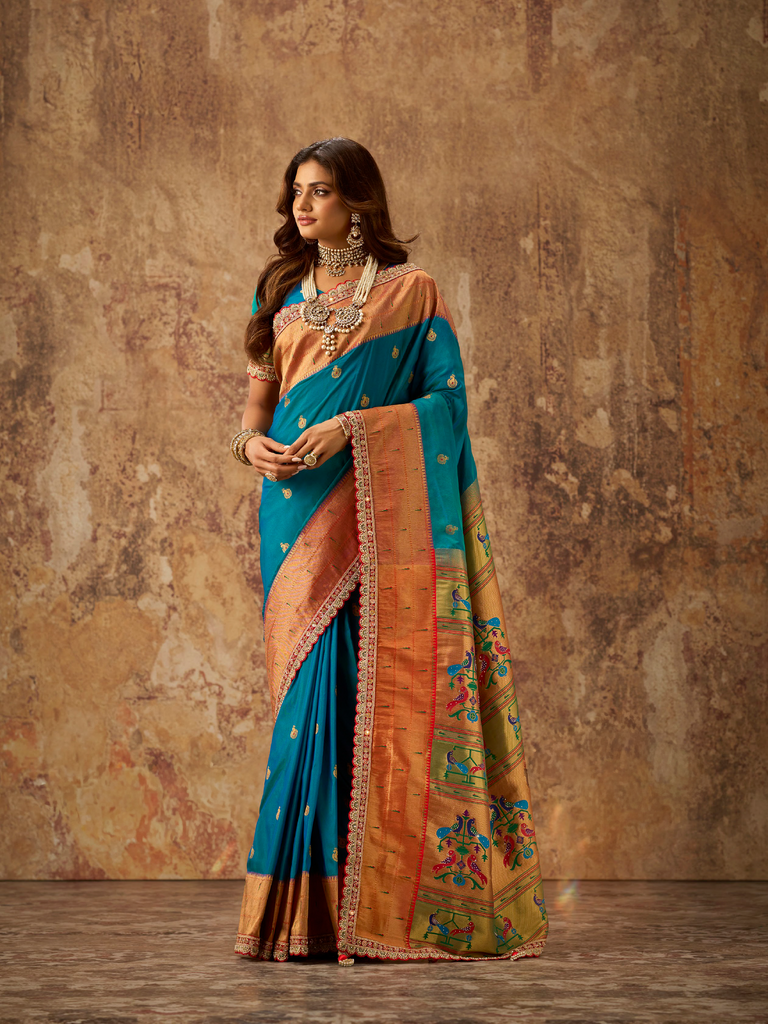 Experience the timeless elegance of the Regal Peshwai Threads Paithani saree, featuring the distinctive Muniya border. Crafted with expert precision, this saree showcases intricate weaving that highlights traditional artistry while offering a refined drape. Ideal for those who appreciate heritage textiles, it combines rich textures and classic motifs to create a stunning statement piece for any special occasion.