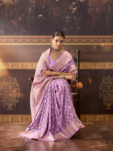 Crafted from smooth satin, the Banarasi Dream Weave saree features delicate small butti patterns and an intricately detailed art border, embodying the essence of Kathpathdar weaving. This designer saree is tailored for the contemporary festive wardrobe, blending traditional artistry with current trends to offer a refined and elegant look for special occasions.