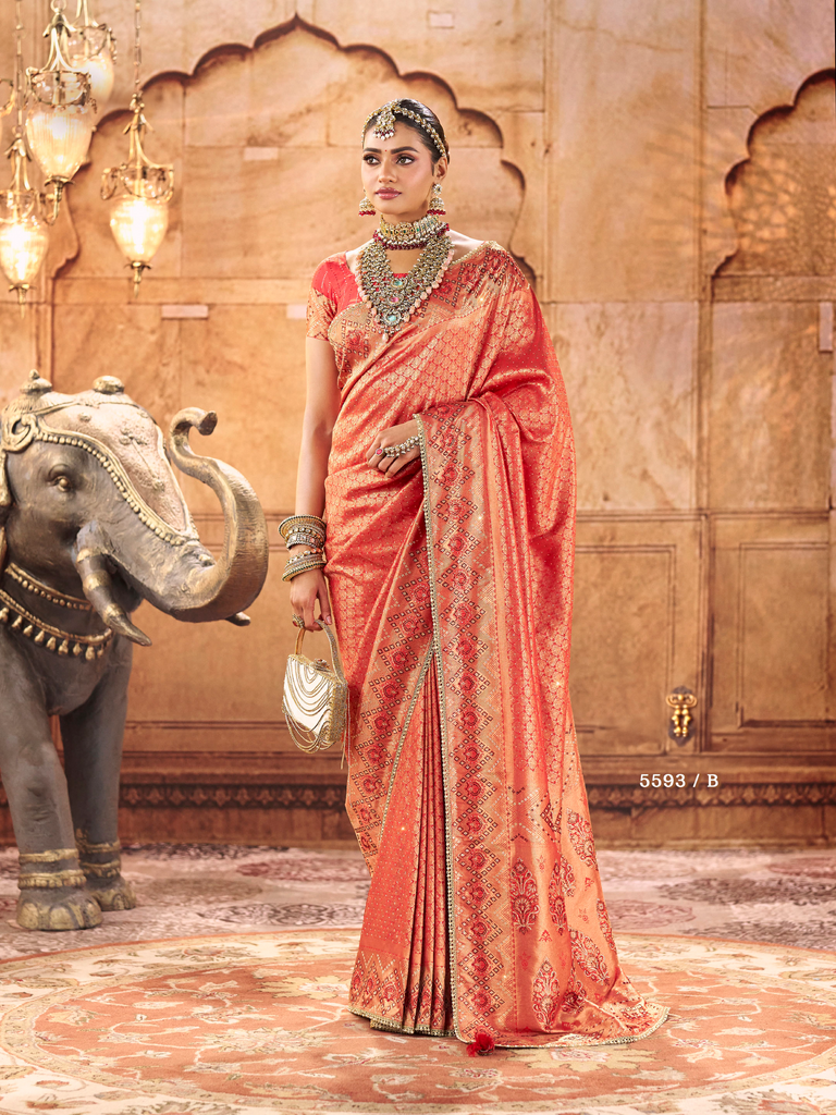 Elevate your ethnic wardrobe with this exquisite satin saree, meticulously crafted with delicate diamond work and intricate small butti patterns. The lustrous satin fabric drapes beautifully, offering a sophisticated sheen that catches light gracefully. Featuring the timeless gonda saree style, this piece seamlessly blends traditional craftsmanship with refined elegance. Perfect for weddings, festivals, and special occasions, the intricate embellishments showcase expert artistry while the premium fabric ensures comfort and durability. A versatile investment piece that transcends seasons and celebrations.