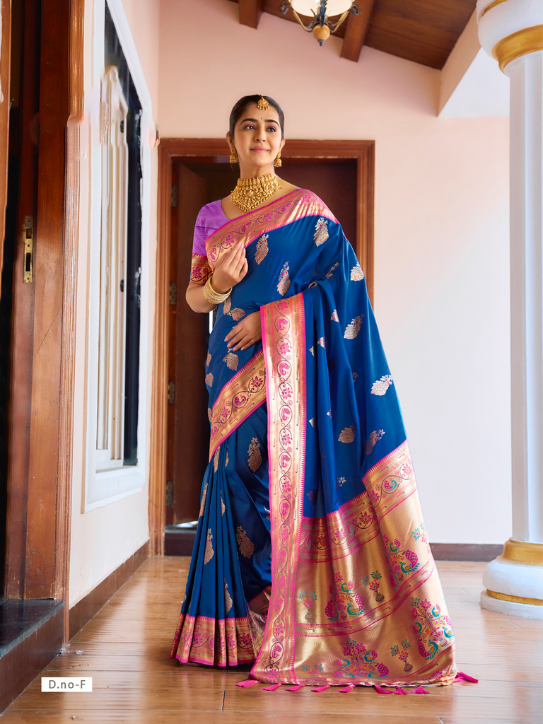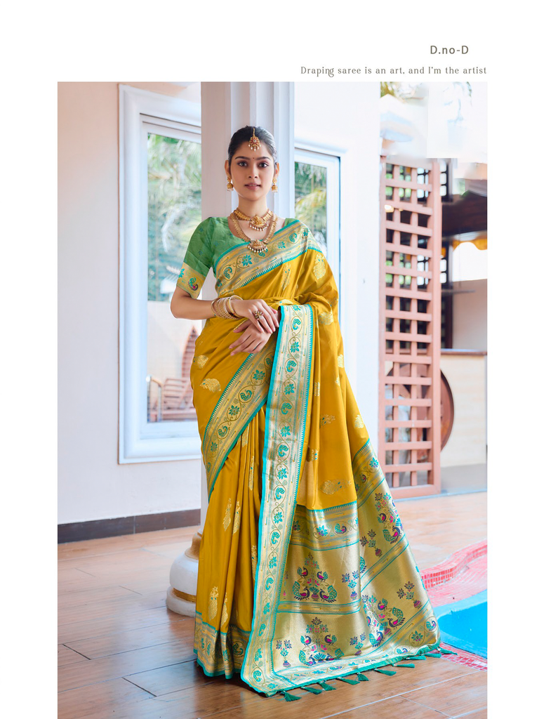 The Classic Muniya Grace saree embodies the timeless elegance of Paithani craftsmanship. This exquisite handwoven silk saree features the signature Muniya border, adorned with delicate parrot motifs that symbolize prosperity and tradition.
