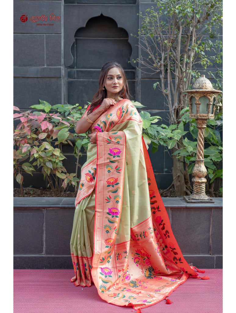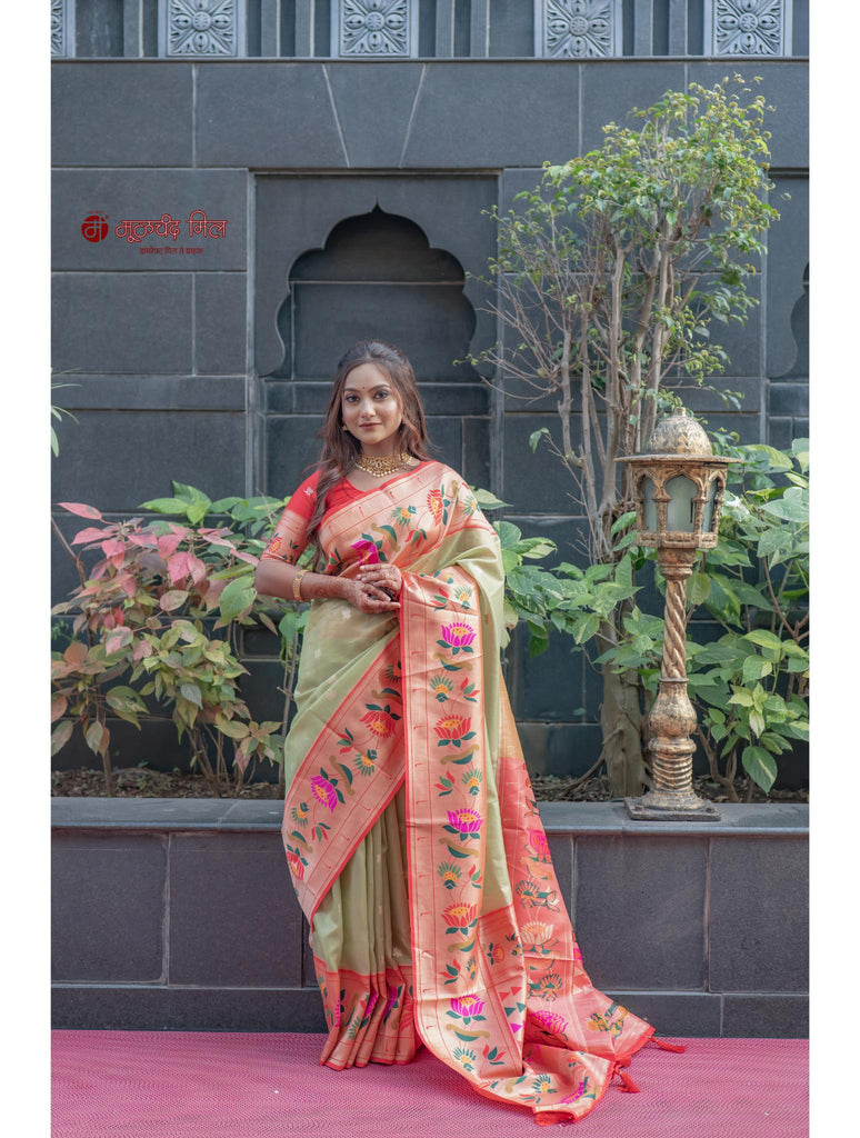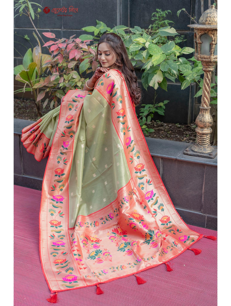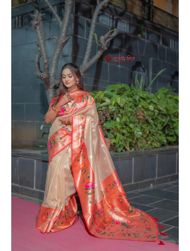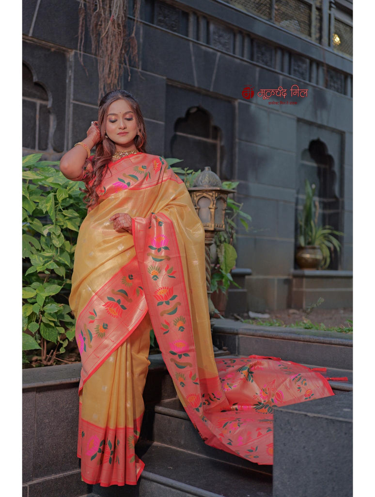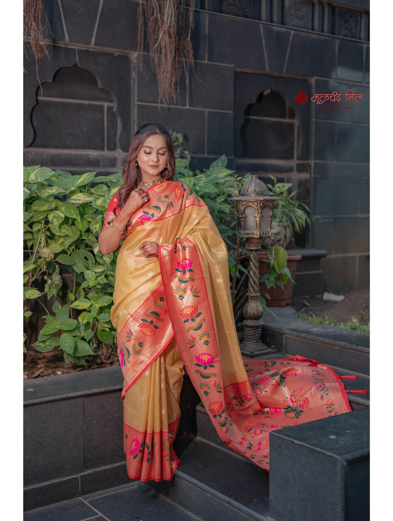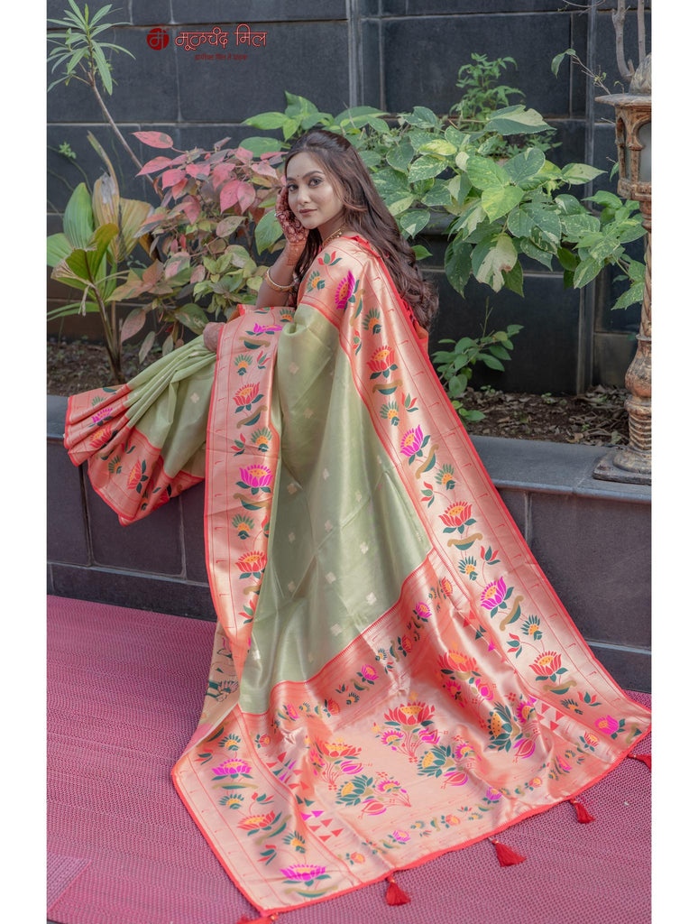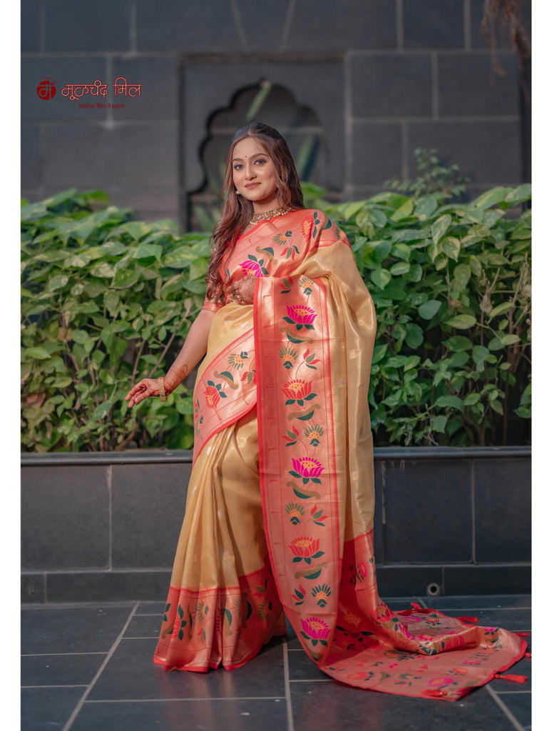 Elevate your gifting with this exquisite tissue paithani silk saree, a masterpiece of traditional Indian craftsmanship. Woven from premium silk blended with delicate tissue, this saree showcases the iconic paithani motifs—intricate peacocks, flowers, and geometric patterns rendered in lustrous gold zari. The lightweight tissue composition ensures effortless draping and breathable comfort, while the rich silk base provides an elegant sheen. Perfect for weddings, festivals, and special occasions, this heirloom-quality piece combines heritage artistry with refined sophistication. An investment in timeless elegance that transcends seasons and trends.