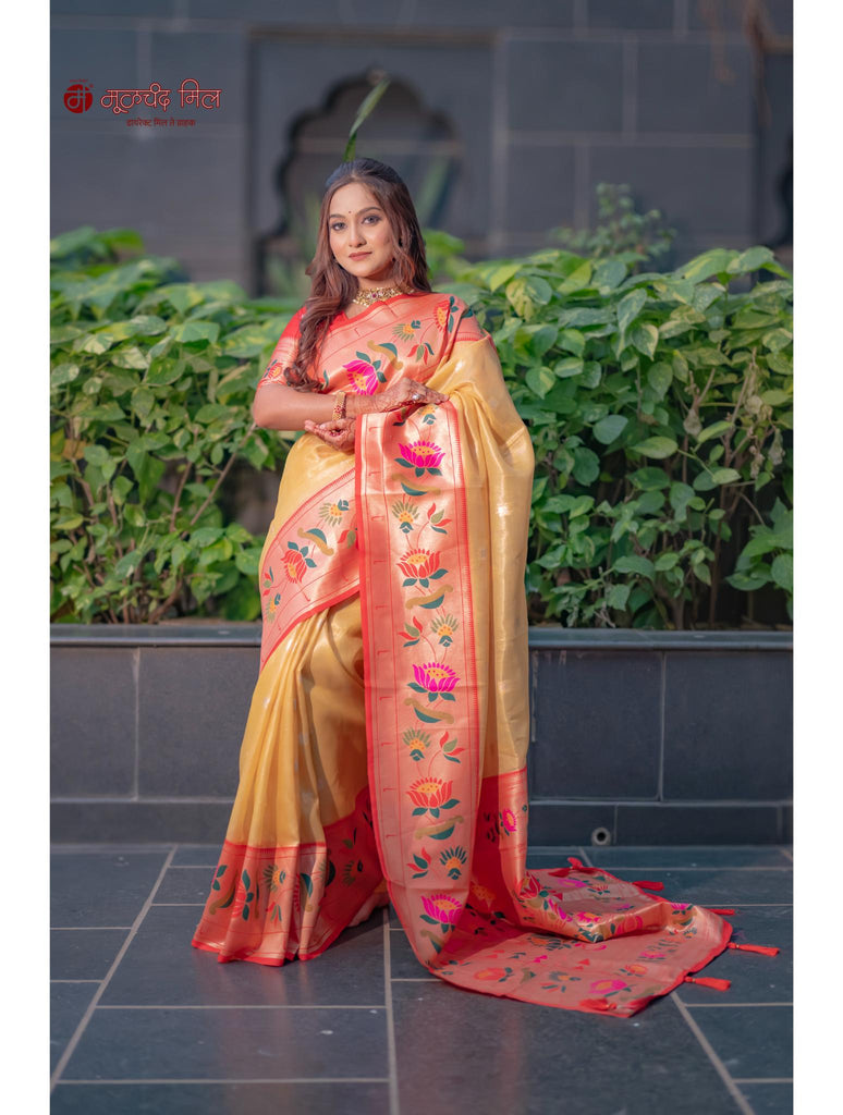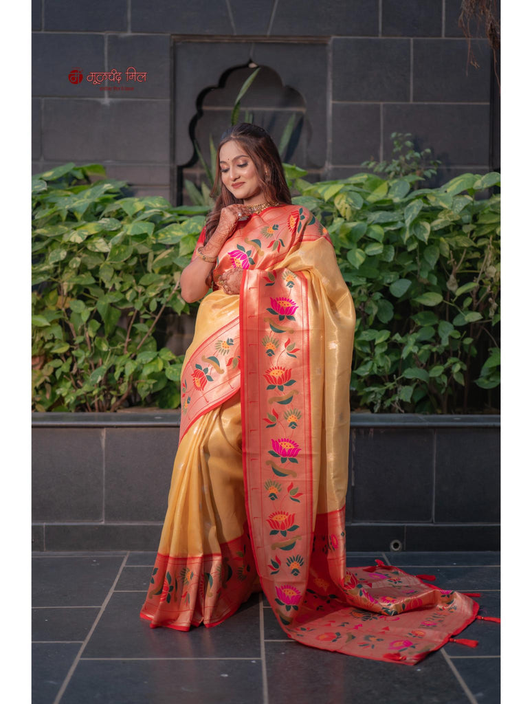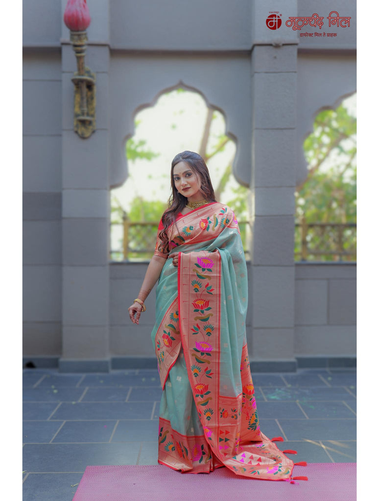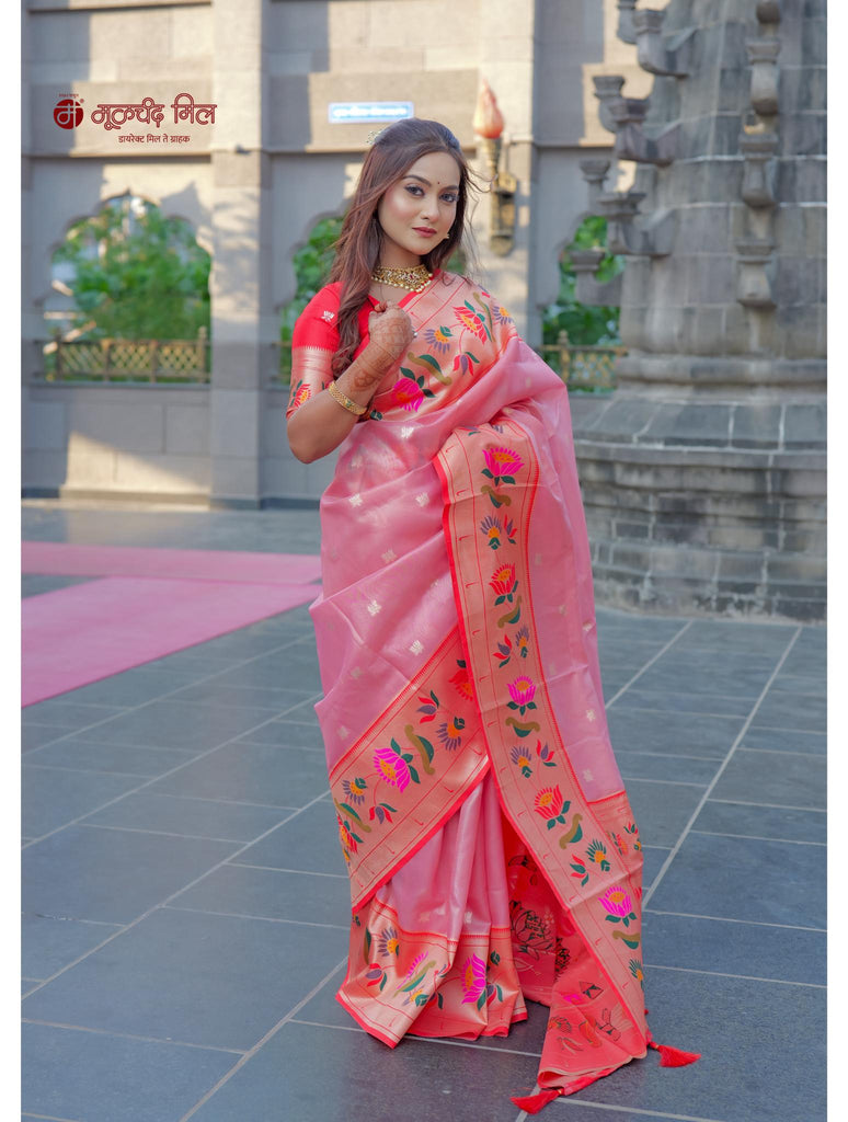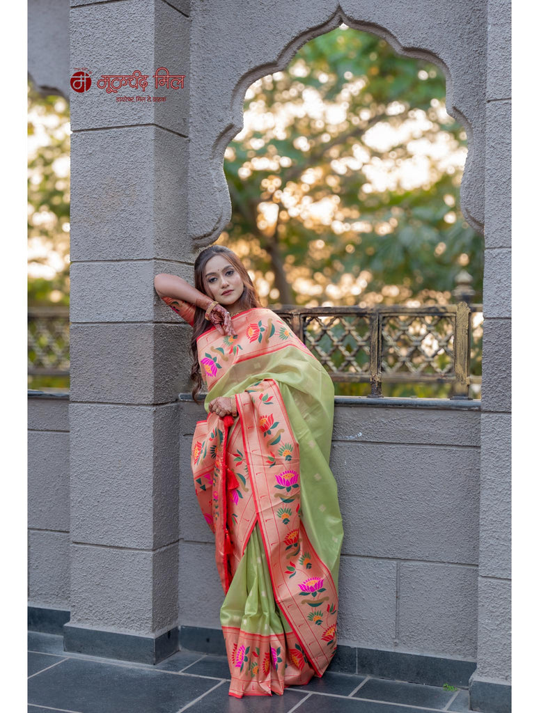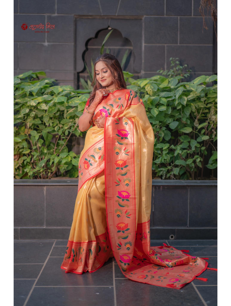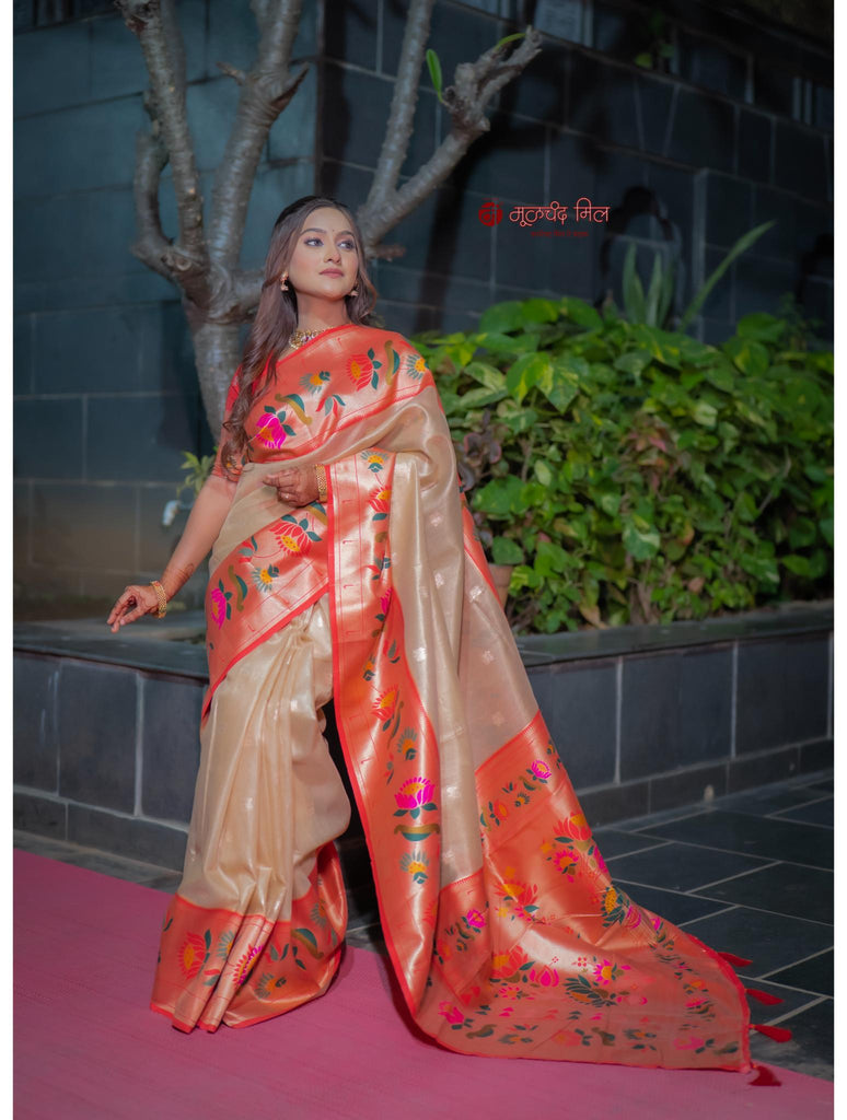 Elevate your gifting with this exquisite tissue paithani silk saree, a masterpiece of traditional Indian craftsmanship. Woven from premium silk blended with delicate tissue, this saree showcases the iconic paithani motifs—intricate peacocks, flowers, and geometric patterns rendered in lustrous gold zari. The lightweight tissue composition ensures effortless draping and breathable comfort, while the rich silk base provides an elegant sheen. Perfect for weddings, festivals, and special occasions, this heirloom-quality piece combines heritage artistry with refined sophistication. An investment in timeless elegance that transcends seasons and trends.
