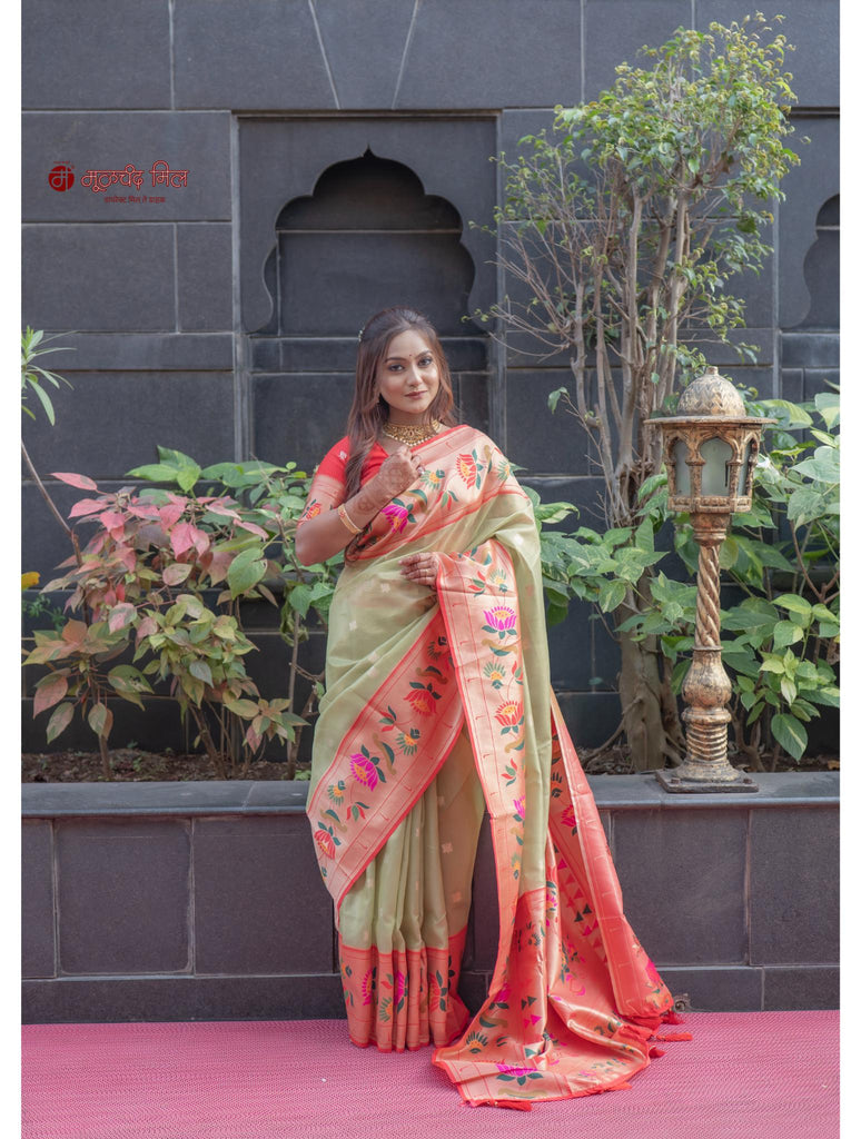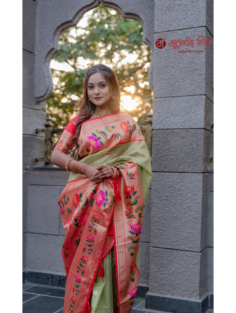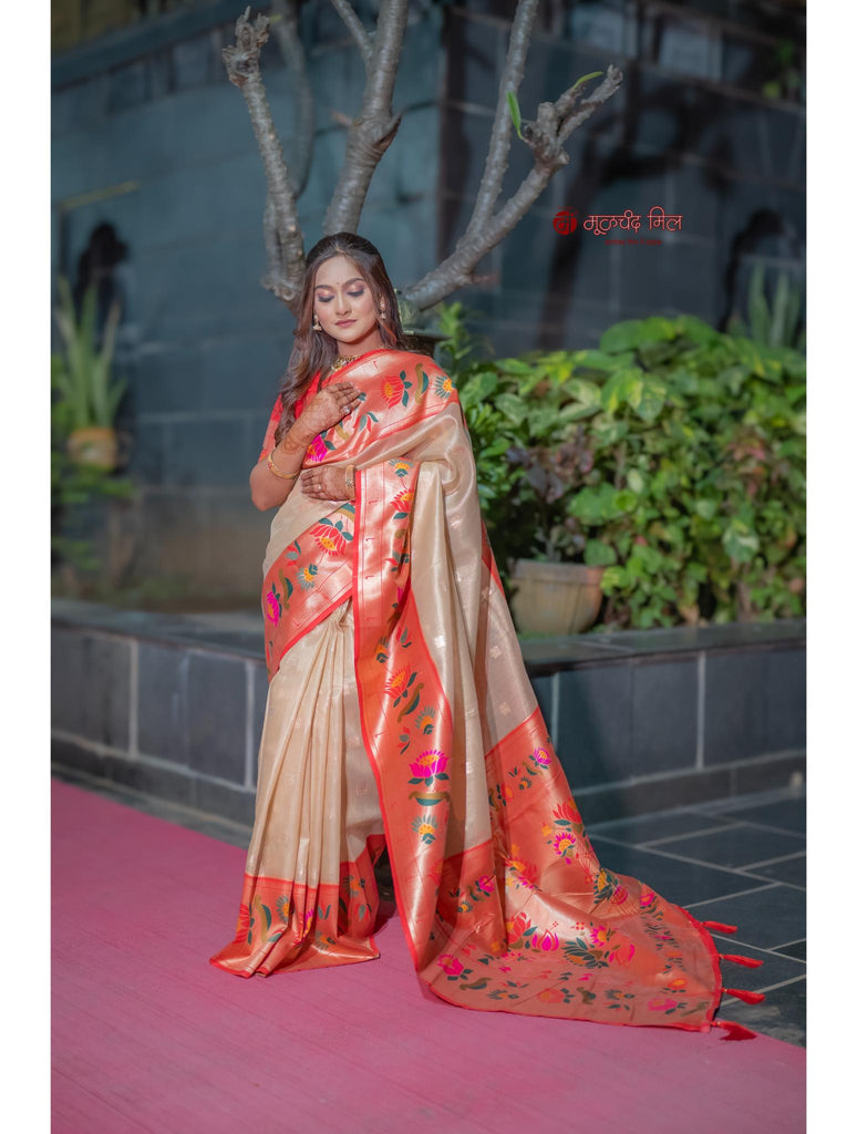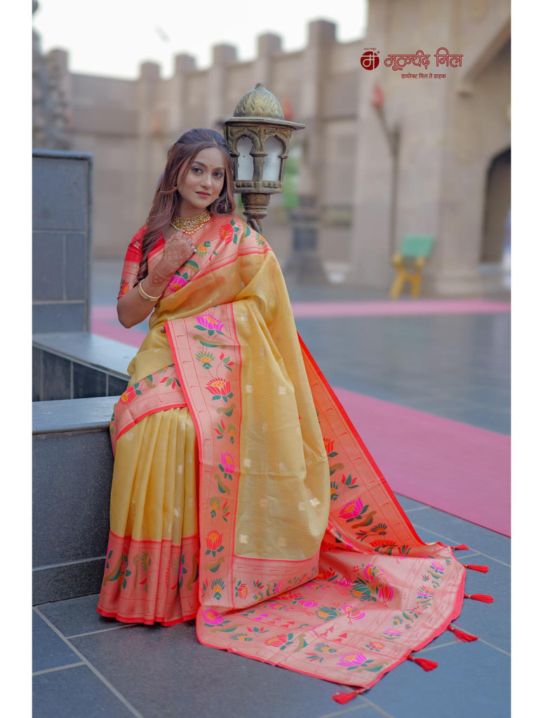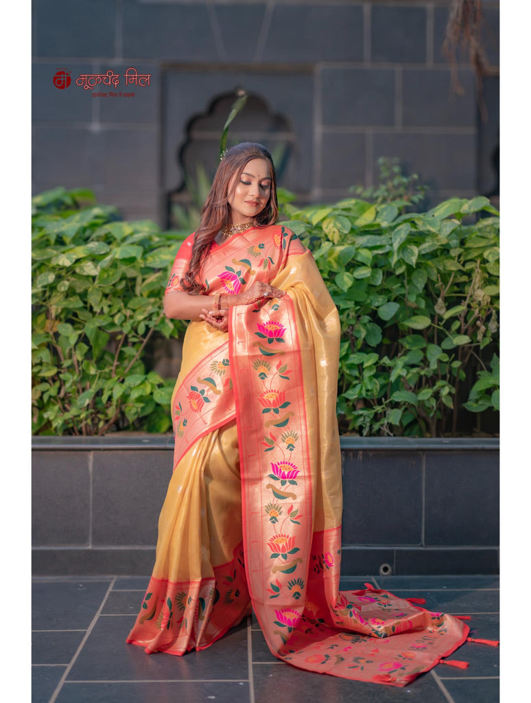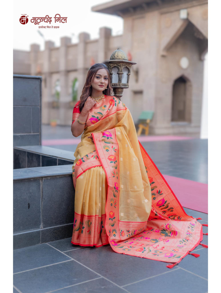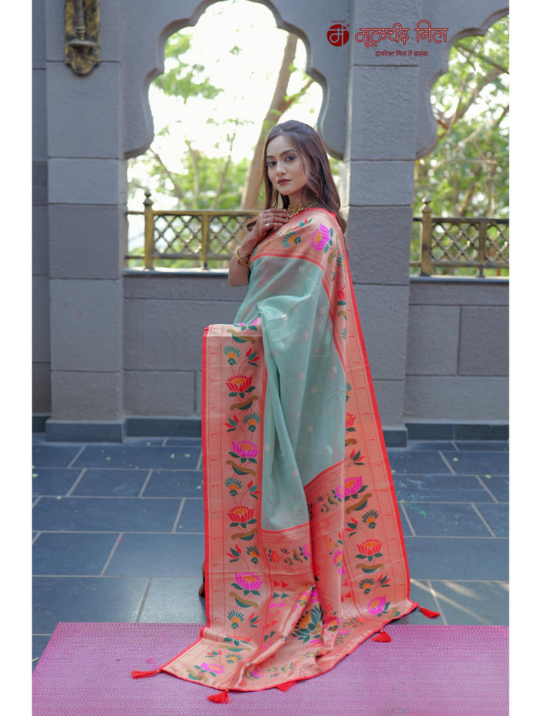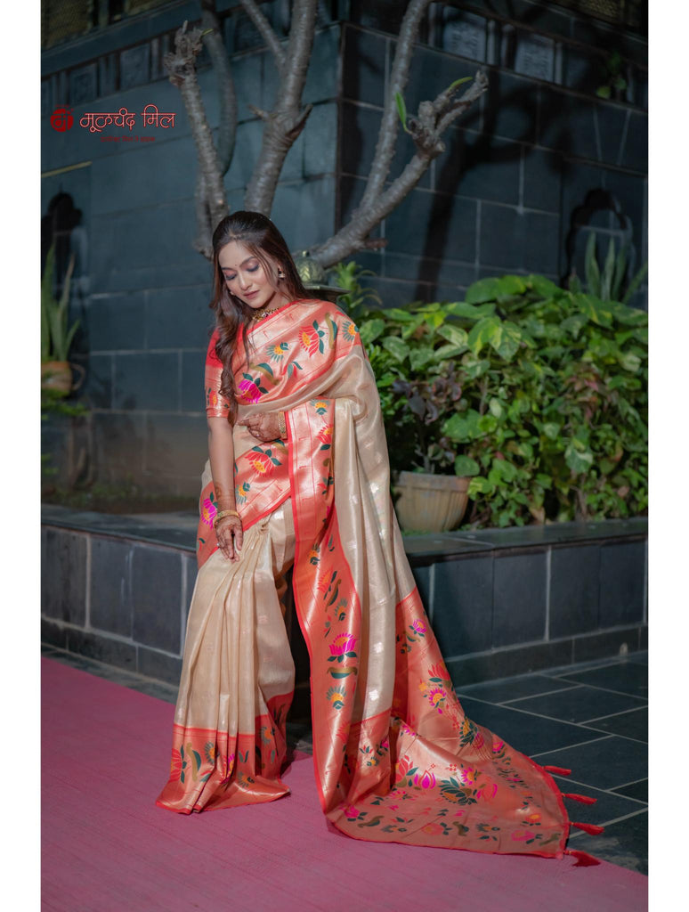 Elevate your gifting with this exquisite tissue paithani silk saree, a masterpiece of traditional Indian craftsmanship. Woven from premium silk blended with delicate tissue, this saree showcases the iconic paithani motifs—intricate peacocks, flowers, and geometric patterns rendered in lustrous gold zari. The lightweight tissue composition ensures effortless draping and breathable comfort, while the rich silk base provides an elegant sheen. Perfect for weddings, festivals, and special occasions, this heirloom-quality piece combines heritage artistry with refined sophistication. An investment in timeless elegance that transcends seasons and trends.