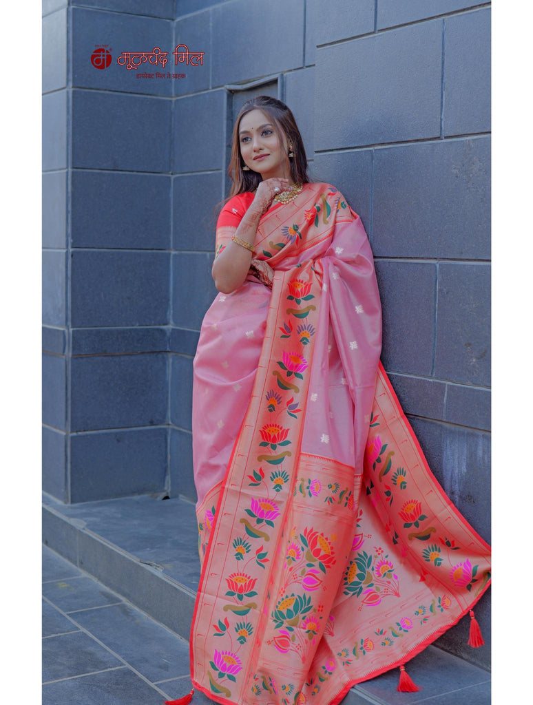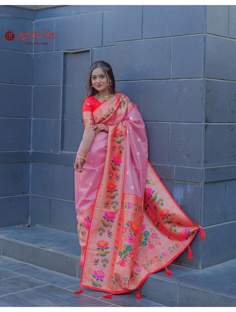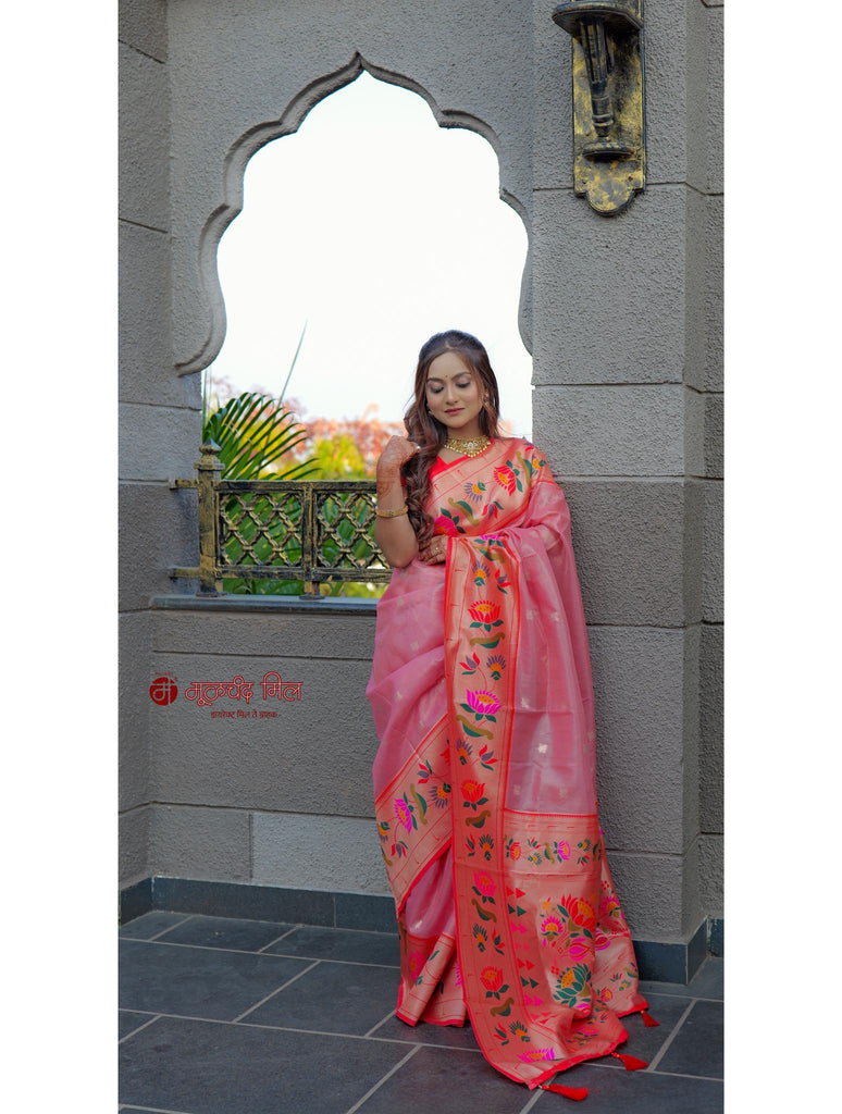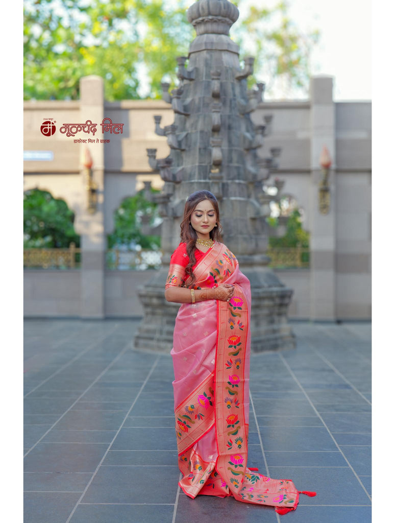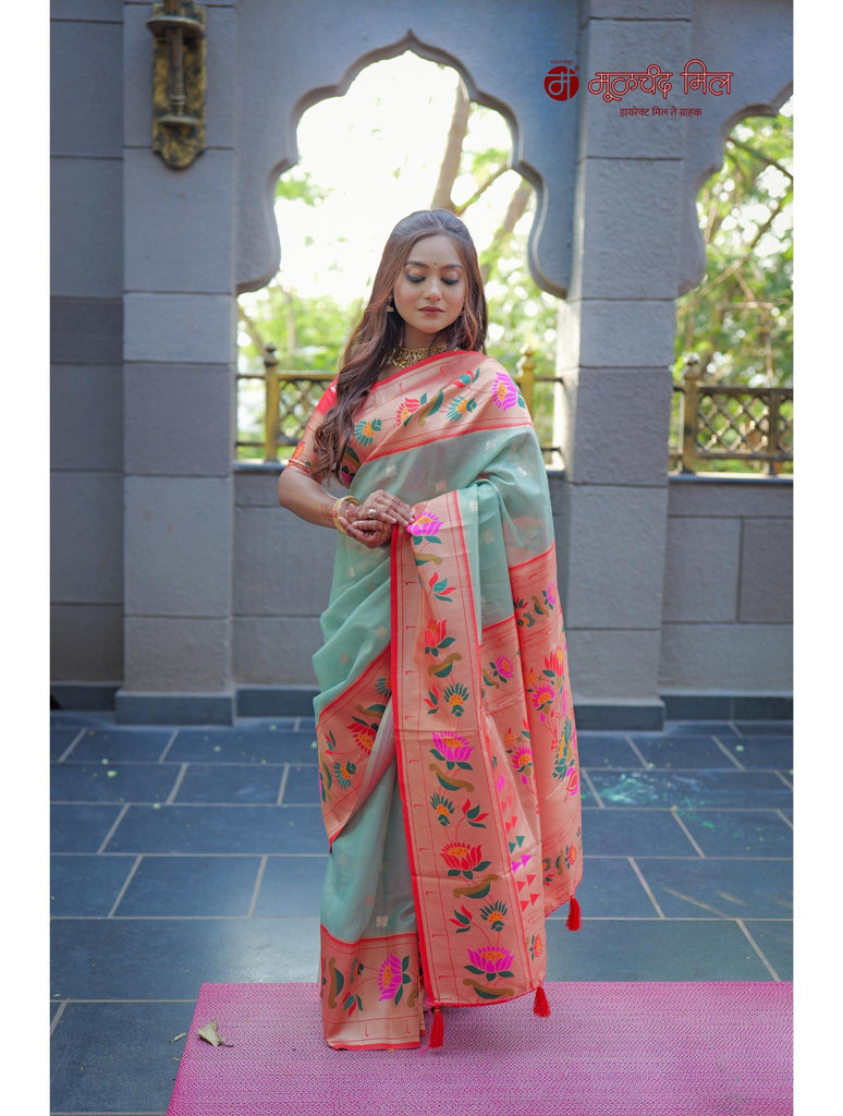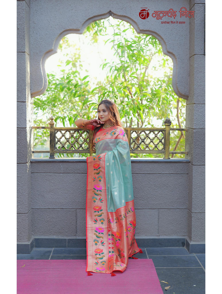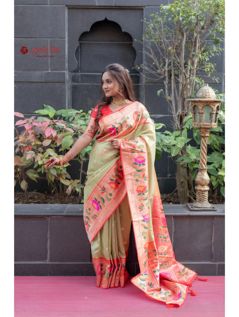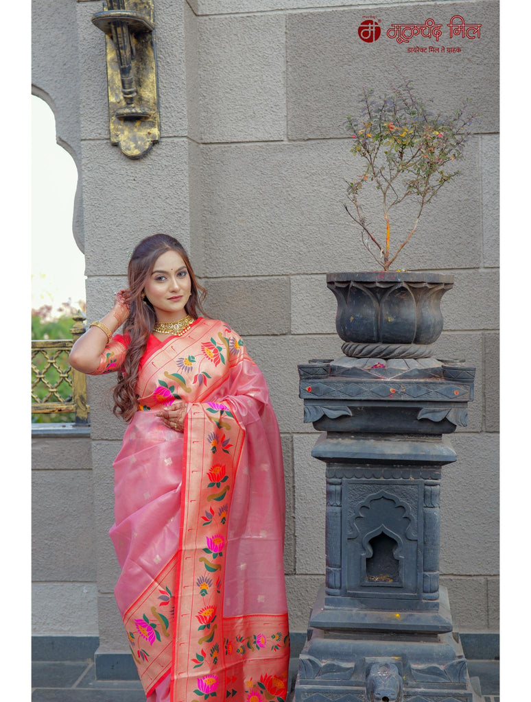 Elevate your gifting with this exquisite tissue paithani silk saree, a masterpiece of traditional Indian craftsmanship. Woven from premium silk blended with delicate tissue, this saree showcases the iconic paithani motifs—intricate peacocks, flowers, and geometric patterns rendered in lustrous gold zari. The lightweight tissue composition ensures effortless draping and breathable comfort, while the rich silk base provides an elegant sheen. Perfect for weddings, festivals, and special occasions, this heirloom-quality piece combines heritage artistry with refined sophistication. An investment in timeless elegance that transcends seasons and trends.