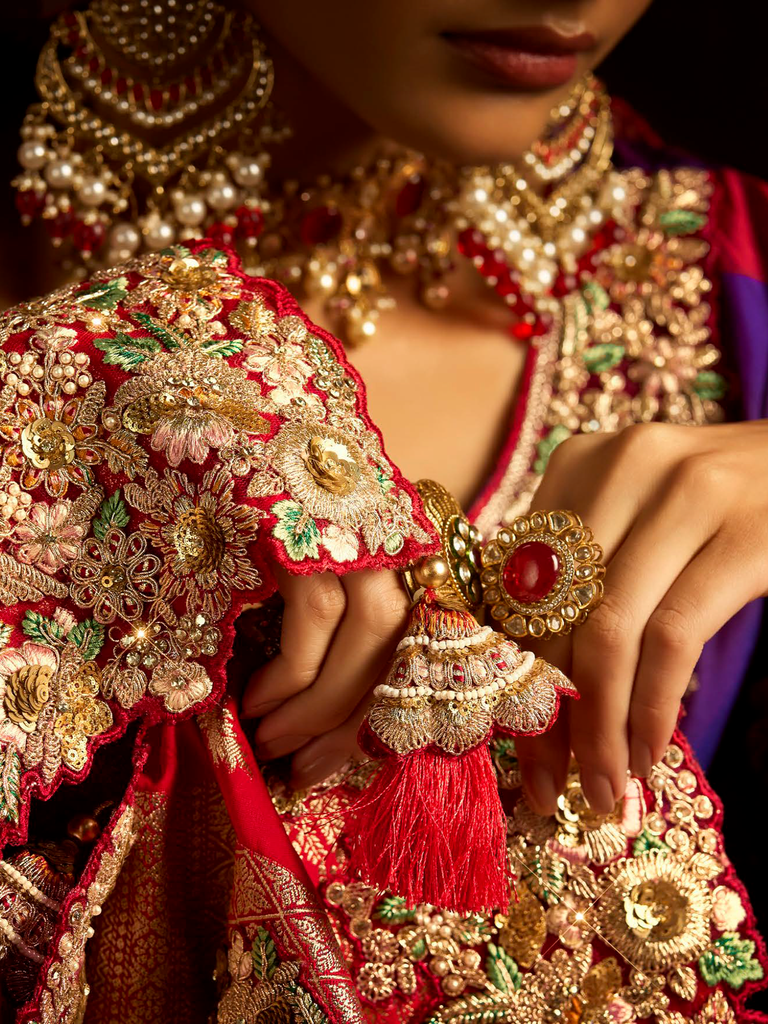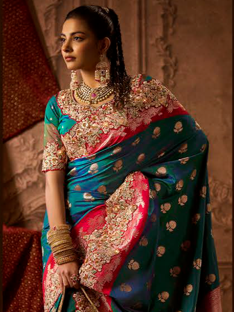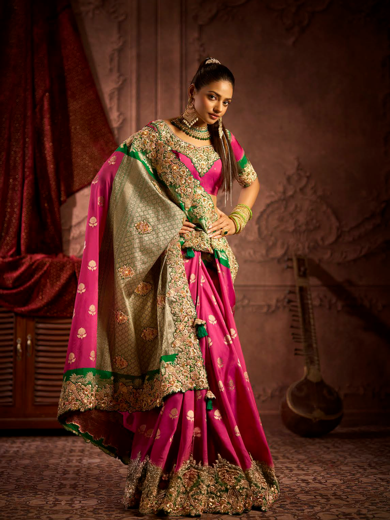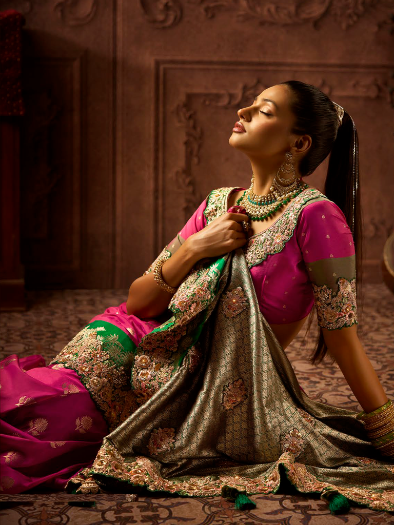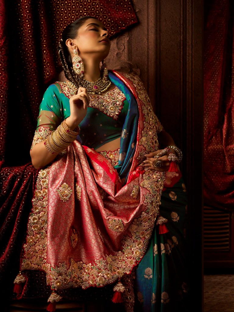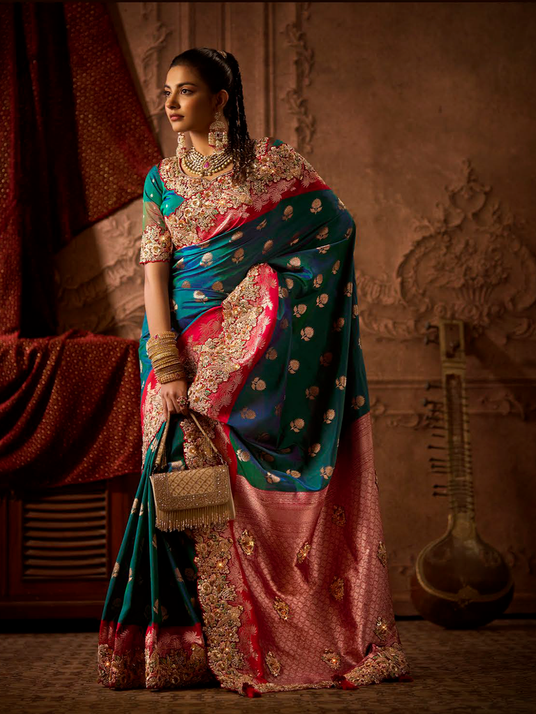 Celebrate your special day in timeless elegance with this exquisite bridal saree. Adorned with intricate embroidery borders that frame the fabric with refined detail, this piece showcases organic, earthy tones that complement every complexion. The carefully curated color palette from soft ivories to warm golds and muted jewel hues—reflects traditional weaving heritage while maintaining contemporary sophistication. Perfect for the modern bride seeking authentic craftsmanship without compromising on style, this wedding wrap combines the artistry of skilled artisans with the comfort of natural fibers. An heirloom-worthy investment for your most cherished moments.