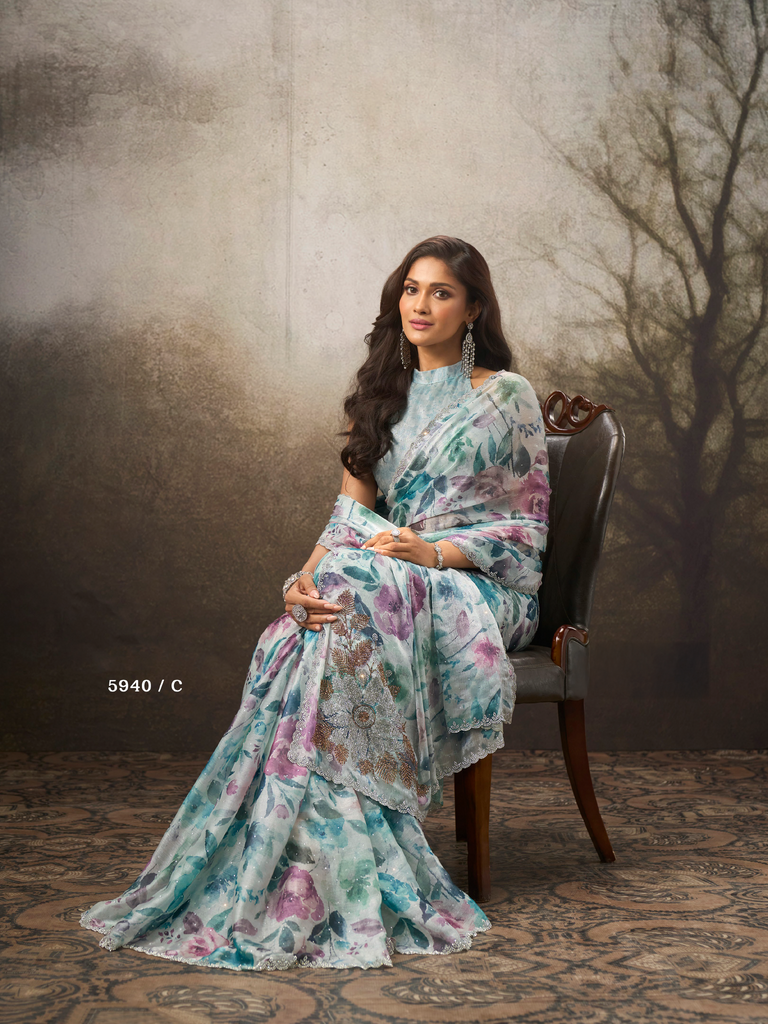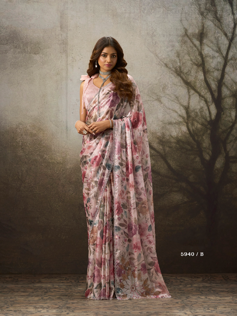 Elevate your party wardrobe with this exquisite satin designer silk saree, featuring an ornate diamond lace border that catches light beautifully. The lustrous satin finish drapes elegantly while the metallic embellishments add sophisticated glamour to any occasion. Perfect for weddings, celebrations, and formal events, this saree combines traditional craftsmanship with contemporary design. The premium silk fabric ensures comfort and breathability, while the intricate lace detailing showcases refined artistry. A timeless investment piece that transitions seamlessly from festive gatherings to special occasions.