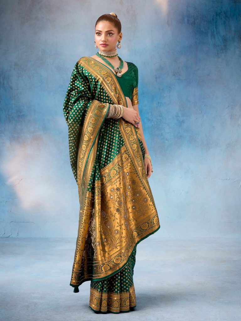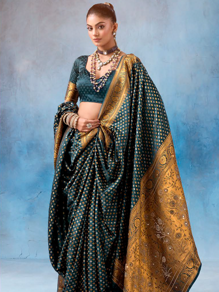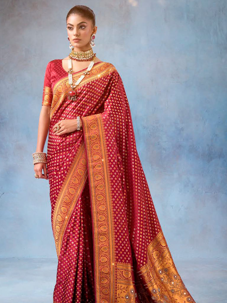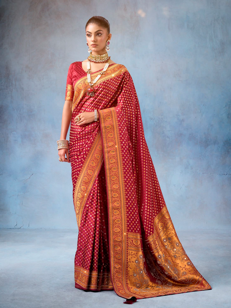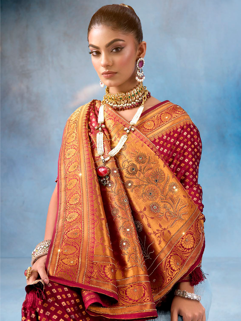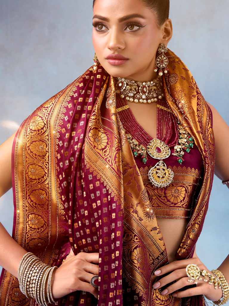Royal Jari Kathpadar Elegance Elevate your traditional wardrobe with this exquisite Kathpadar saree, where royal craftsmanship meets timeless elegance. Adorned with intricate jari work that catches light with every movement, this piece showcases the meticulous artistry of master weavers. The rich color palette and detailed border design reflect premium quality and authentic heritage weaving techniques. Perfect for weddings, festivals, and formal occasions, this saree drapes beautifully while maintaining its structured silhouette. A statement piece that celebrates Indian textile tradition with contemporary grace.